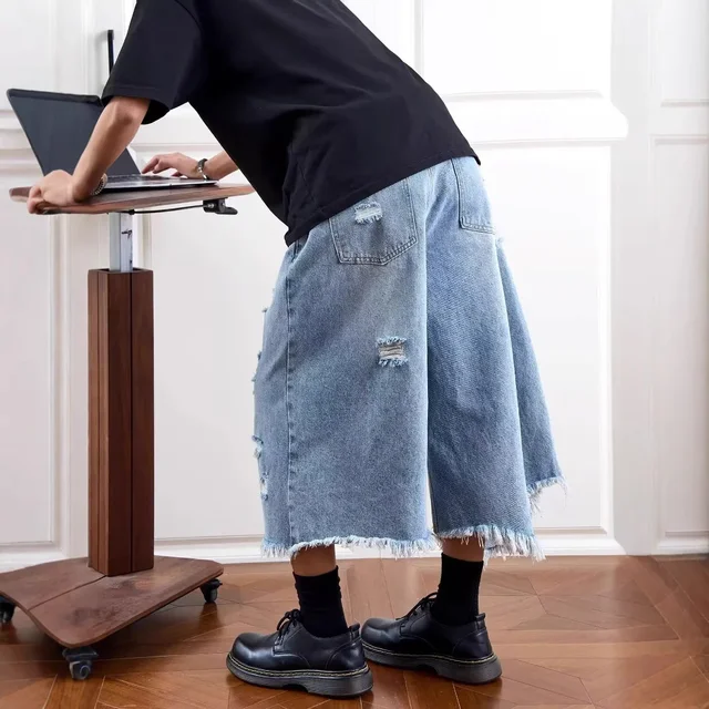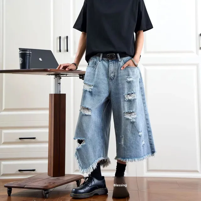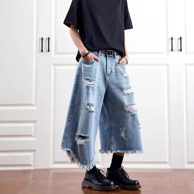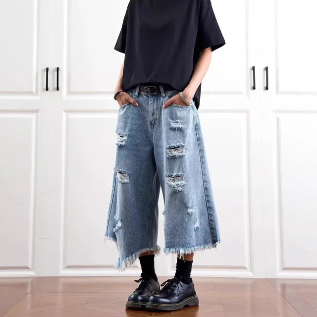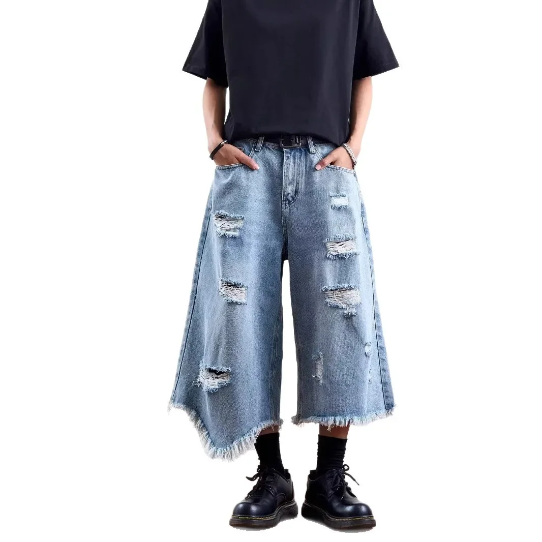 Washed Denim Short Pants Men's Loose Straight Leg Five-Quarter Vintage Summer Jeans Casual Comfortable Breathable Male Model