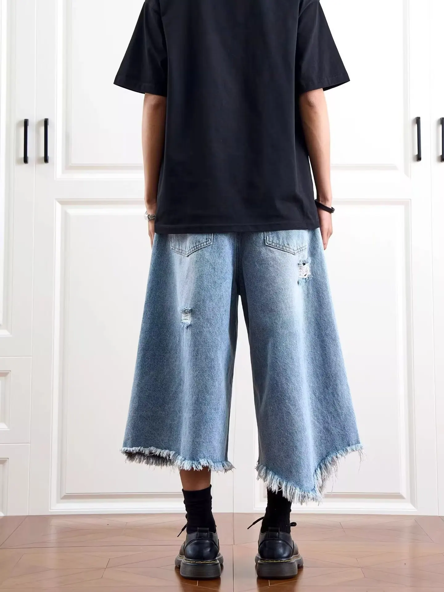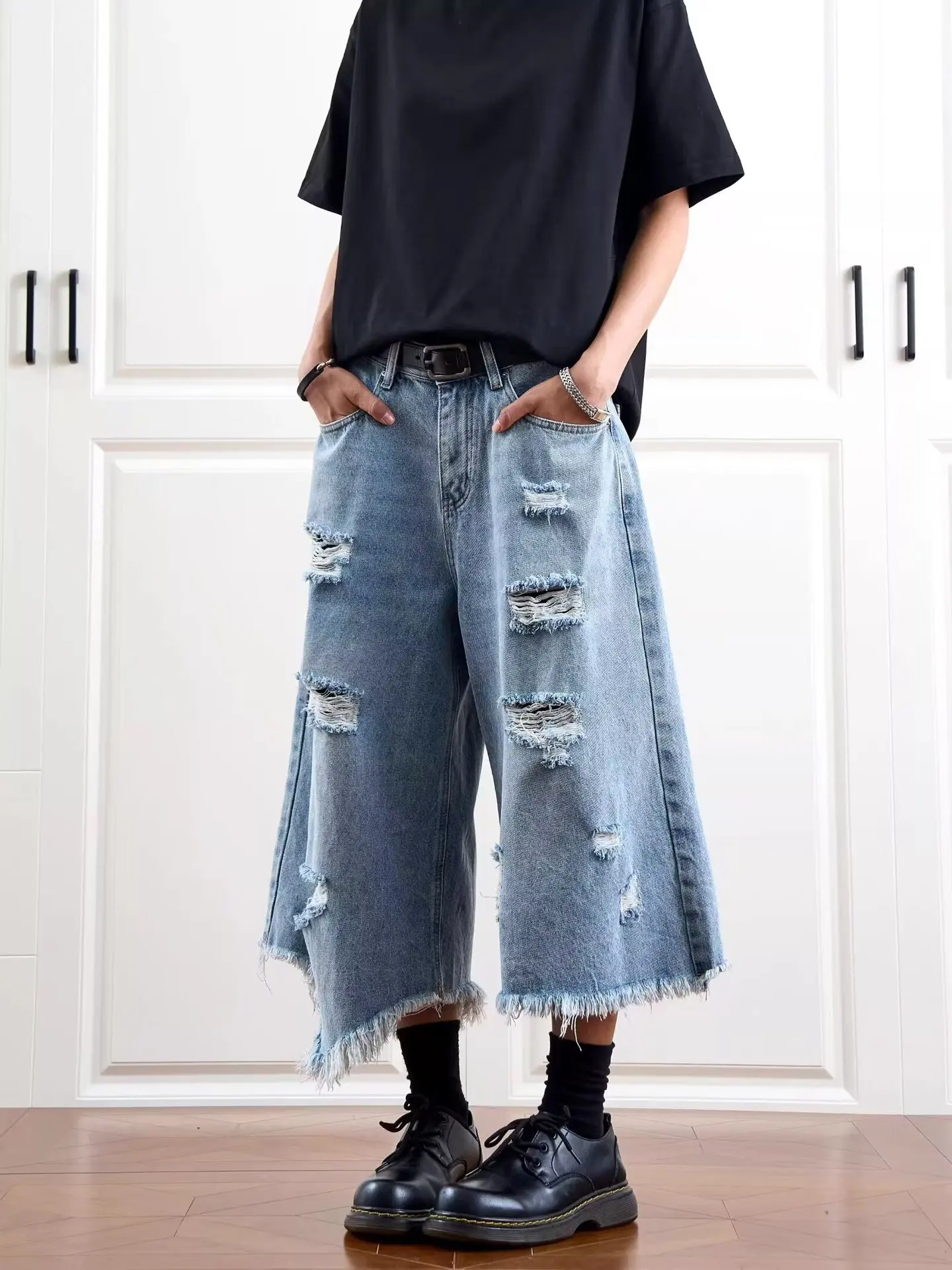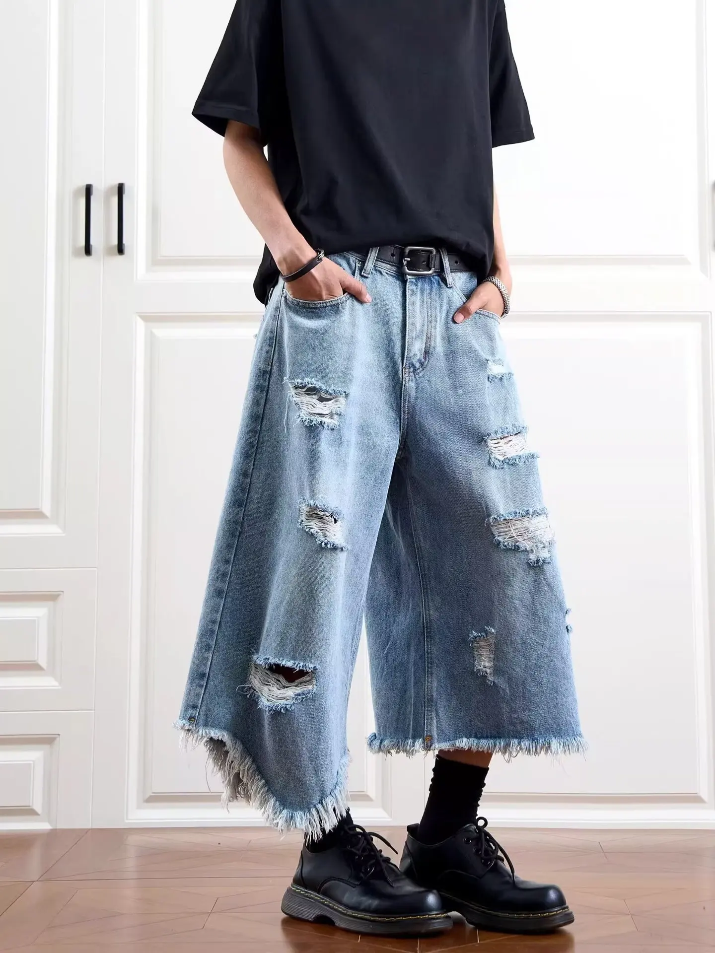 Washed Denim Short Pants Men's Loose Straight Leg Five-Quarter Vintage Summer Jeans Casual Comfortable Breathable Male Model