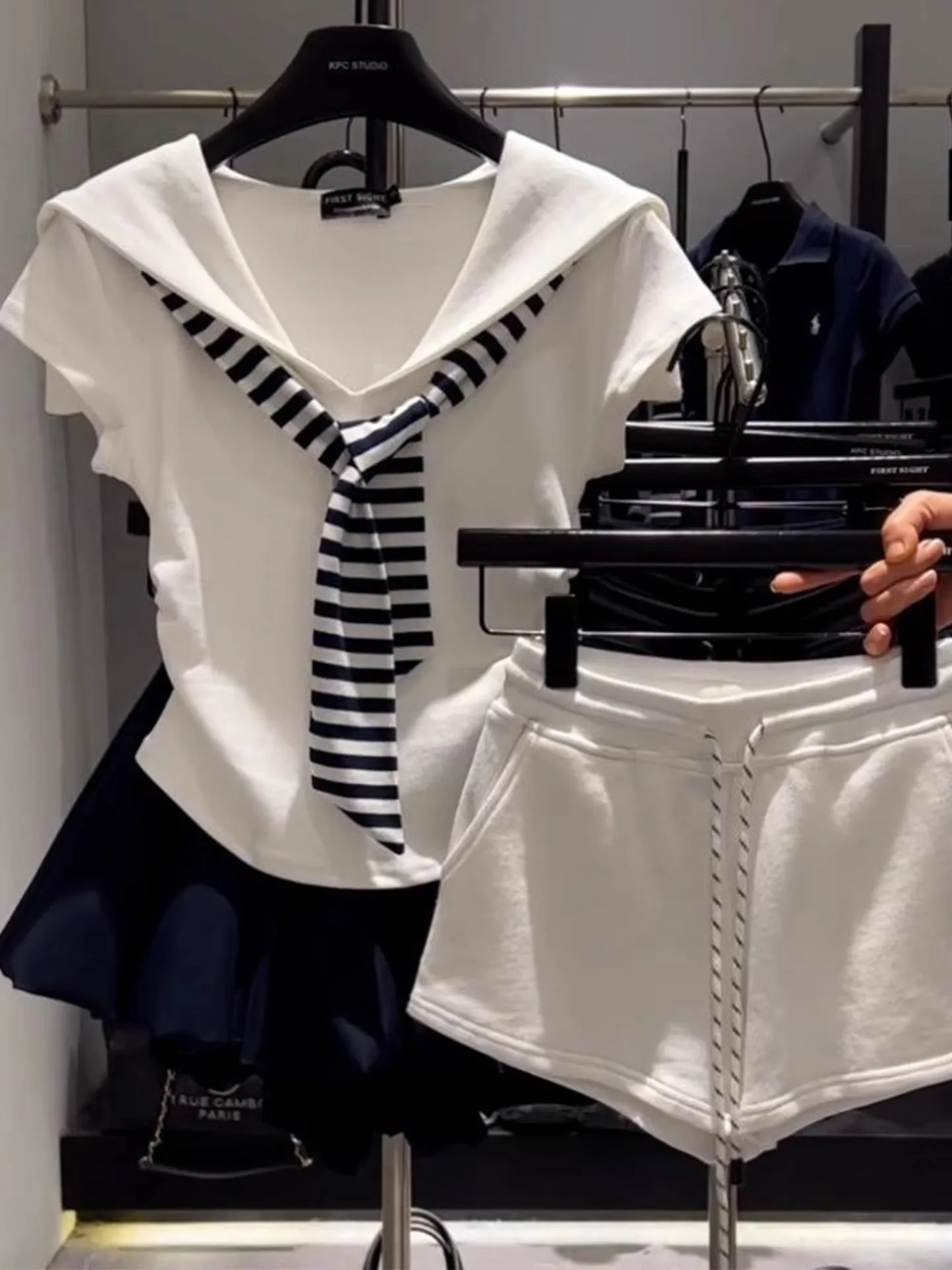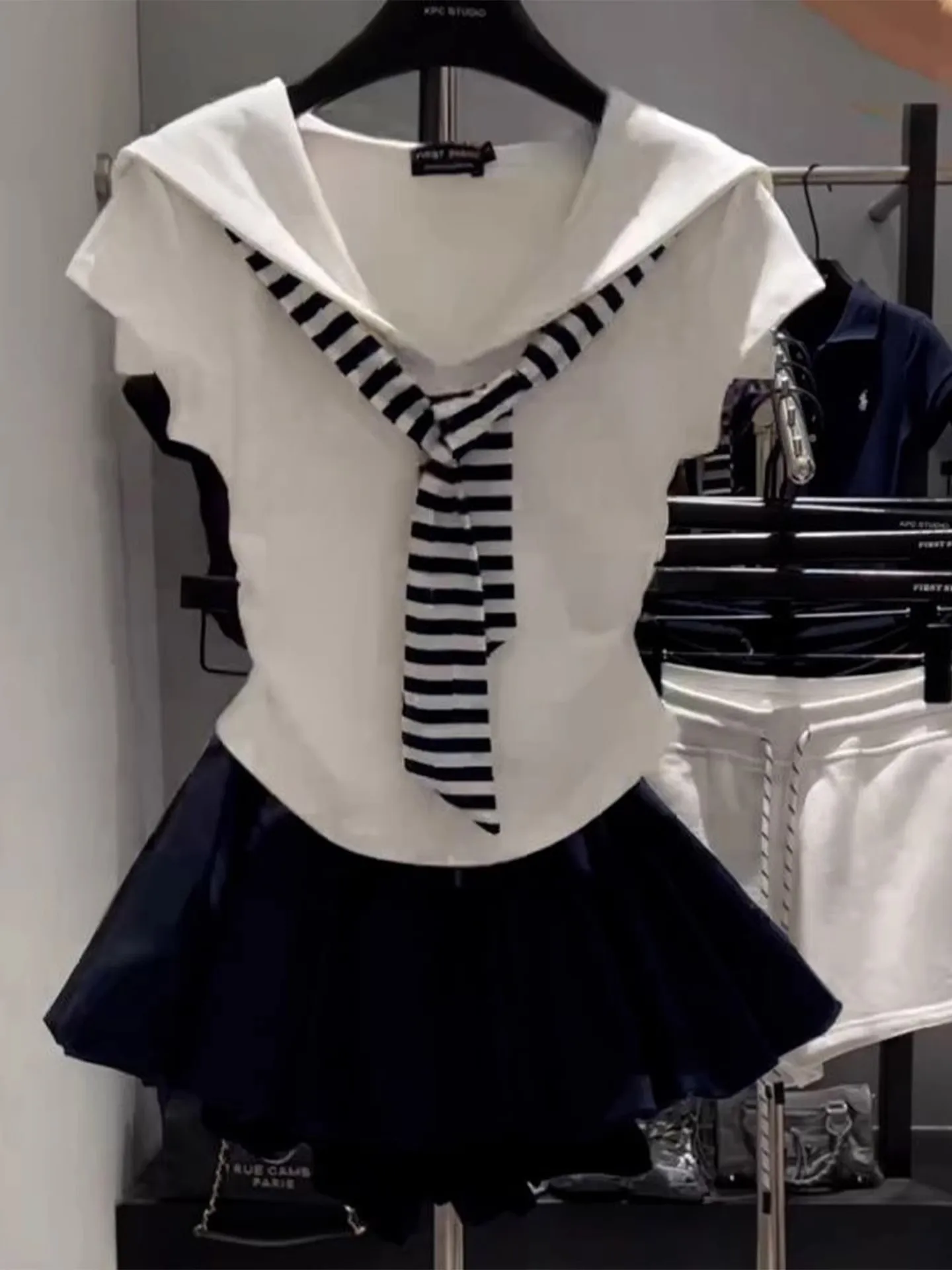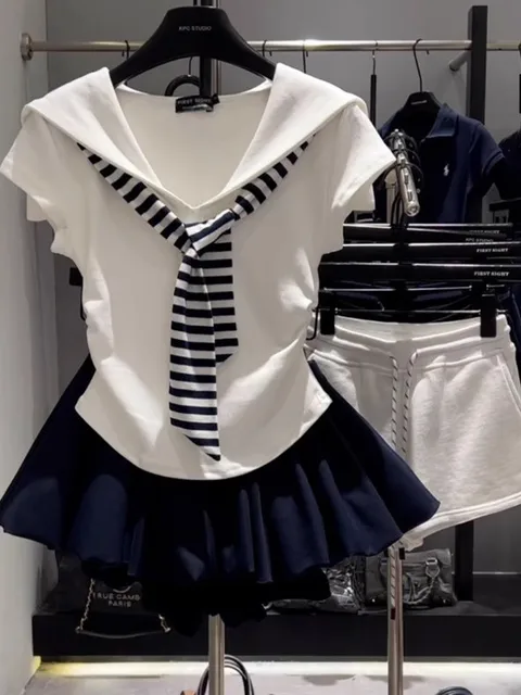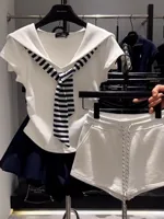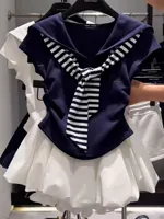 This summer navy collar patchwork stripe faux two-piece short sleeve top features a versatile style, perfect for commuting or outdoor activities.