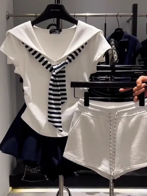 Summer Casual Navy Collar Patchwork Stripe ort Sve T-irt Women's Commute Sle Slim Fit Youthful Pattern Outdoor Wear