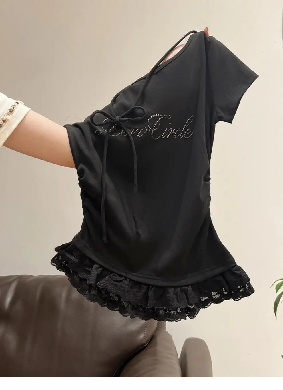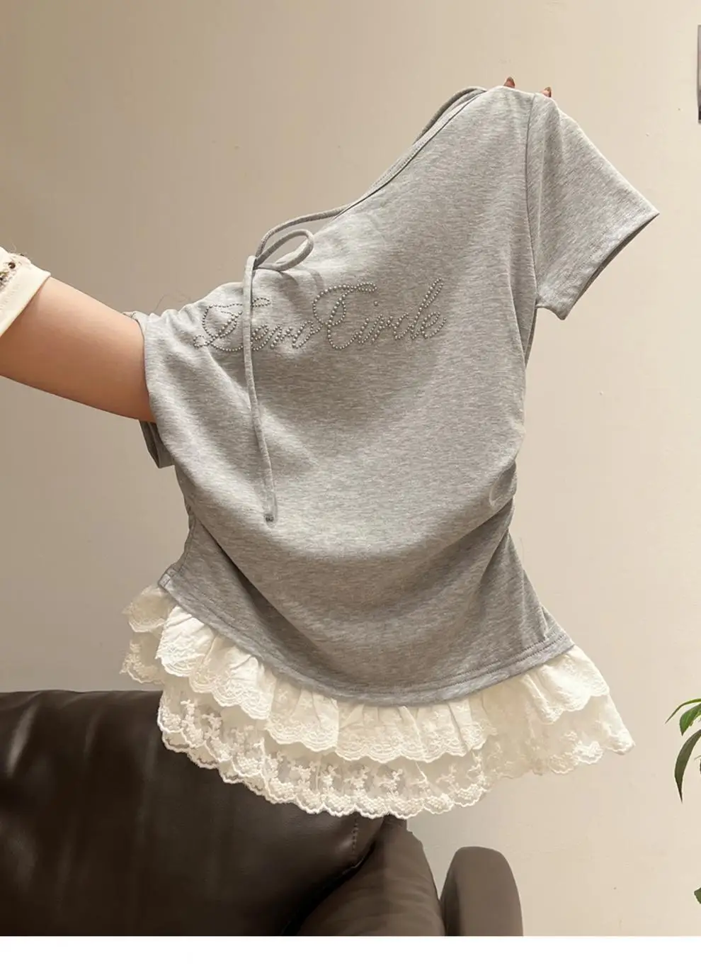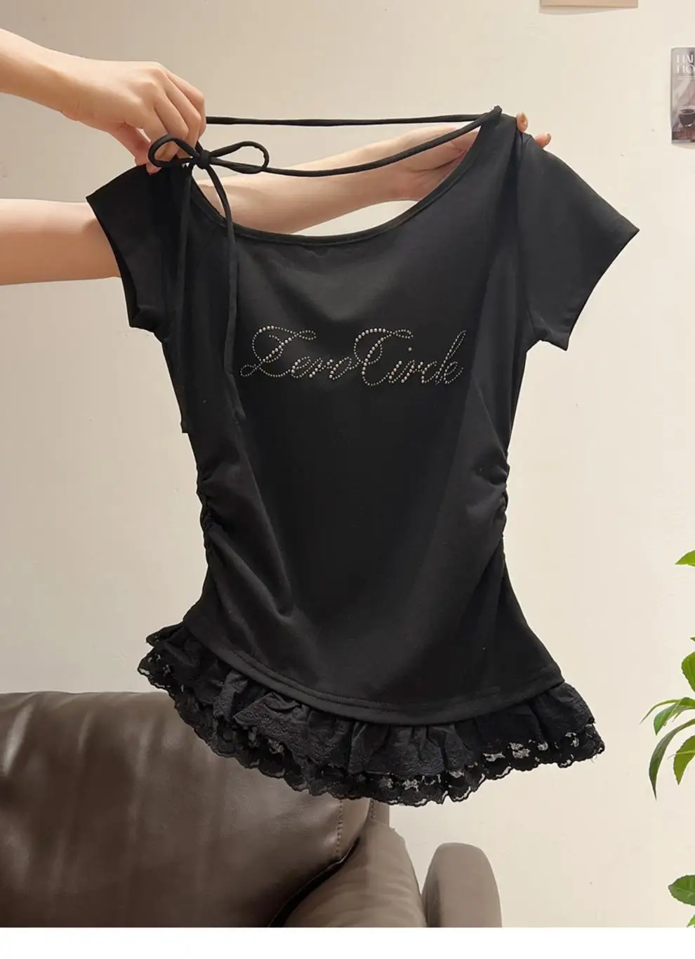 Featuring delicate lace trim at the hem, this T-shirt adds a touch of femininity and elegance to your outfit.