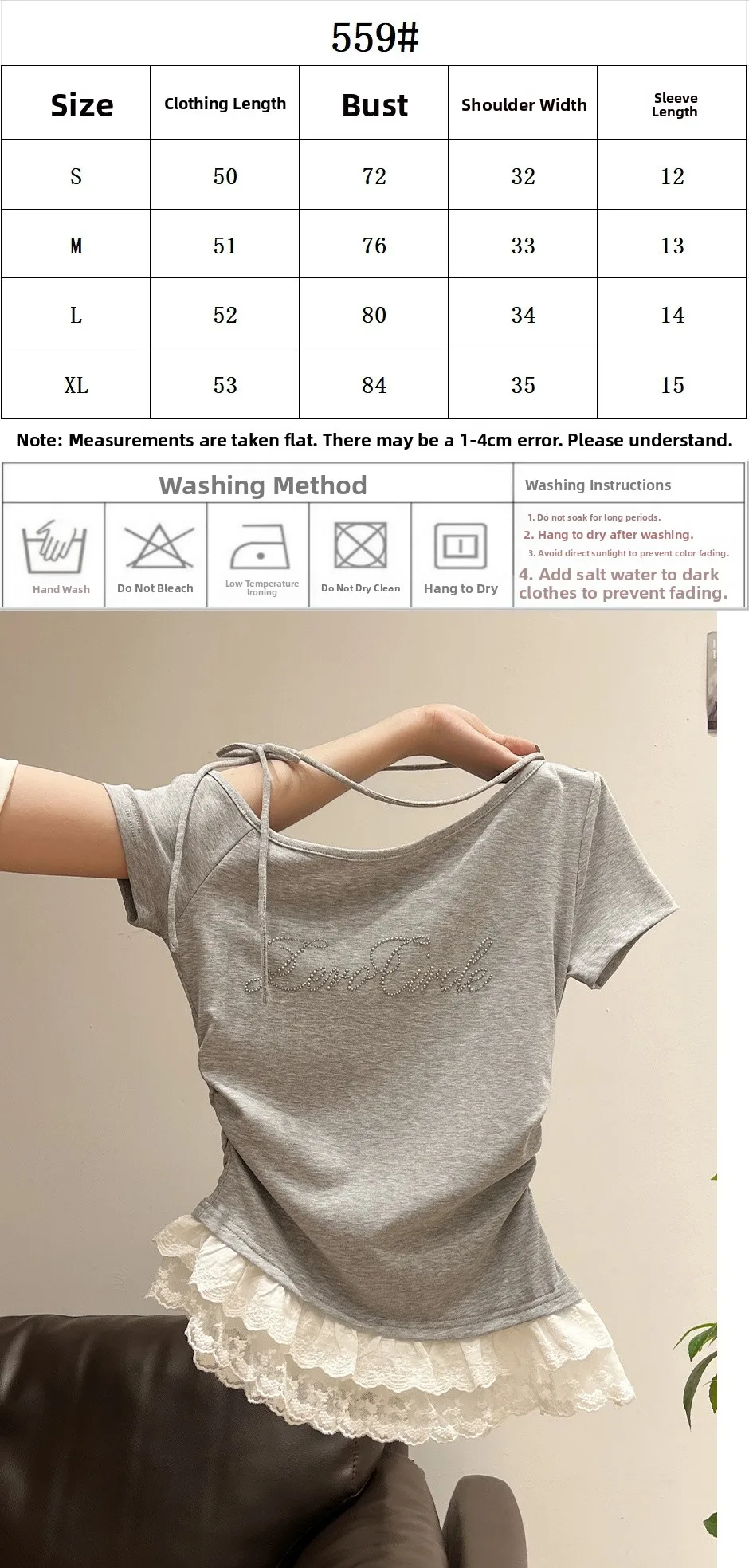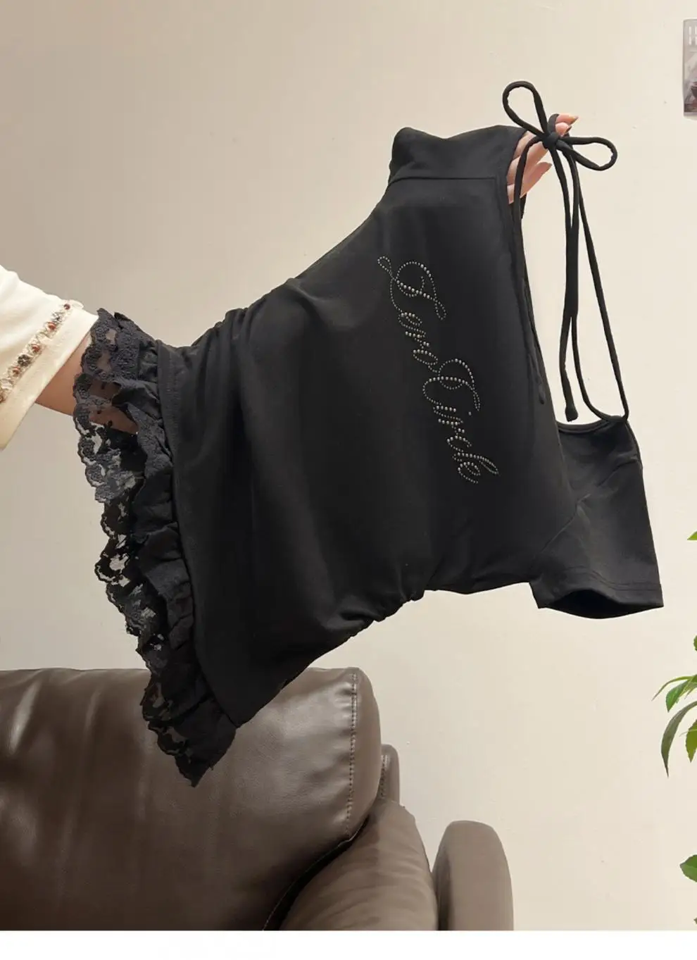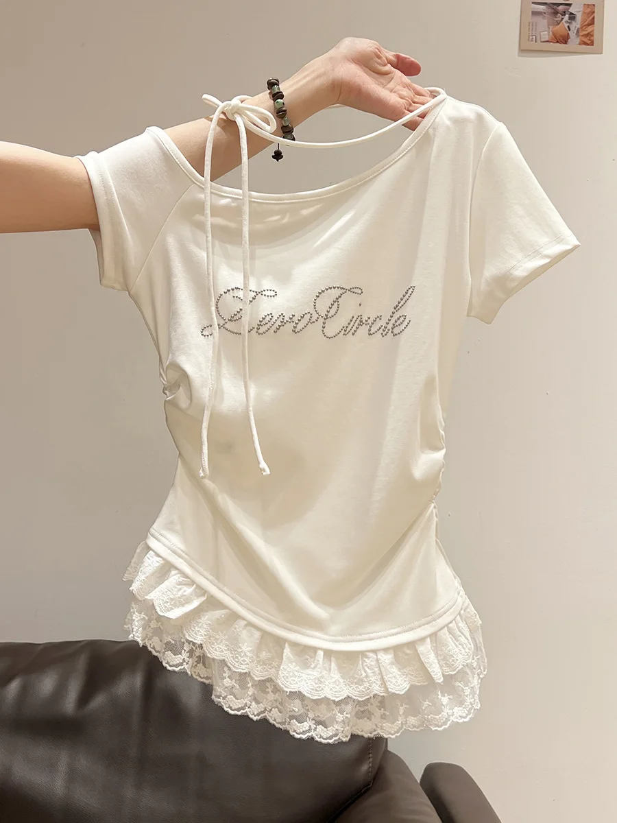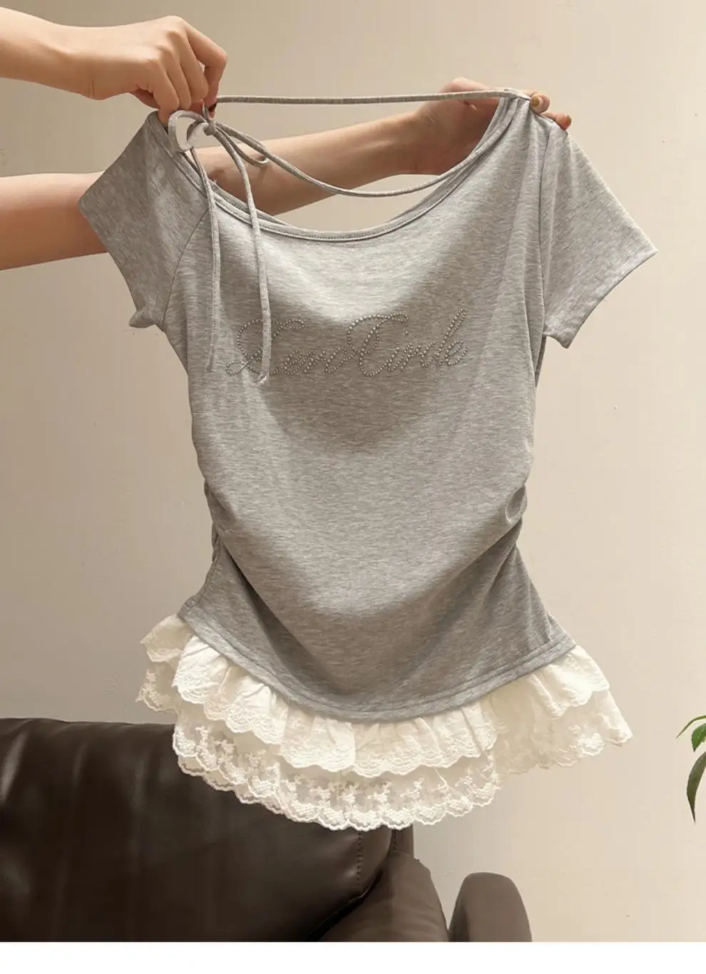 Featuring delicate lace trim at the hem, this T-shirt adds a touch of femininity and elegance to your outfit.