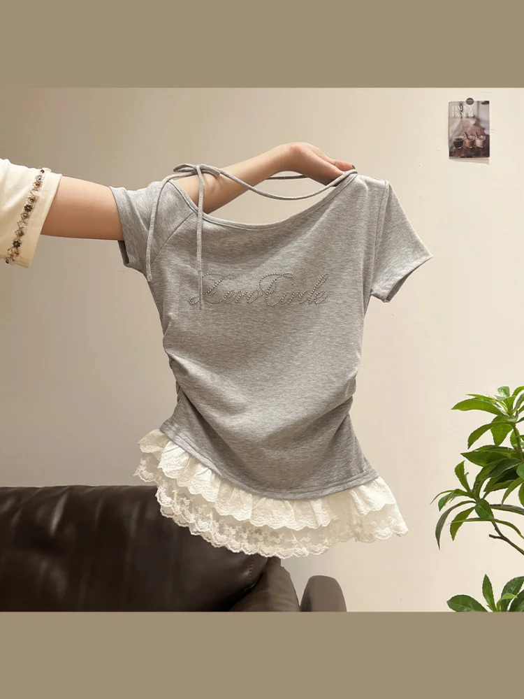 Featuring delicate lace trim at the hem, this T-shirt adds a touch of femininity and elegance to your outfit.