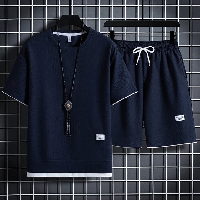 Summer Men’s Waffle Sets Casual T-Shirt And Shorts Set Male Sports Suit Solid Color Tracksuit Loose