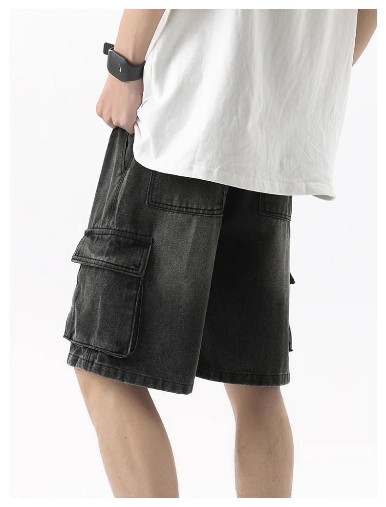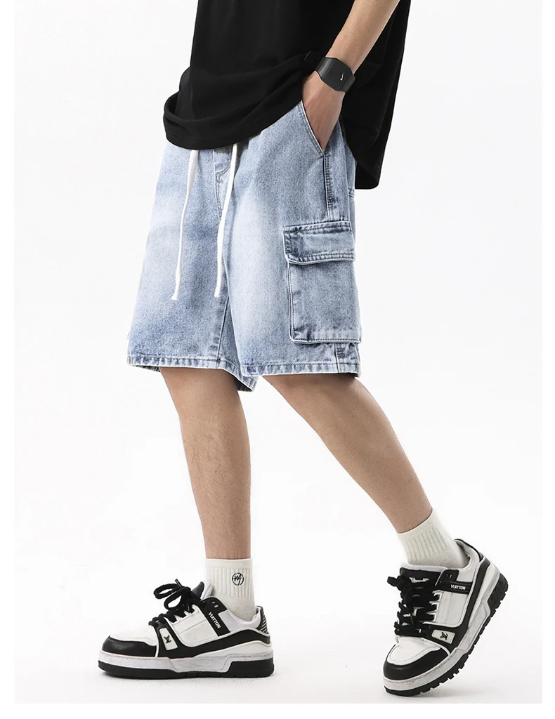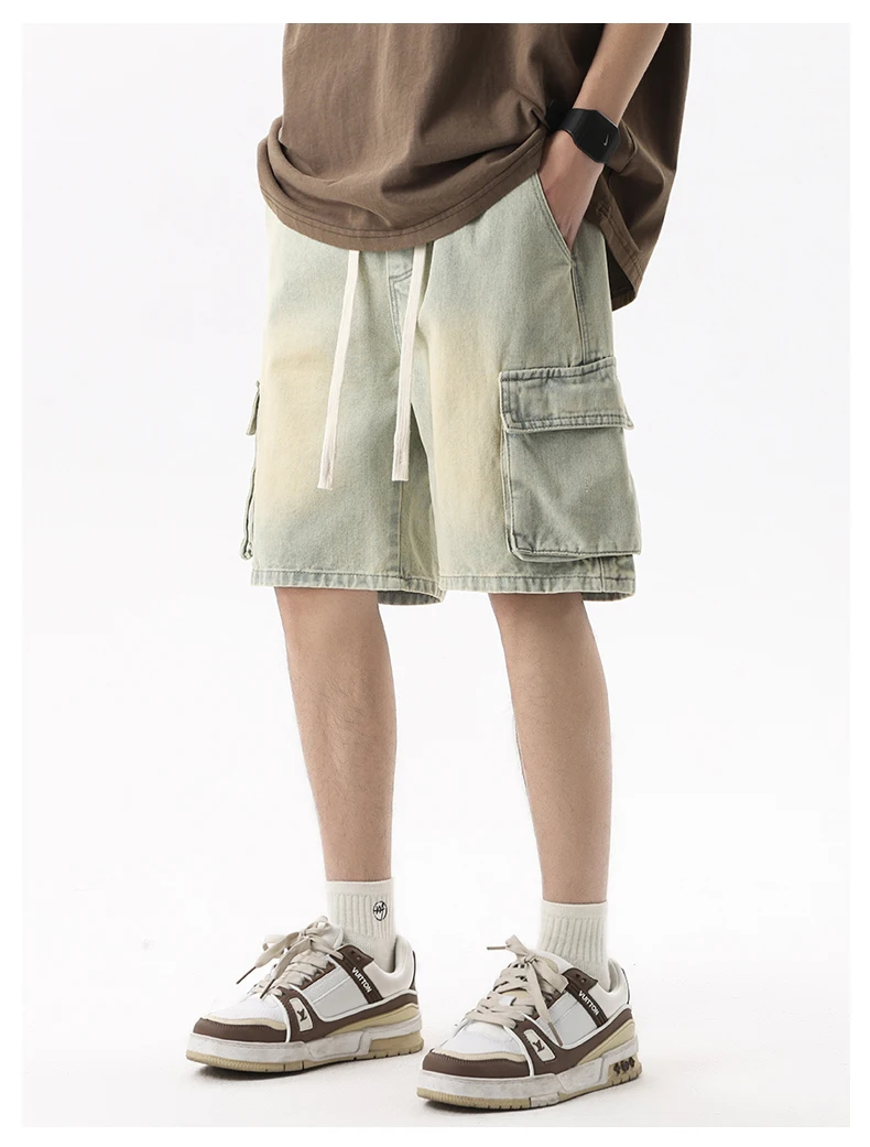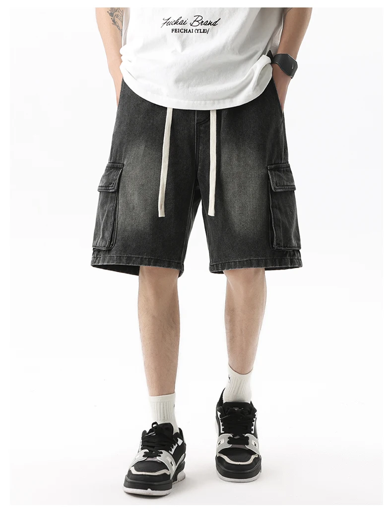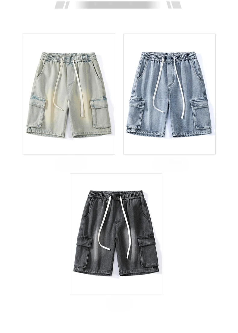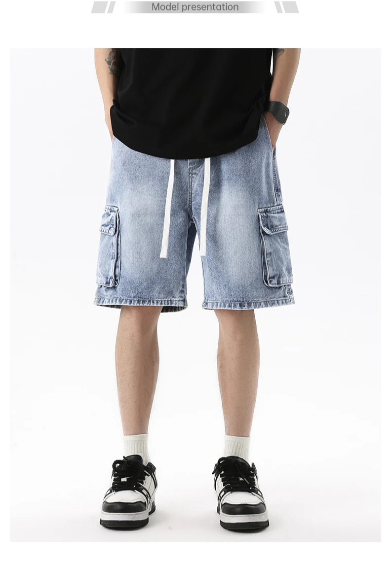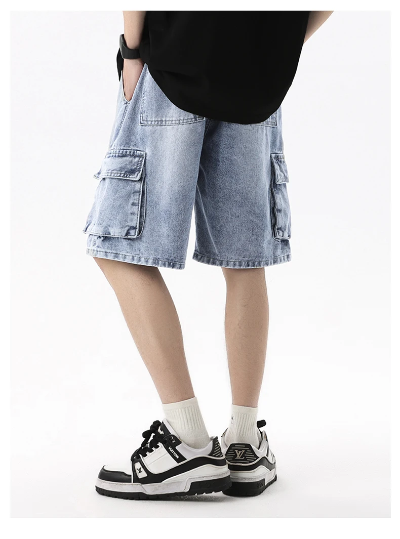 Summer Men’s Workwear Denim Shorts Retro Fashion Elastic Waist Loose Straight Leg Large Pocket
