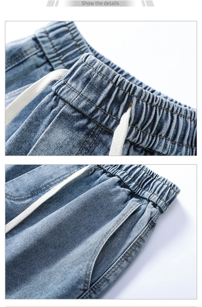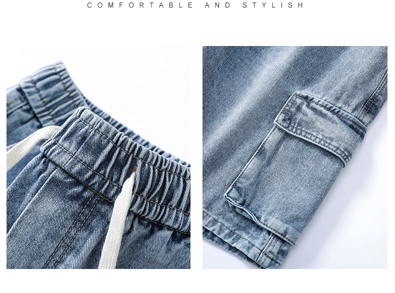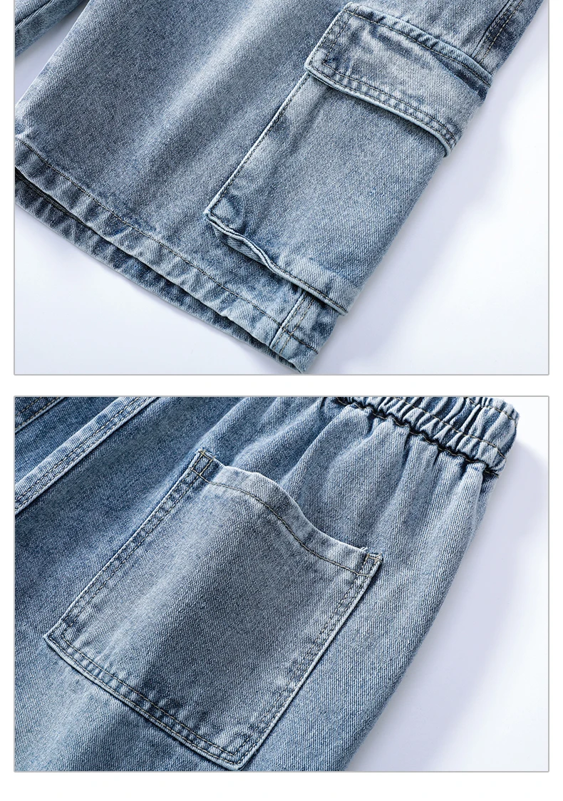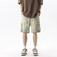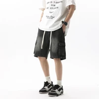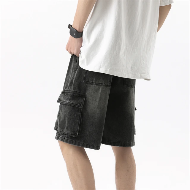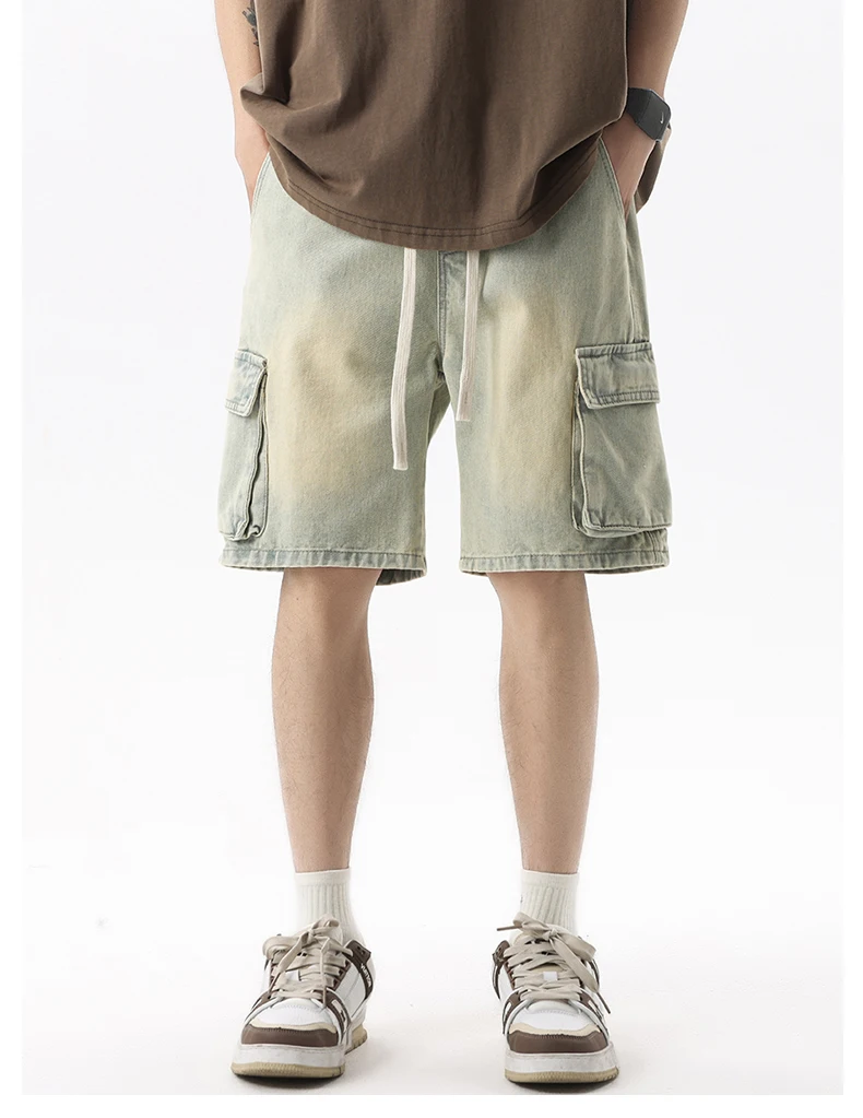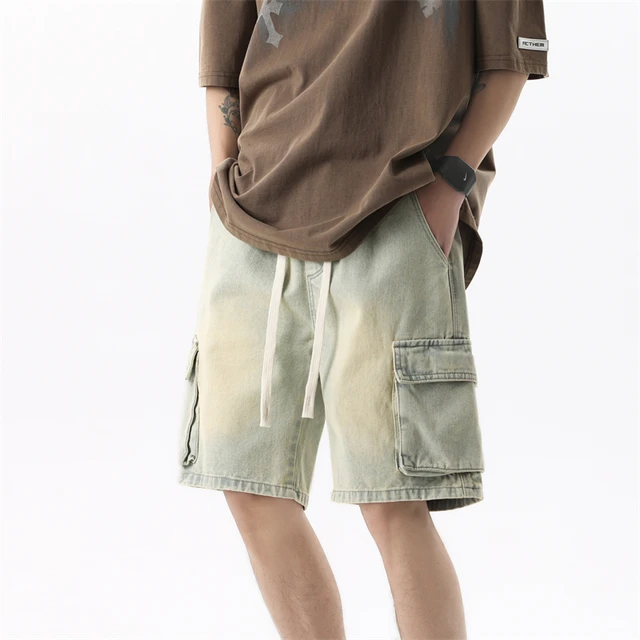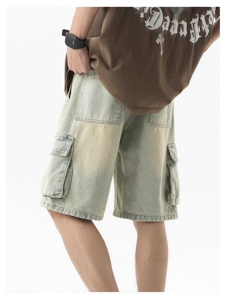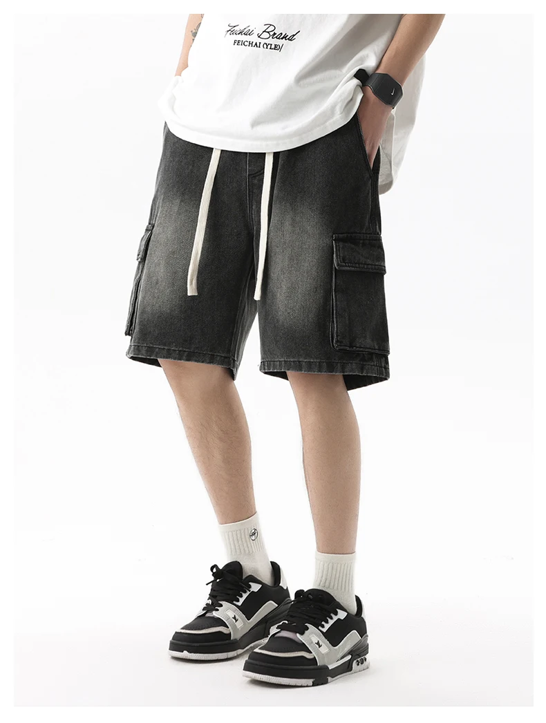 Summer Men’s Workwear Denim Shorts Retro Fashion Elastic Waist Loose Straight Leg Large Pocket