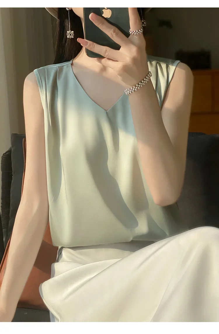 Summer New Acetate Satin Strap Vest Women's Inner V-neck Top Outer Loose plus Size Women's Clothing Summer