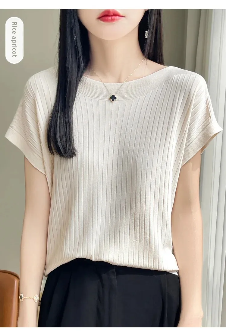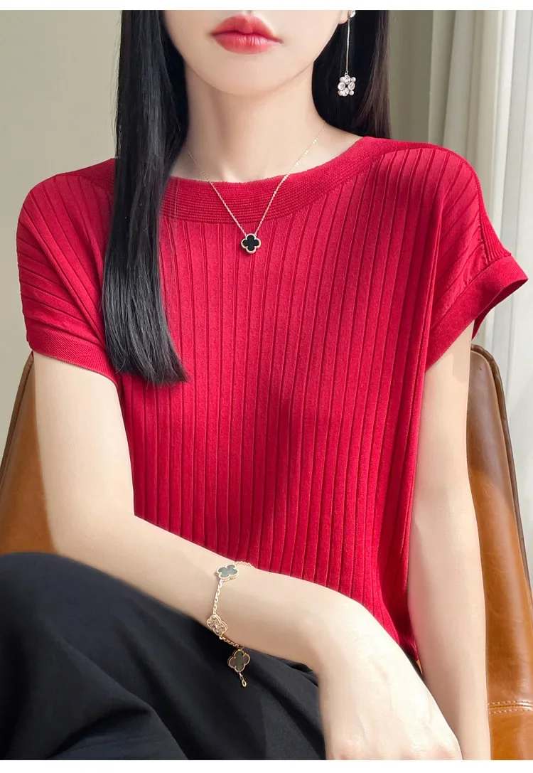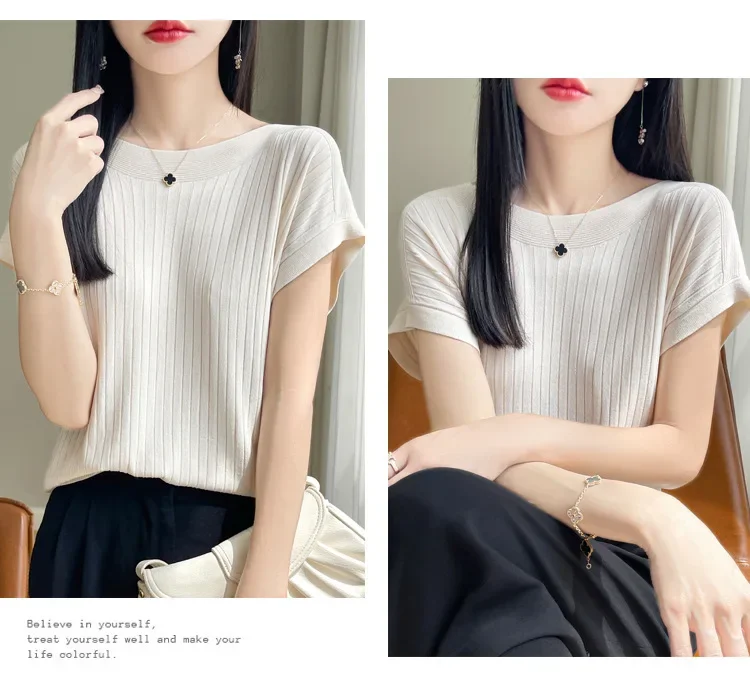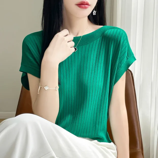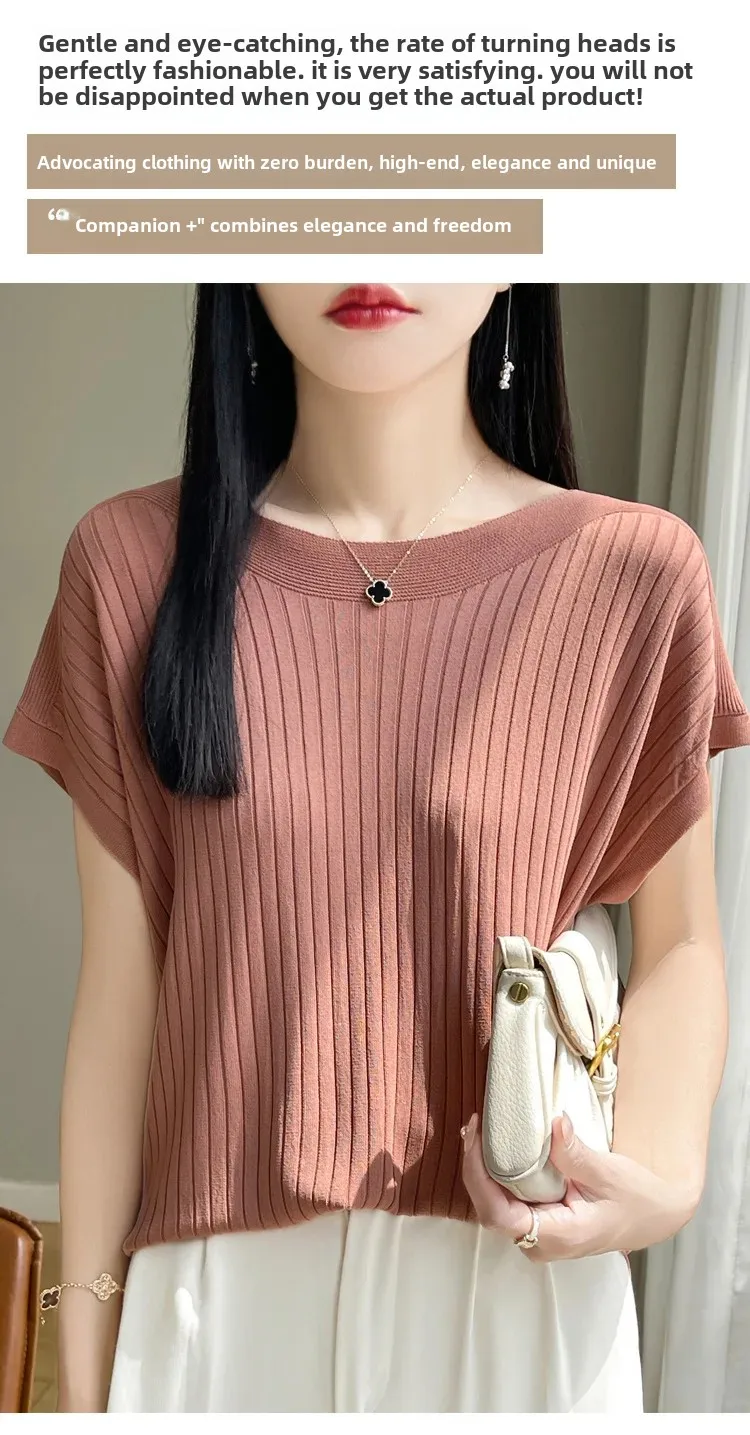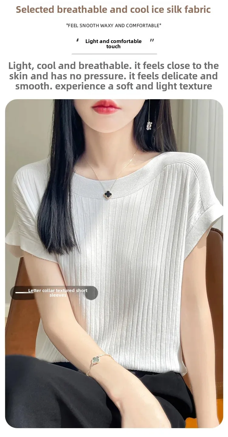 Summer New Style Ice Silk Knitted Short Sleeve Women Casual Loose Slim Fit Half Sleeve Base Thin Top