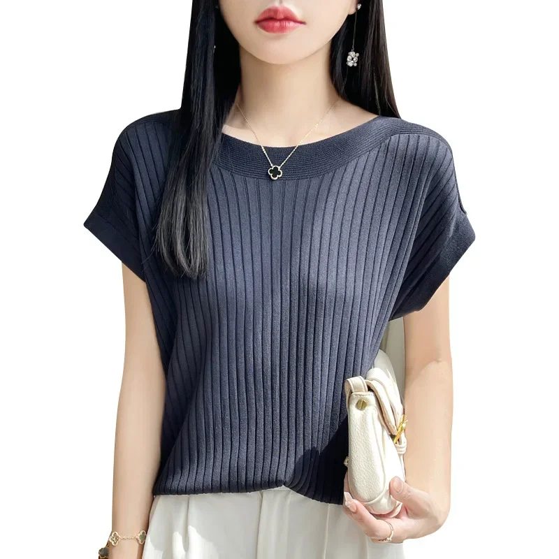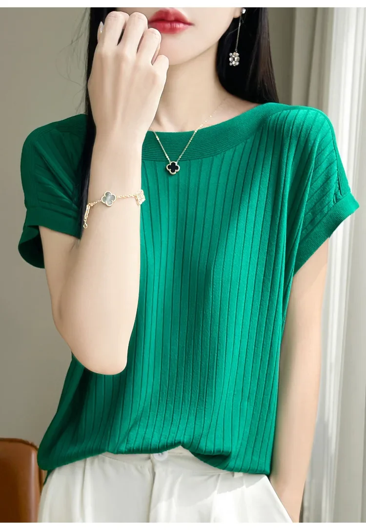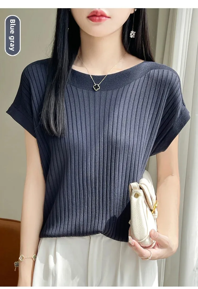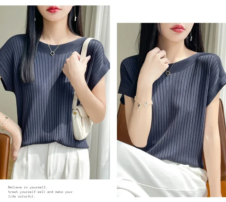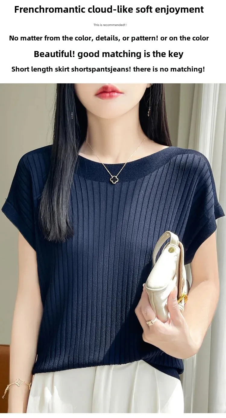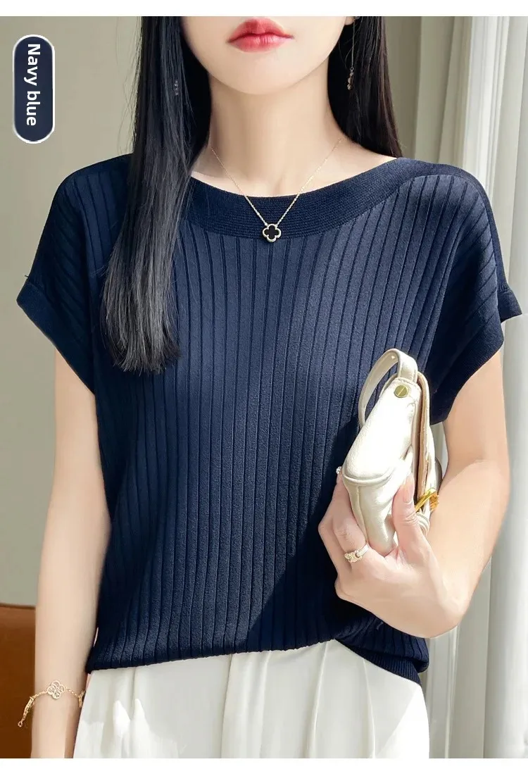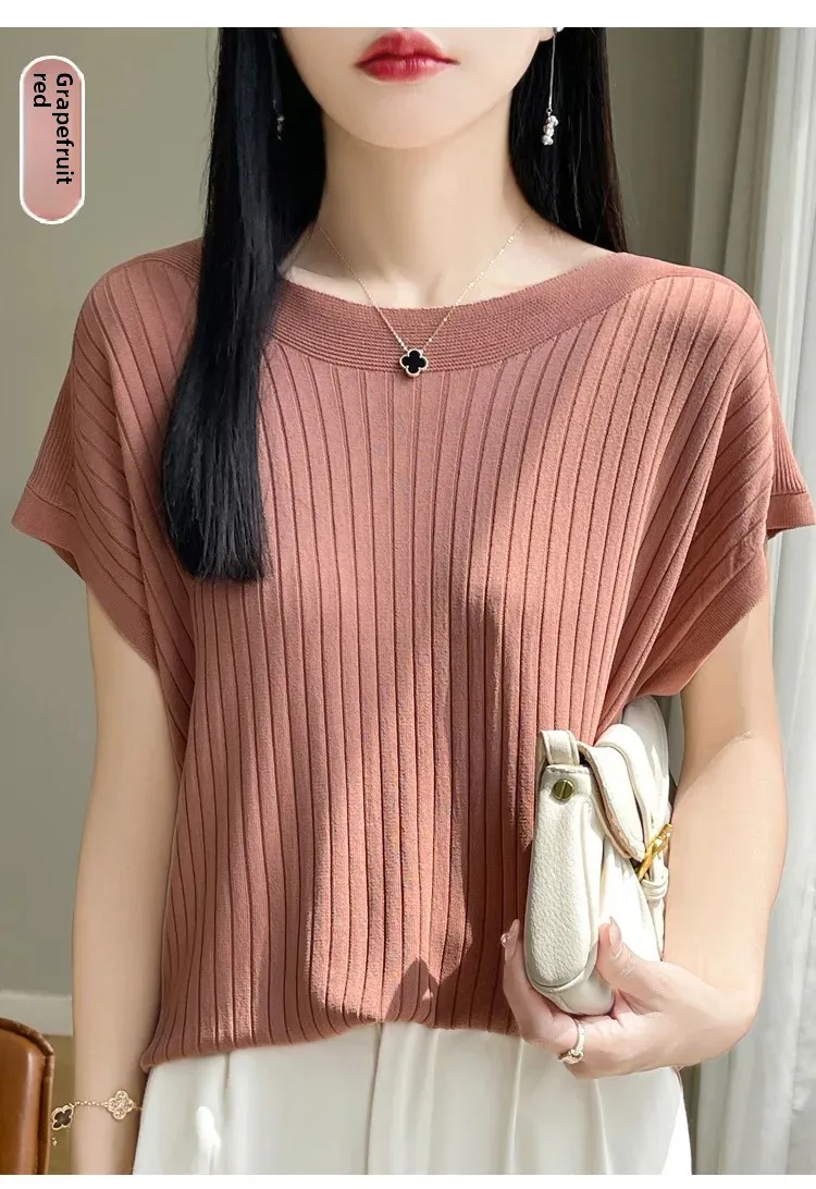 Summer New Style Ice Silk Knitted Short Sleeve Women Casual Loose Slim Fit Half Sleeve Base Thin Top