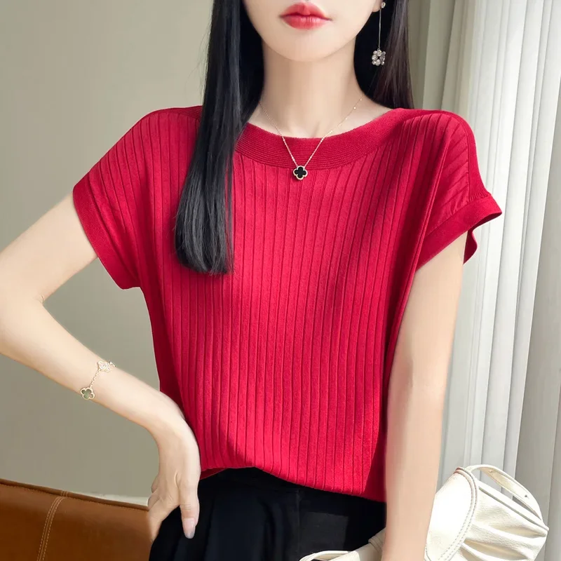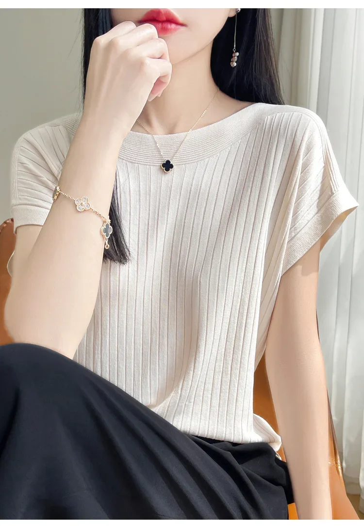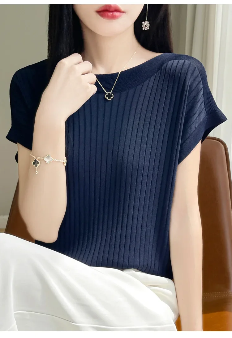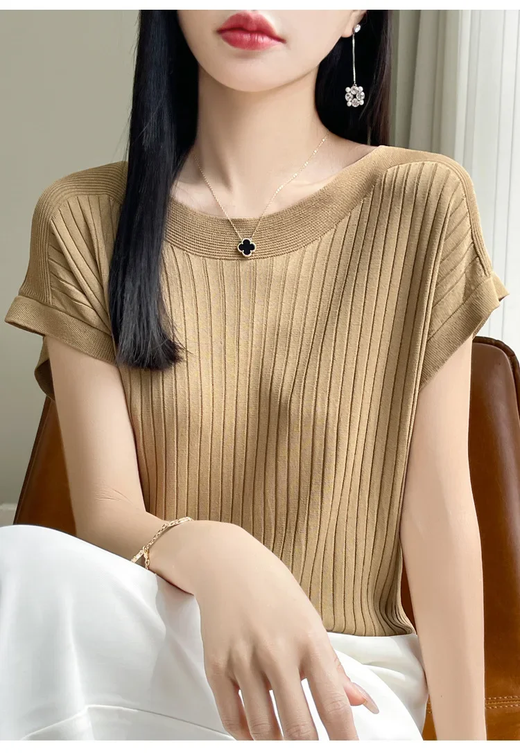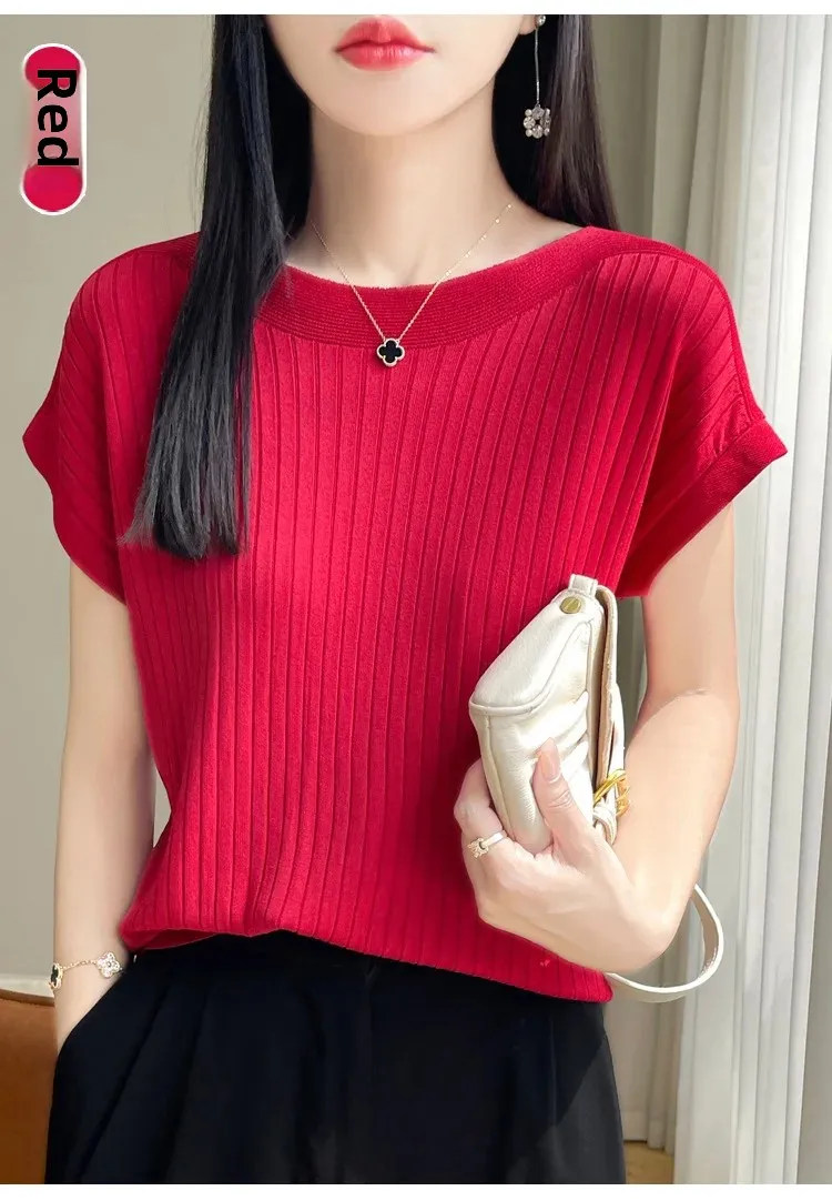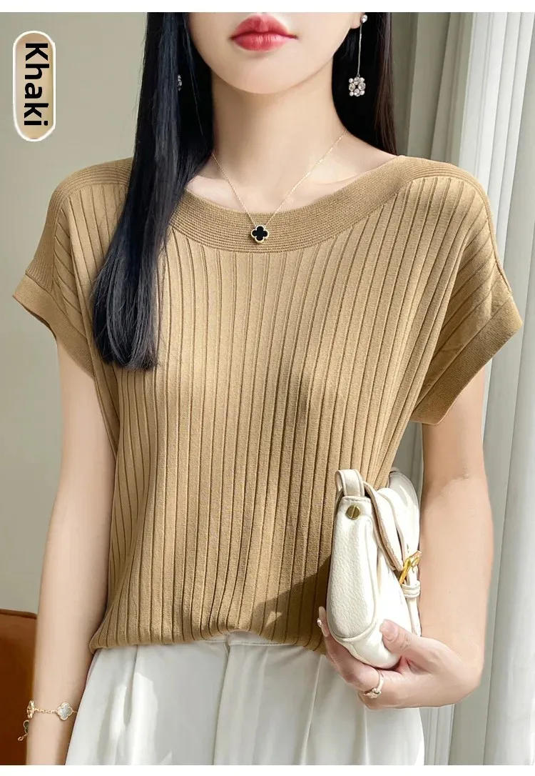 Summer New Style Ice Silk Knitted Short Sleeve Women Casual Loose Slim Fit Half Sleeve Base Thin Top