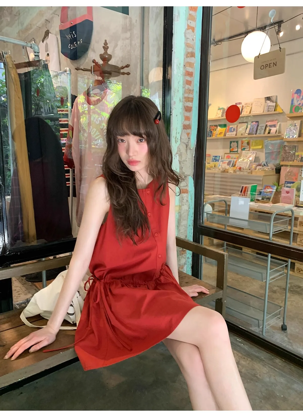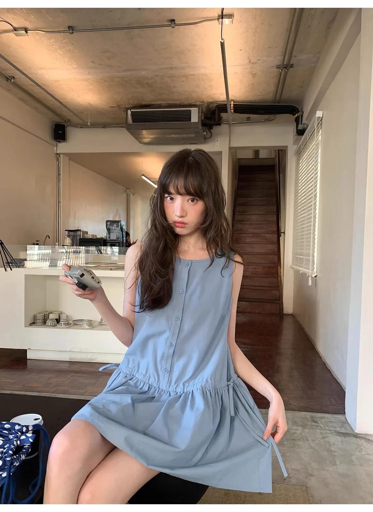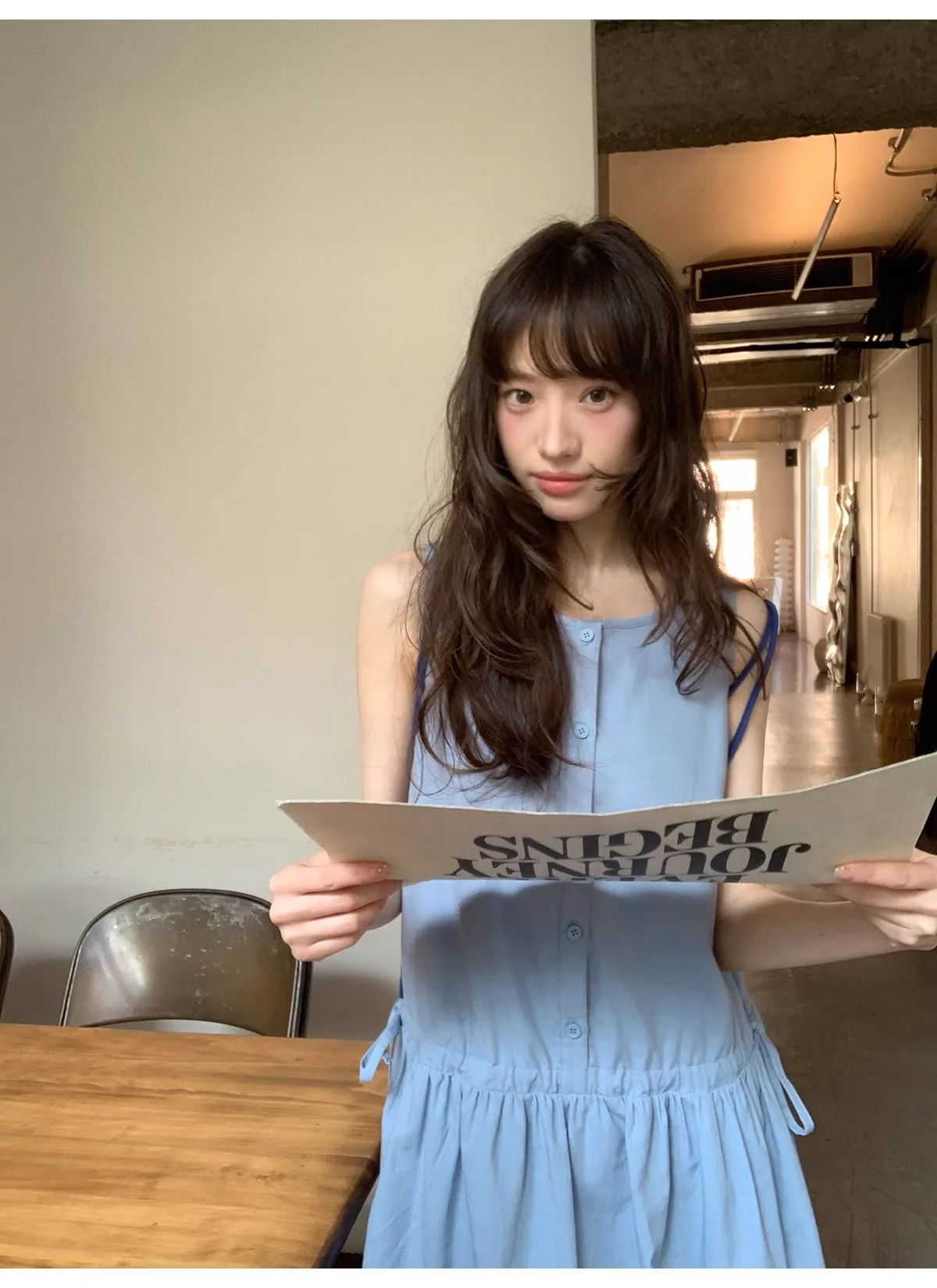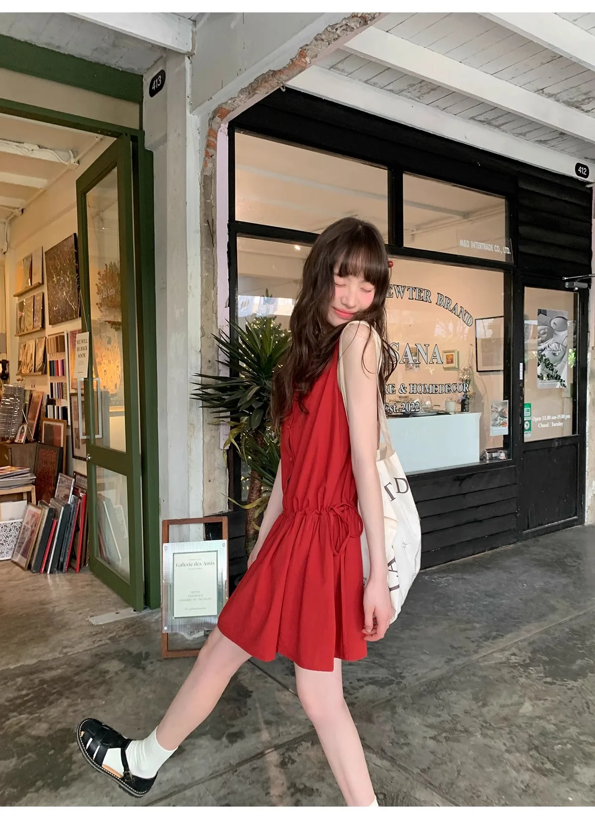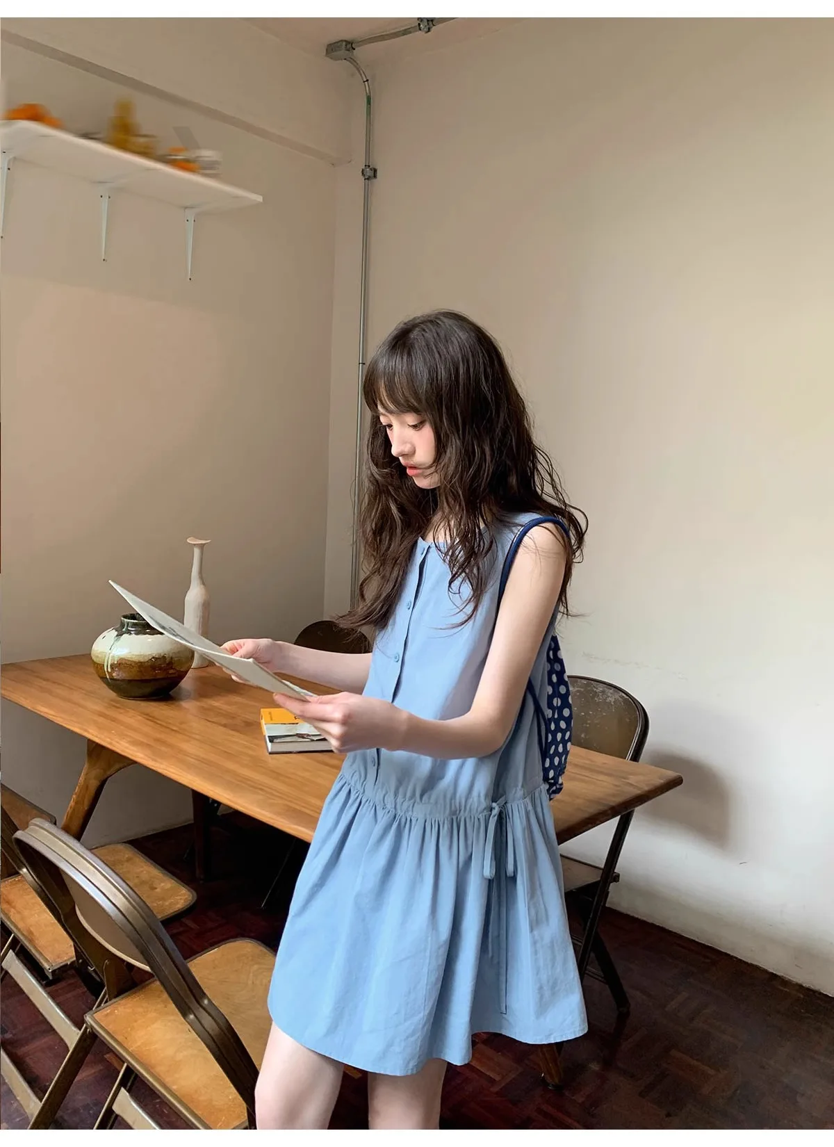 This summer new Korean style dress features a unique cotton-linen design, offering a loose and comfortable fit with a drawstring waist for a flattering silhouette.