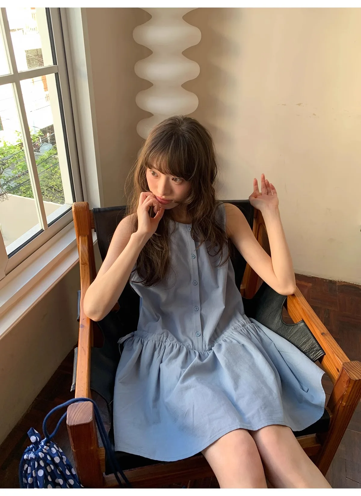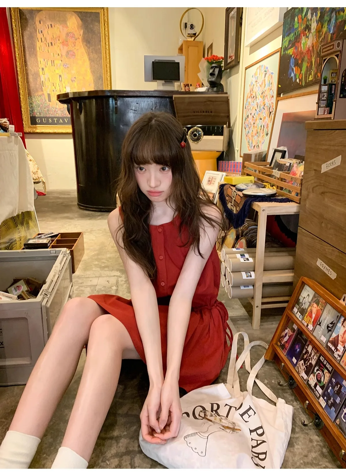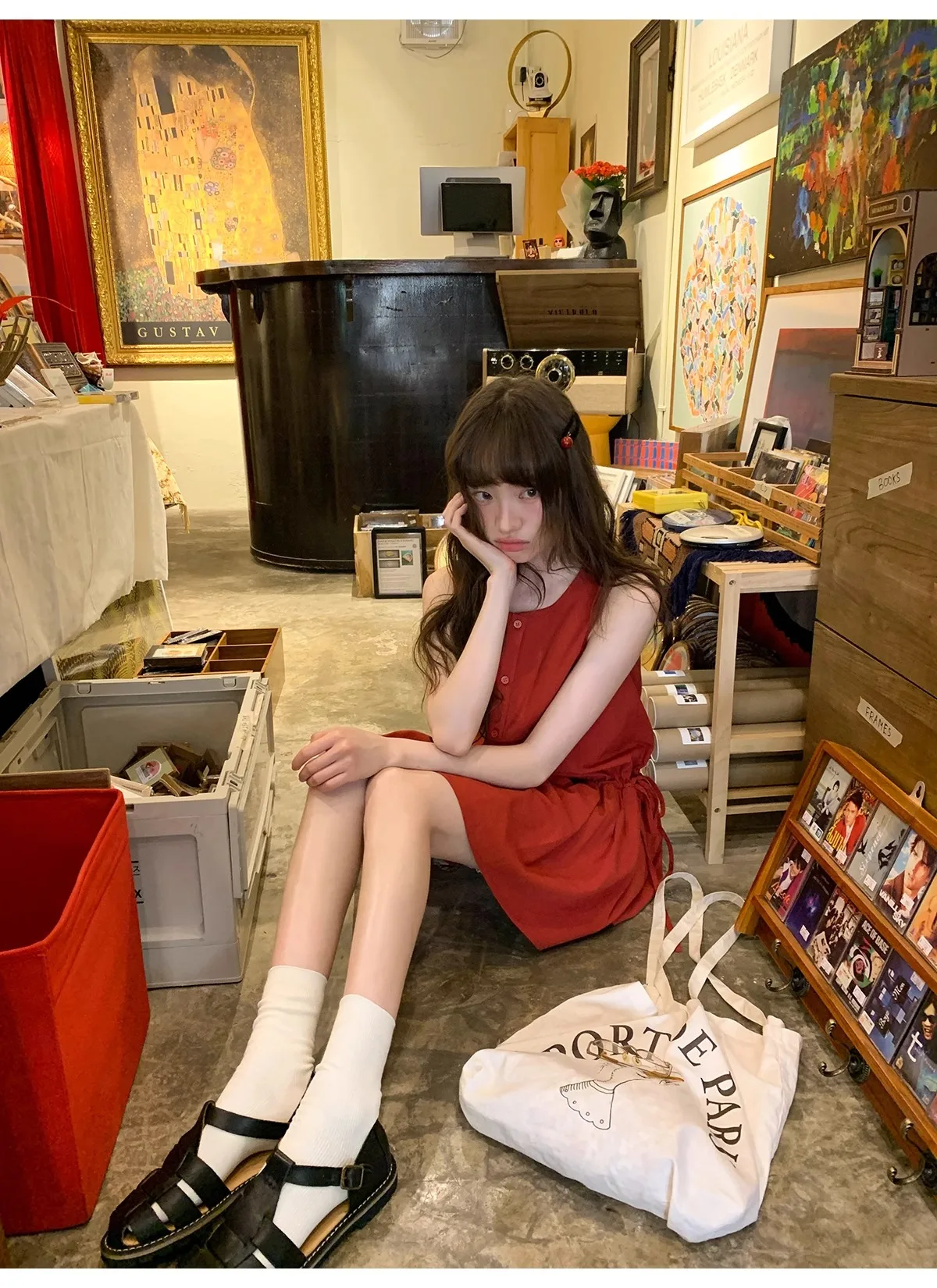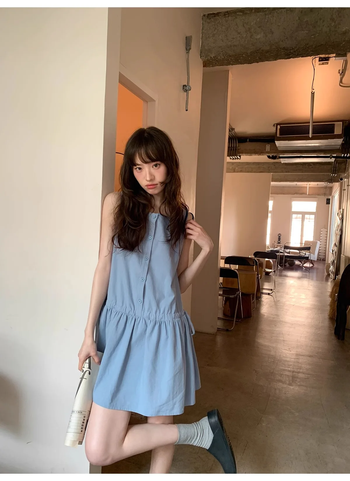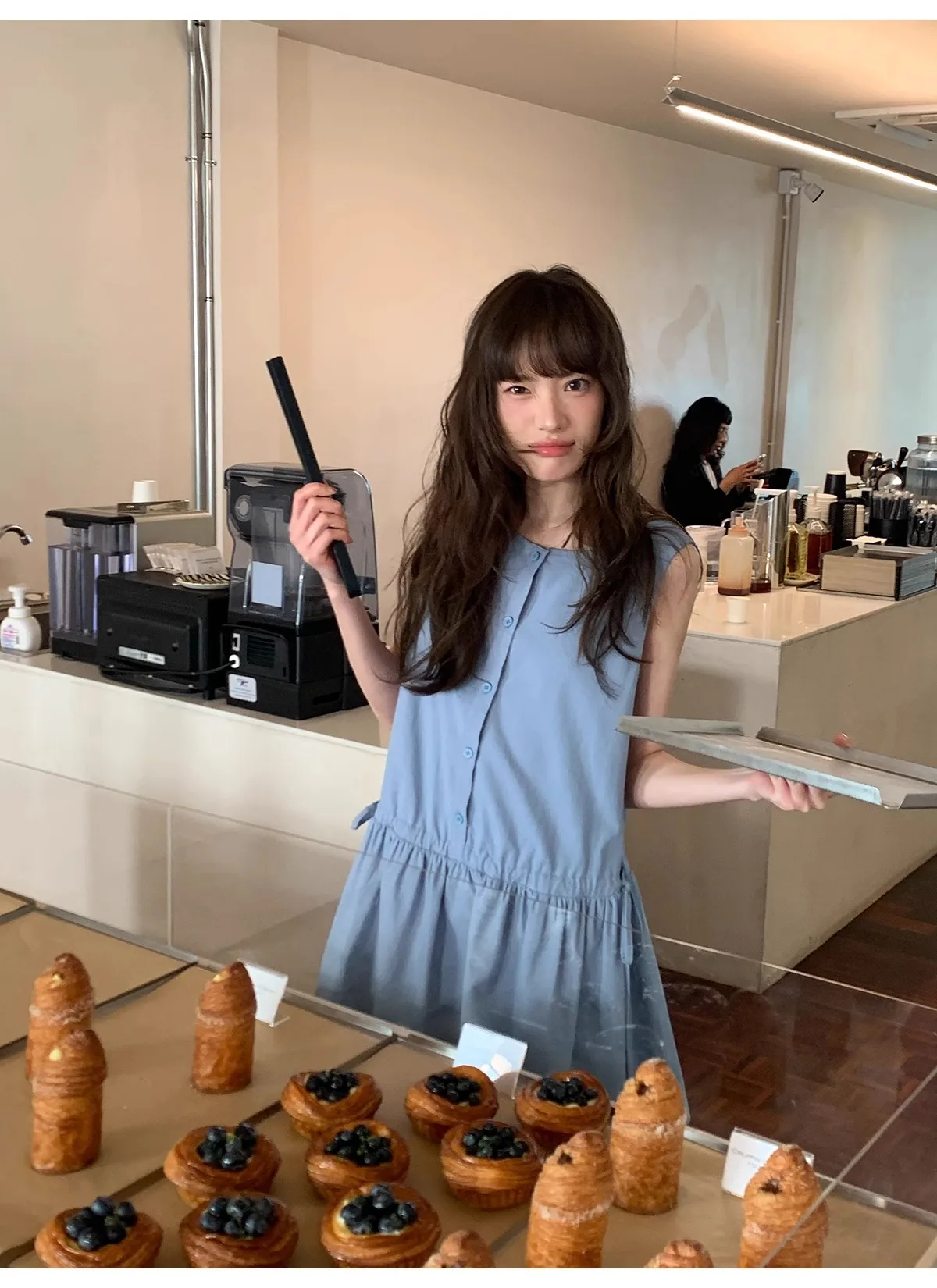 This summer new Korean style dress features a unique cotton-linen design, offering a loose and comfortable fit with a drawstring waist for a flattering silhouette.