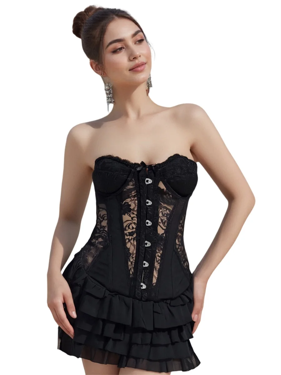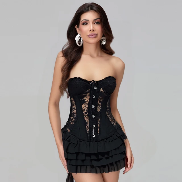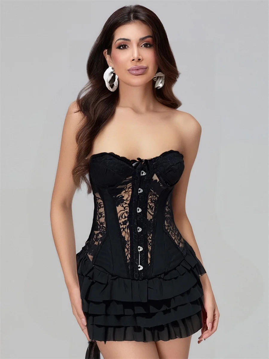 Women Strapless Corset Dress Summer Sheer Layered Ruffle Mini Dress for Cocktail Party Beach Streetwear