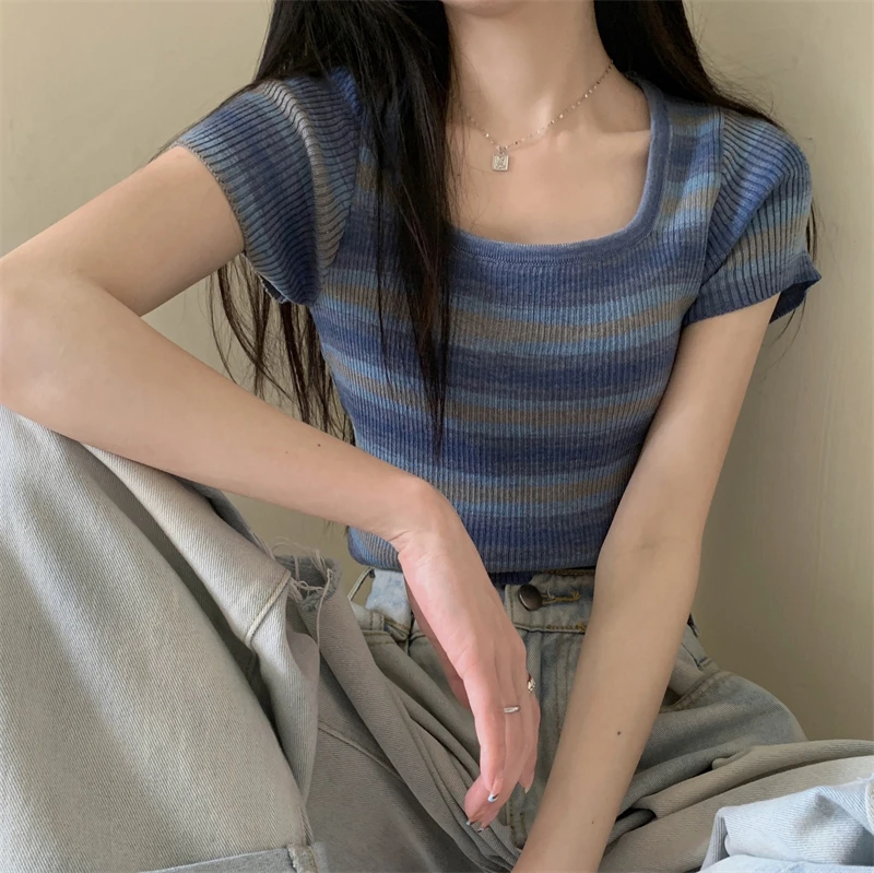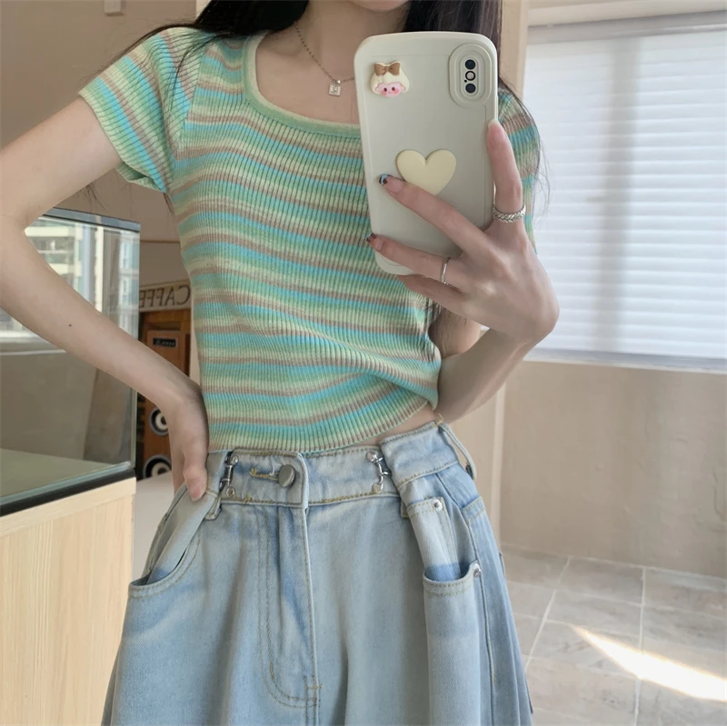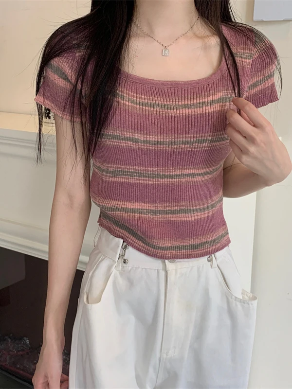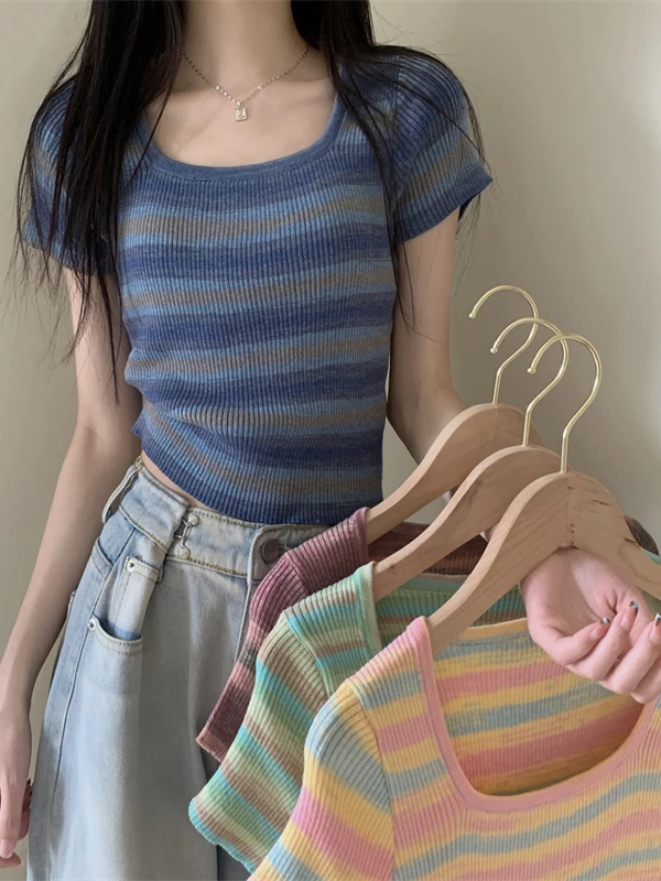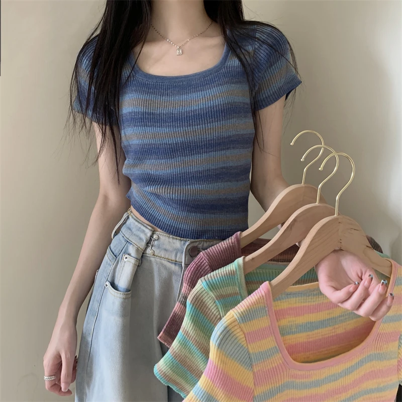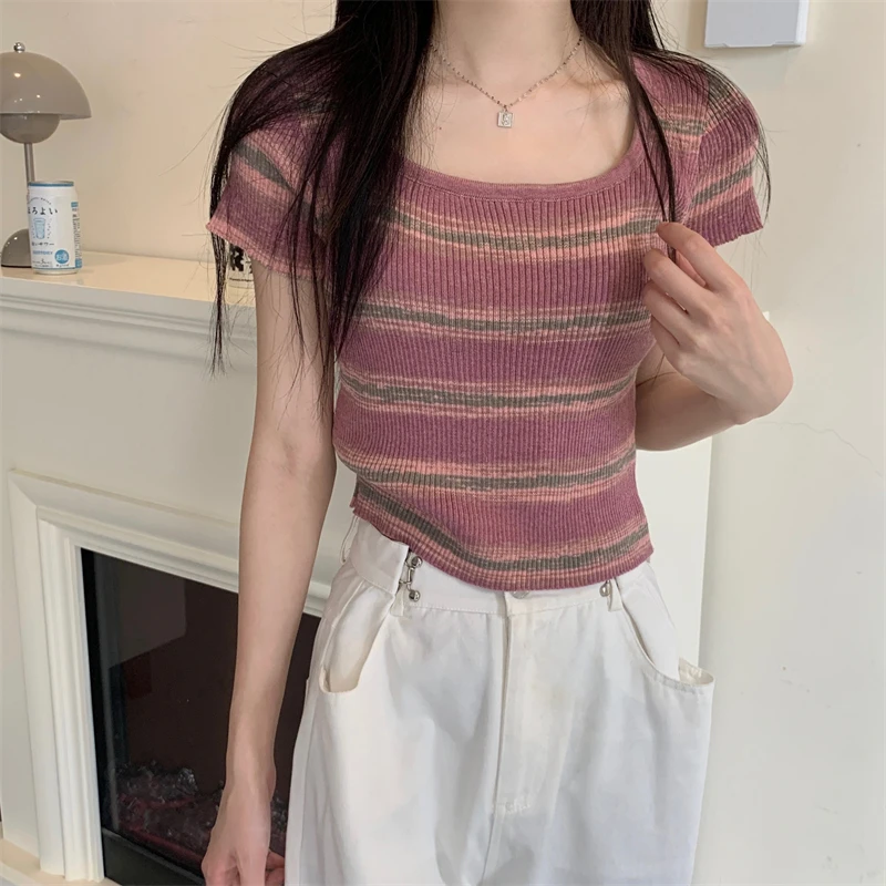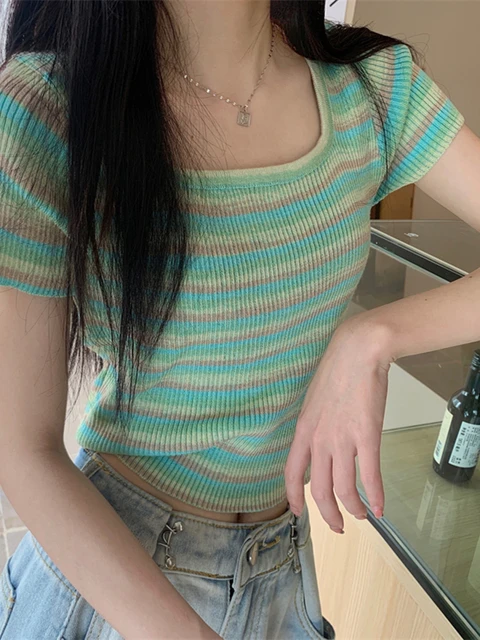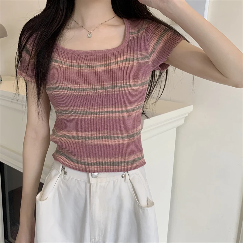 Summer Slim Fit ort Sve Square Collar Color Stripe Knitted T-irt Women's Faion Commute Sle Small Size Friendly Top