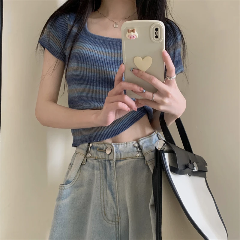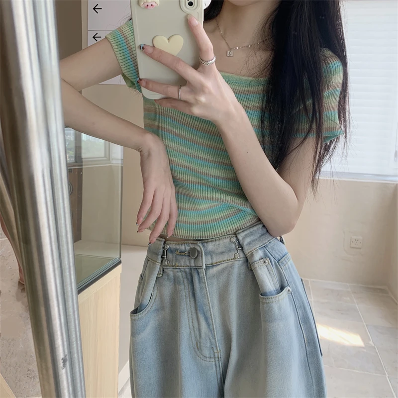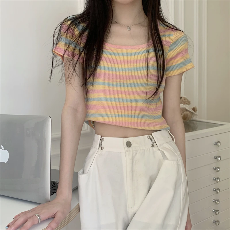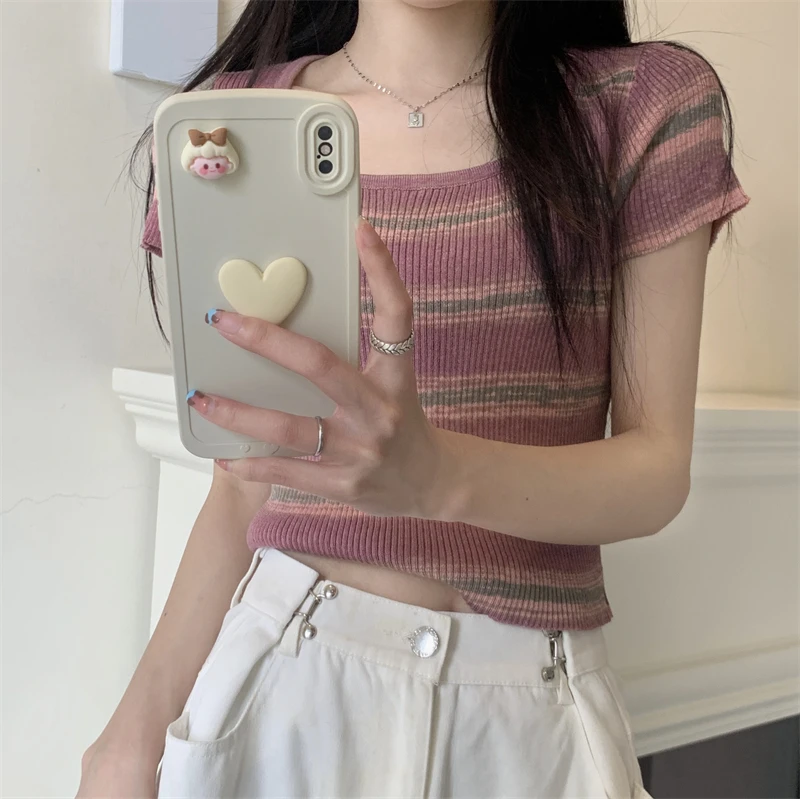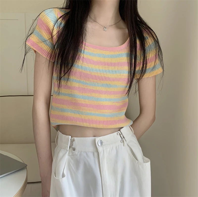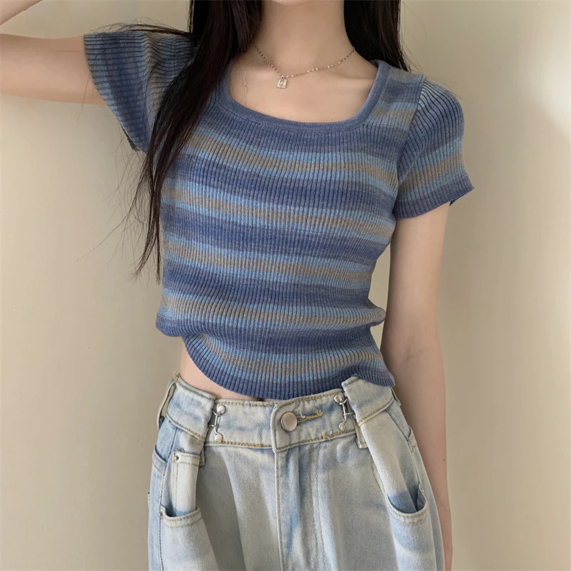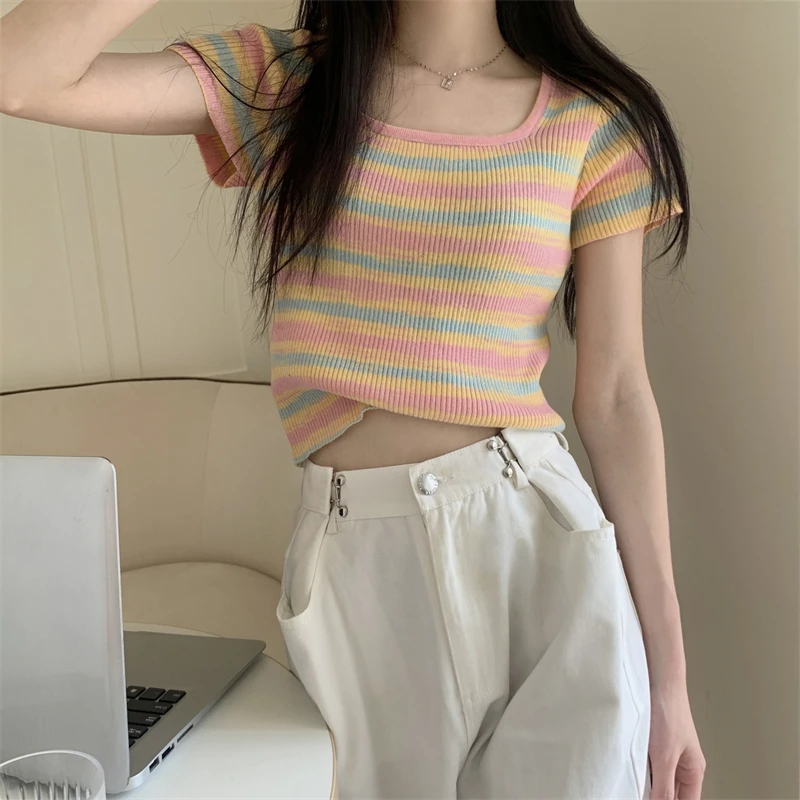 Summer Slim Fit ort Sve Square Collar Color Stripe Knitted T-irt Women's Faion Commute Sle Small Size Friendly Top