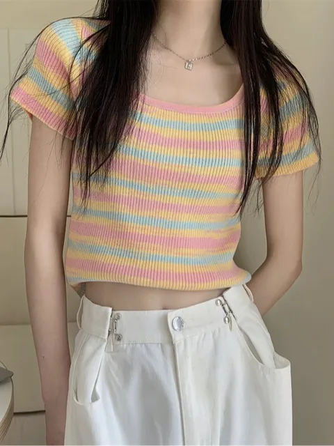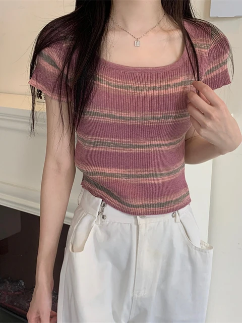 Be the first to review “Summer Slim Fit ort Sve Square Collar Color Stripe Knitted T-irt Women’s Faion Commute Sle Small”