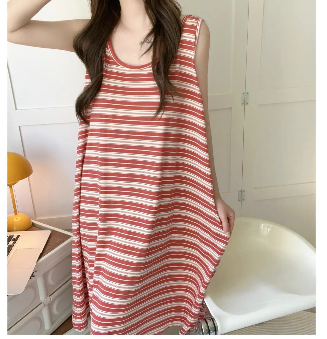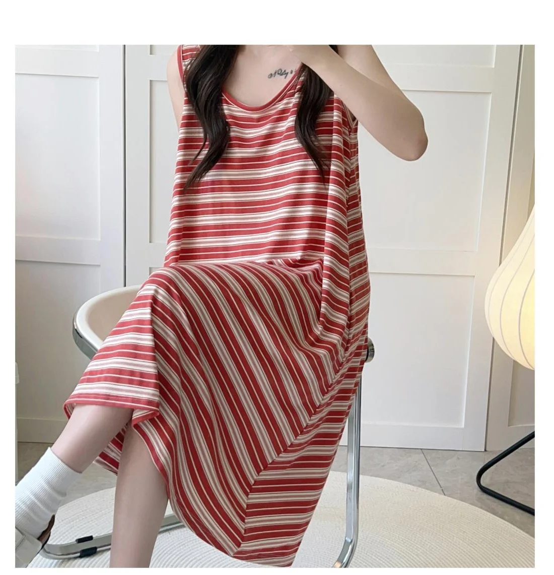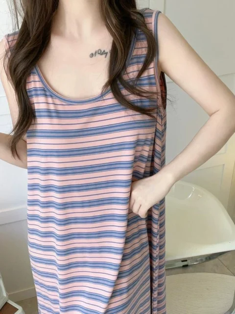 The summer striped design of this sleep dress adds a touch of elegance and simplicity, perfect for casual home wear.
