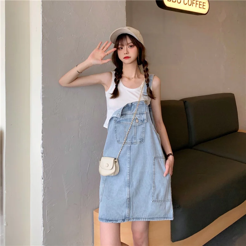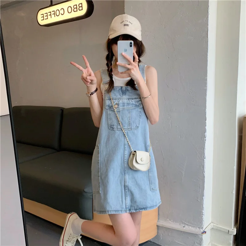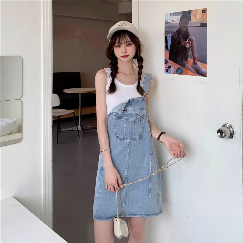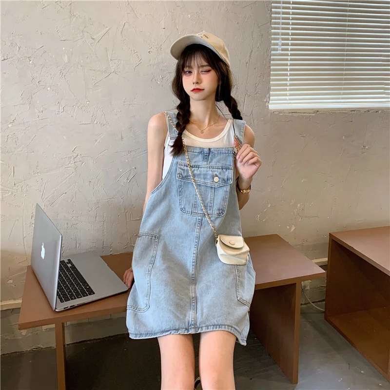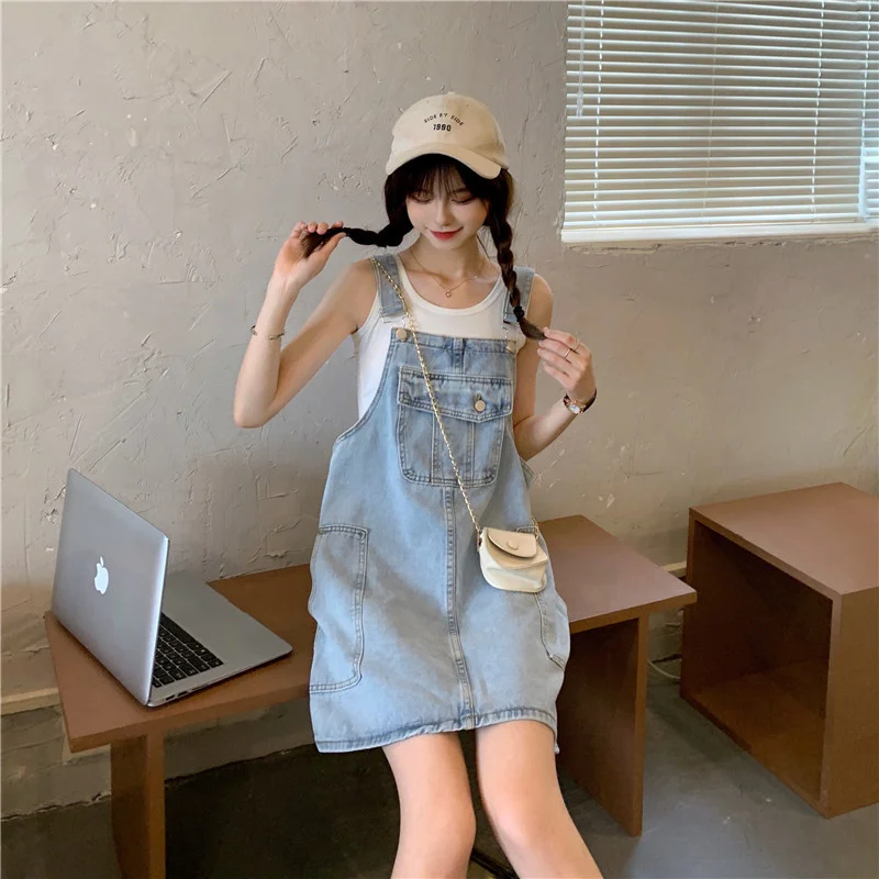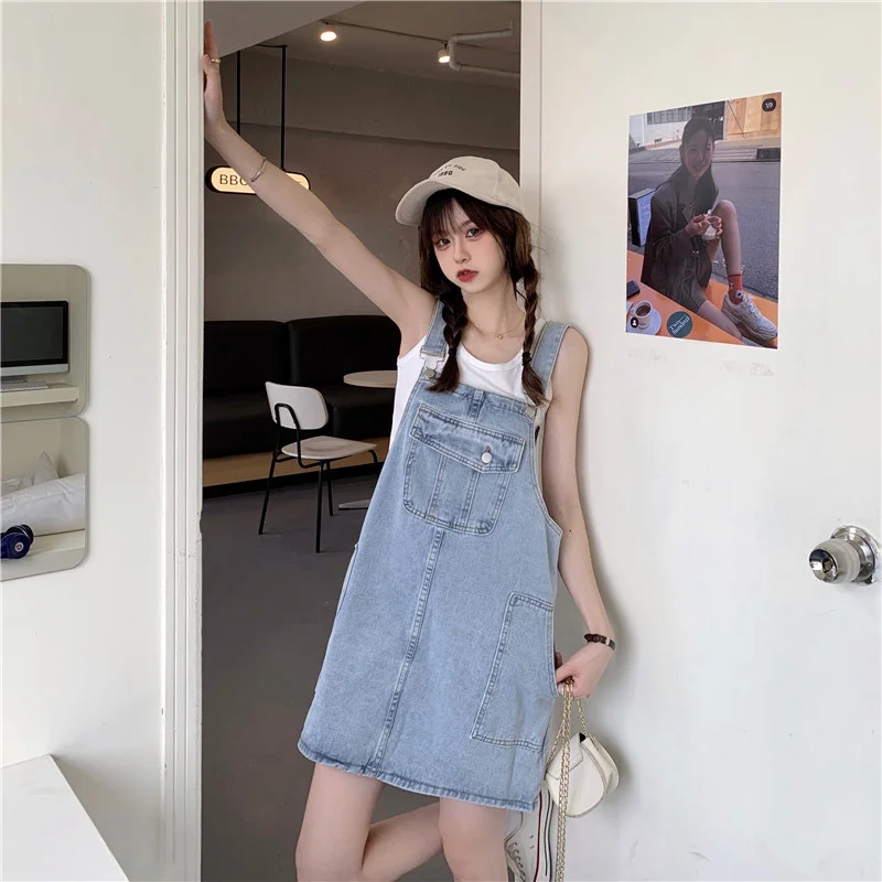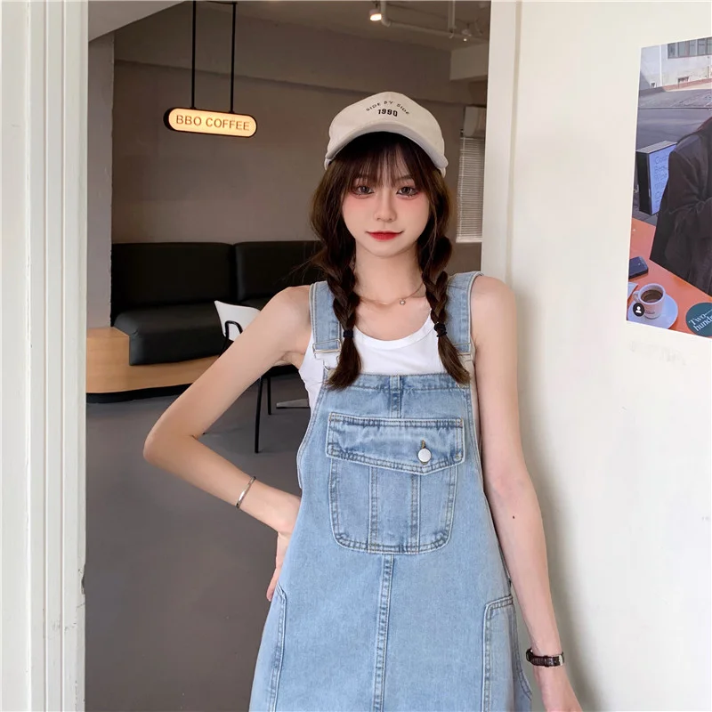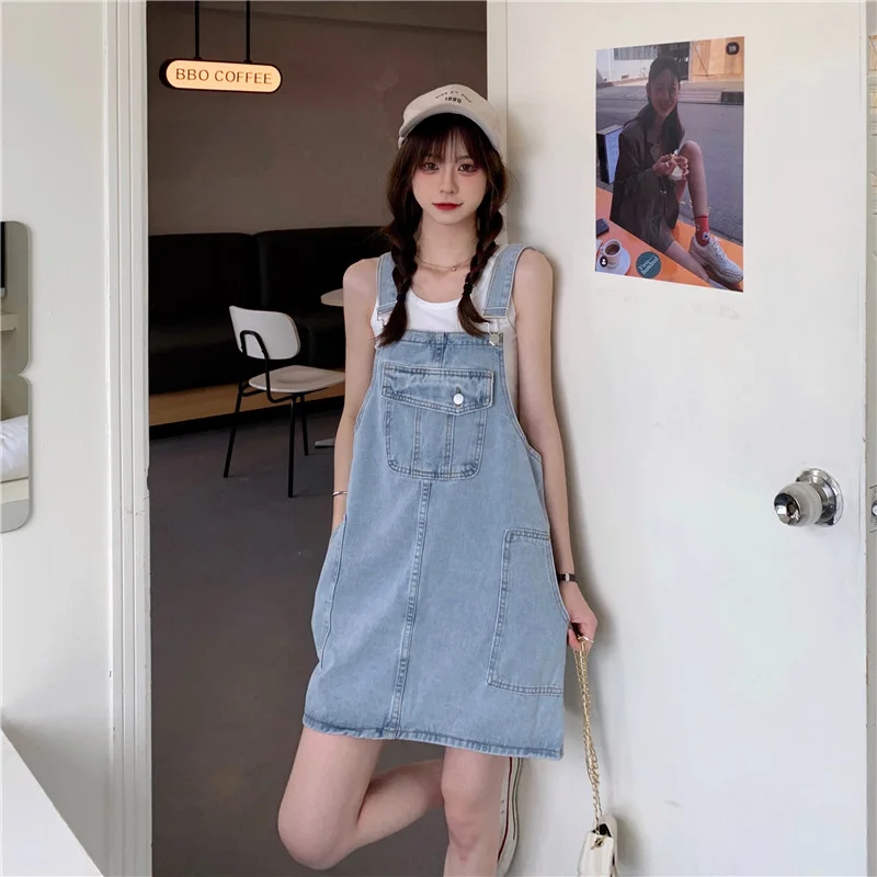 This denim overalls dress features a Korean style design, offering a trendy and fashionable look for young women.