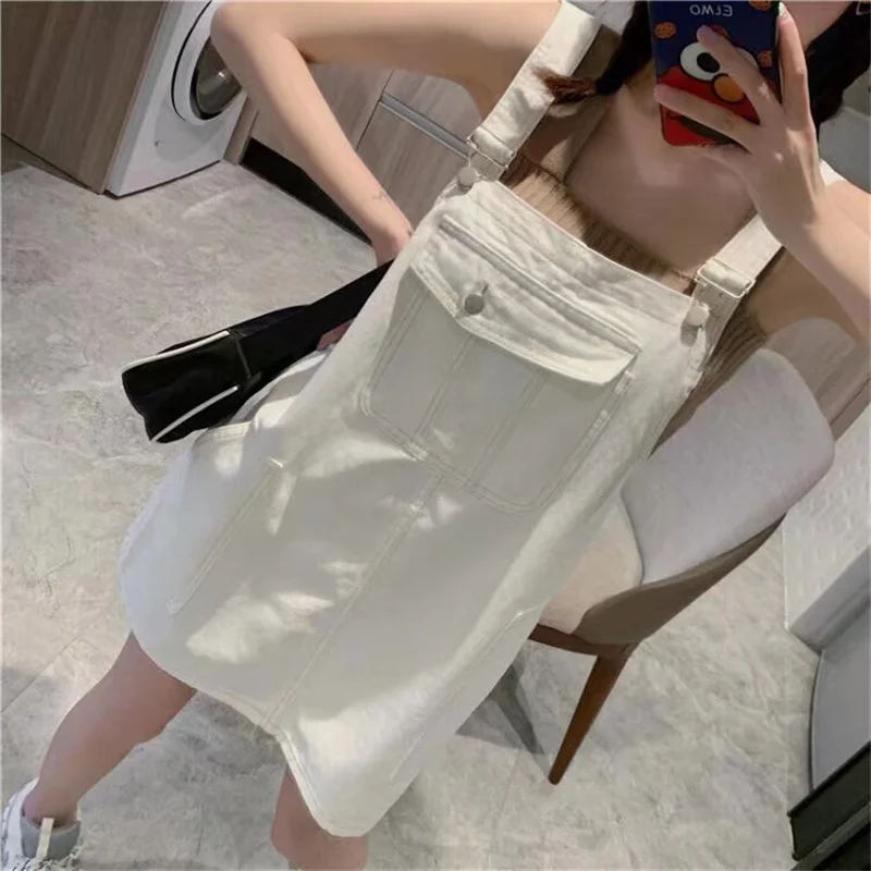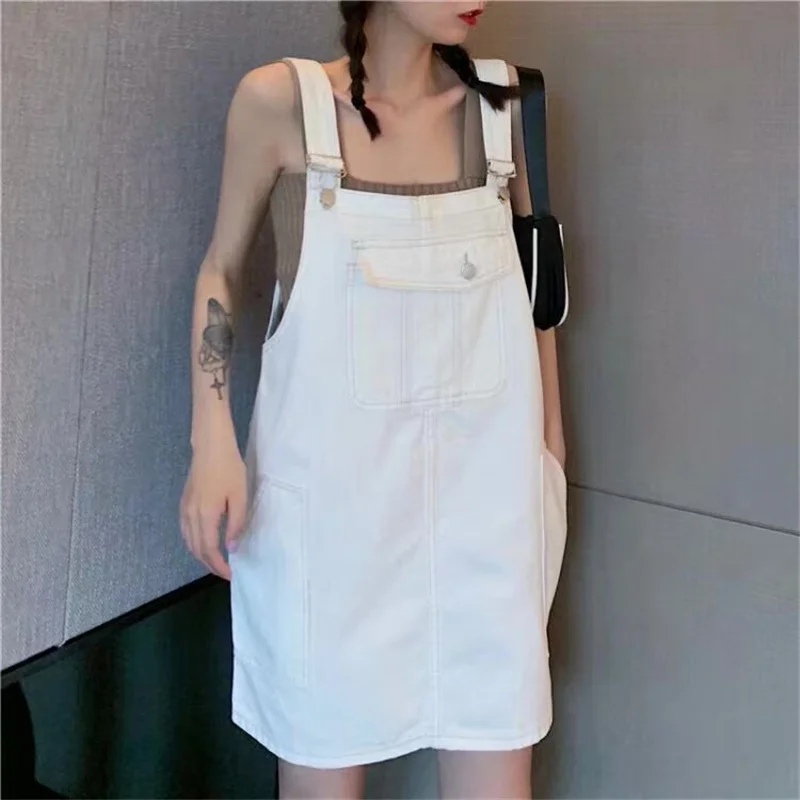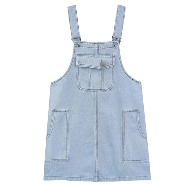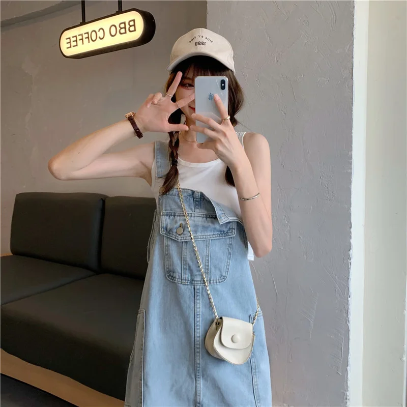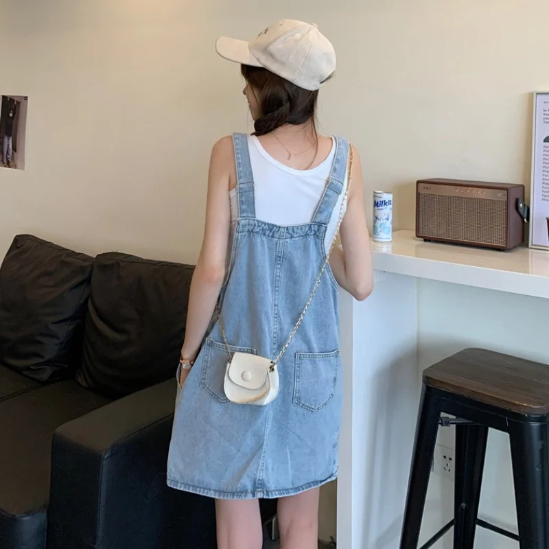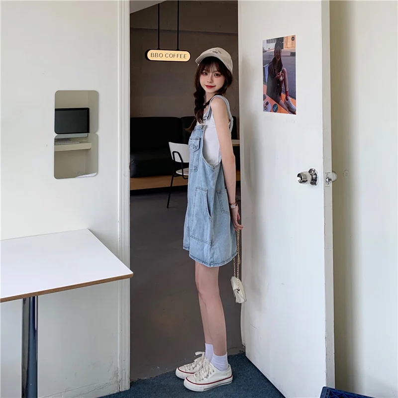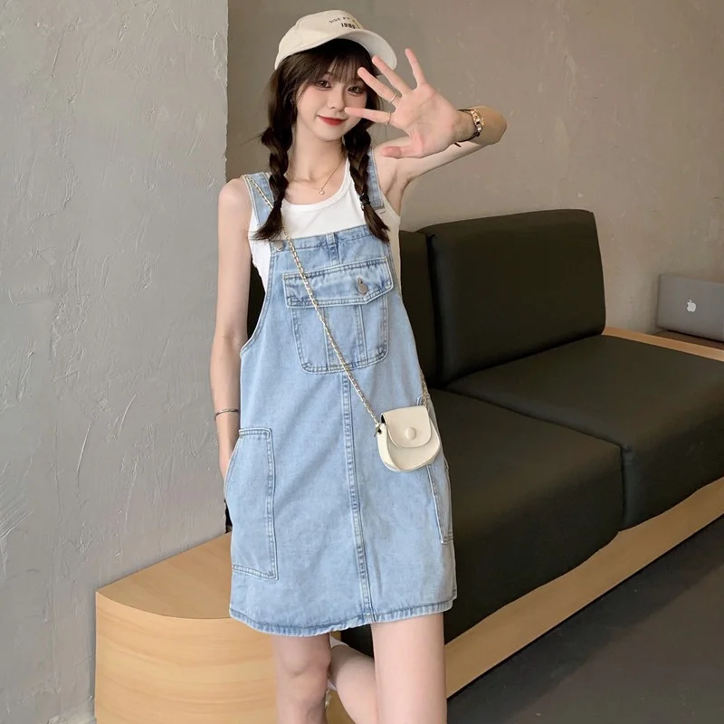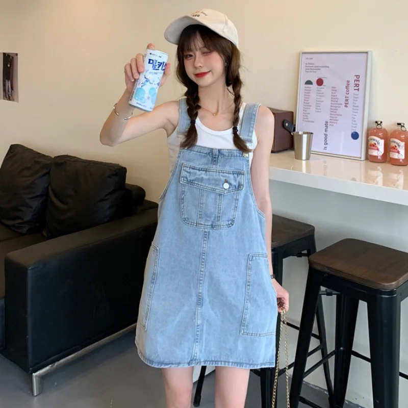 This denim overalls dress features a Korean style design, offering a trendy and fashionable look for young women.