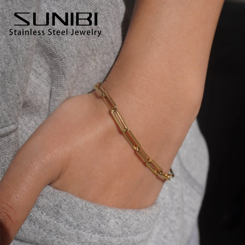 SUNIBI Simple Stainless Steel Bracelets for Woman Gold Color Link Chain Ladies Bracelet Classic Jewelry
