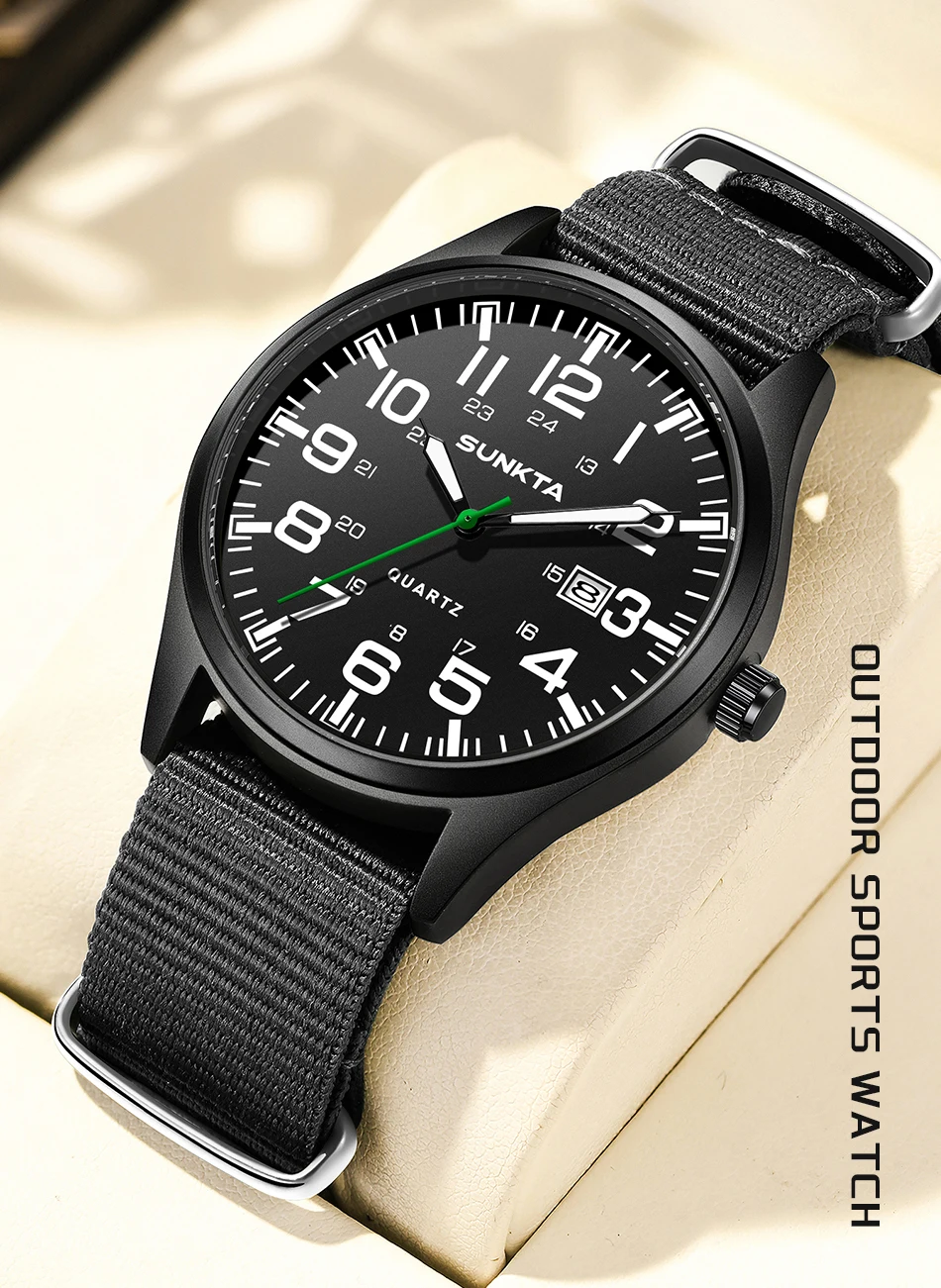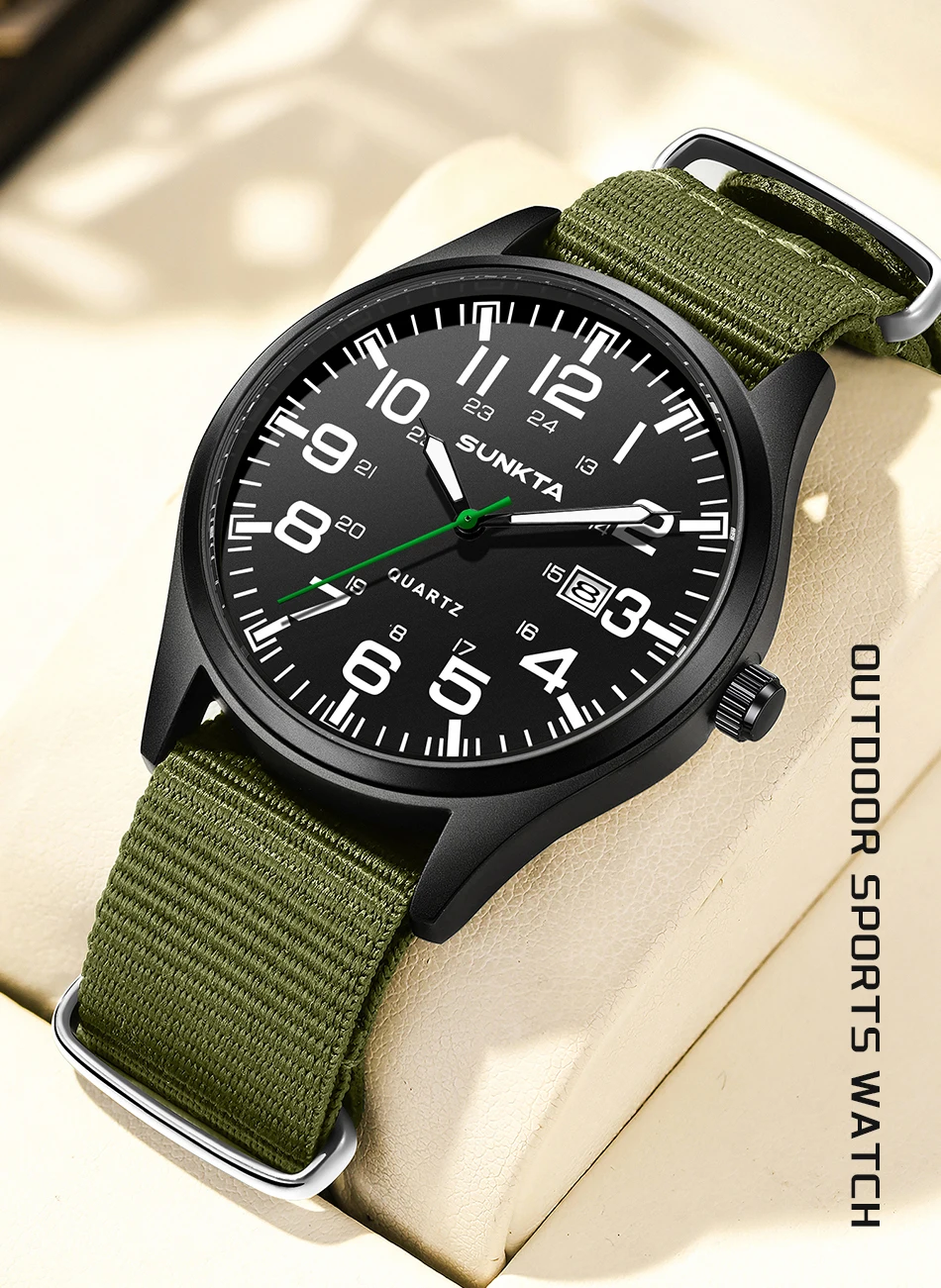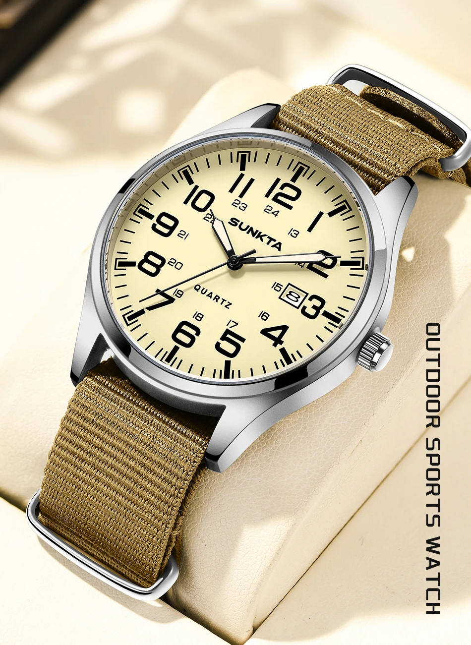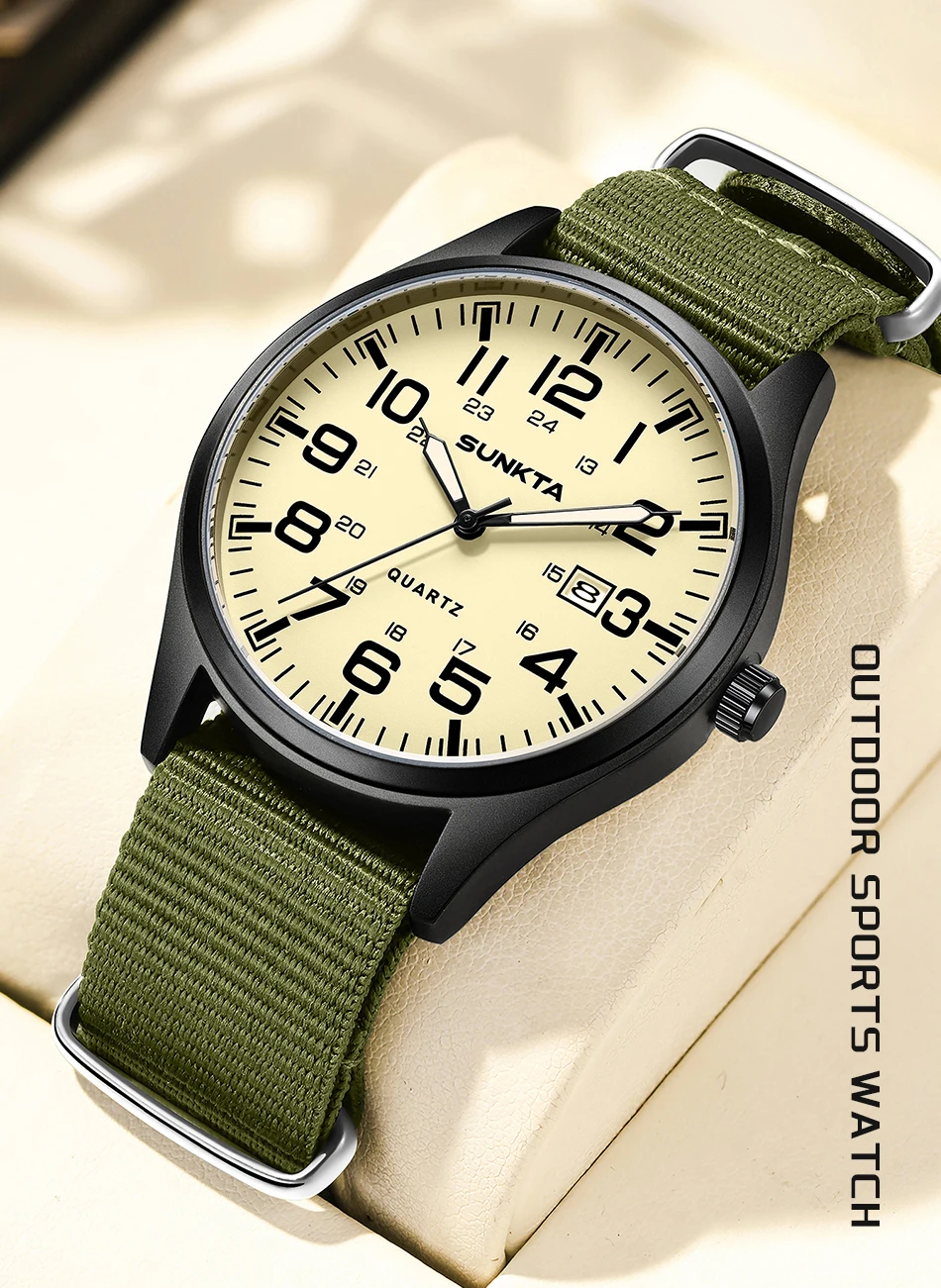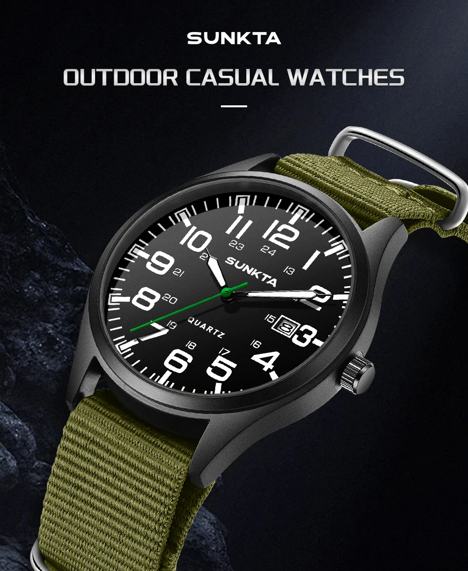 Sunkta Outdoor Sports Quartz Man Watch Retro Casual Fashion Nylon Strap Waterproof Luminous Auto Date