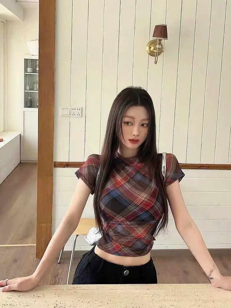 Sweet Cool Spicy ort Sve T-irt Women’s Slim Fit Retro Plaid Length round Ne Korean Sle Commute