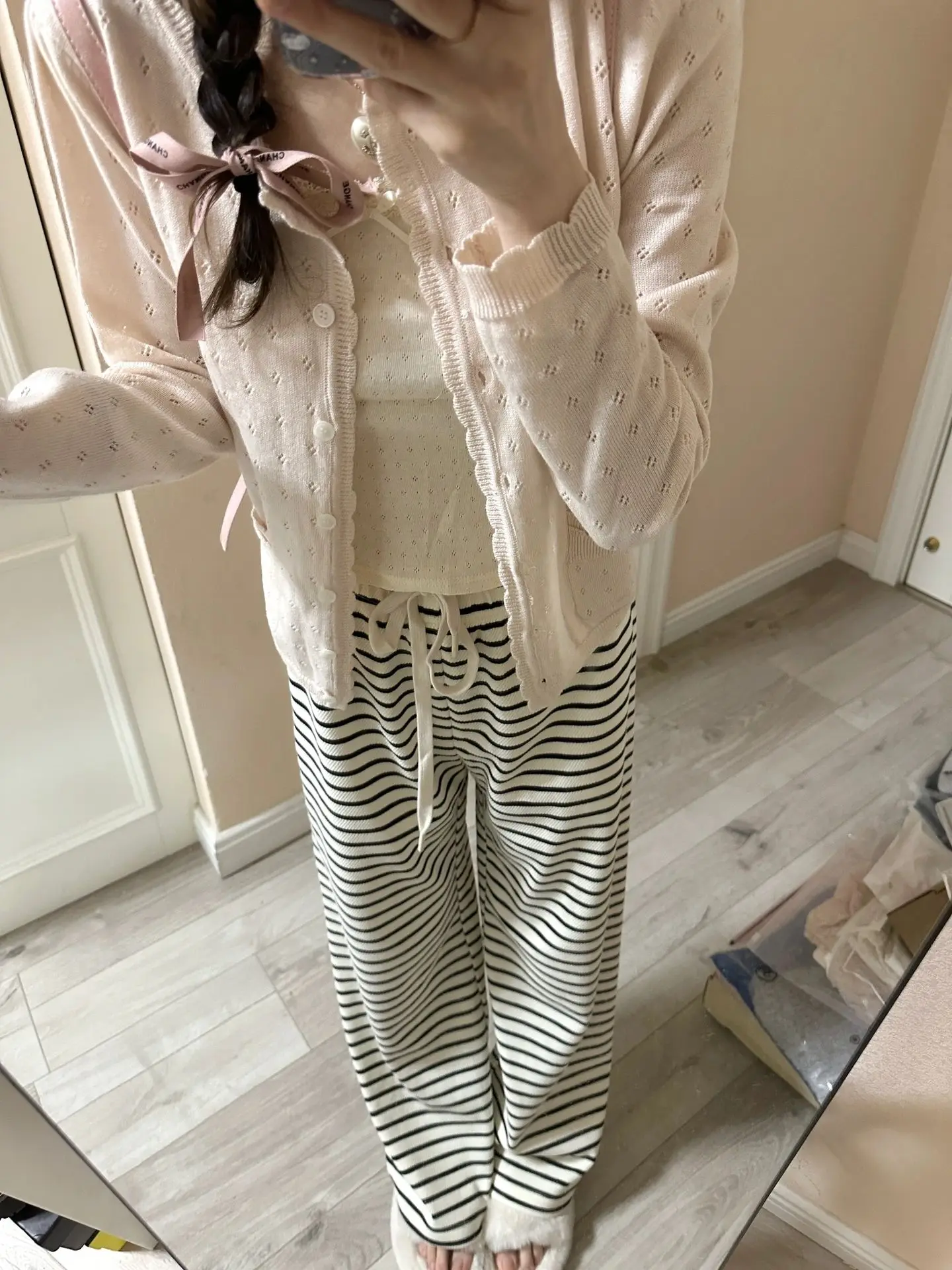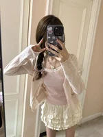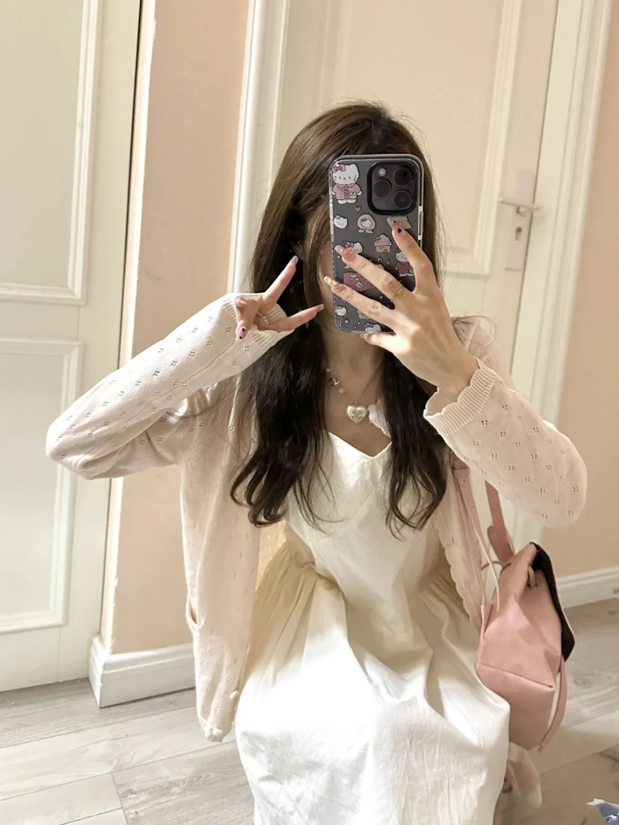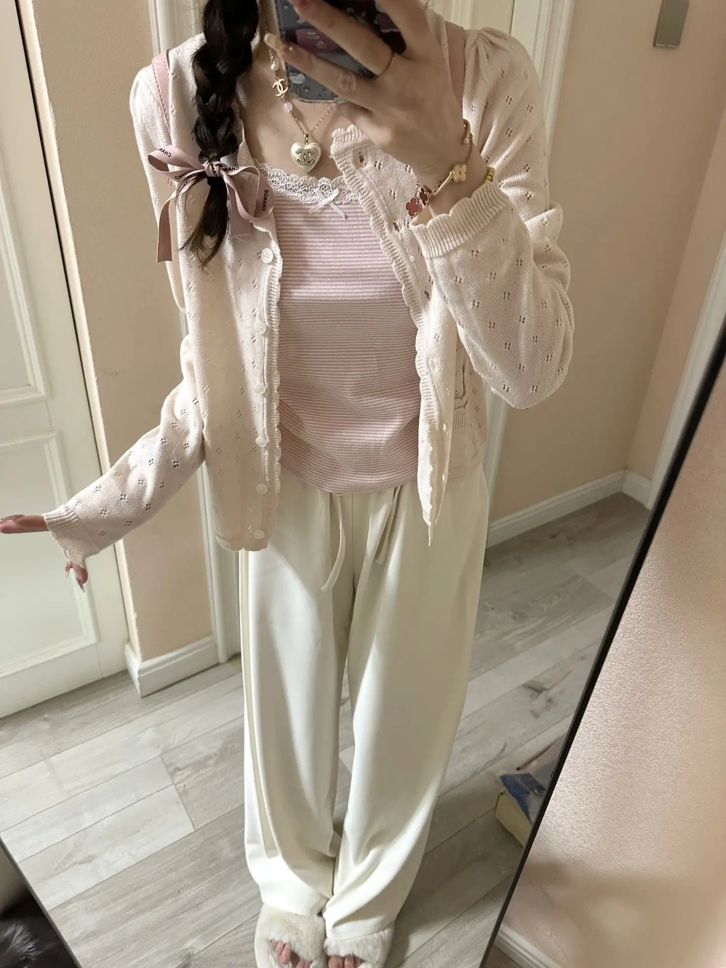 This sweet and soft cardigan sweater features a college-style design with a hollow-out short coat style, perfect for spring and autumn.