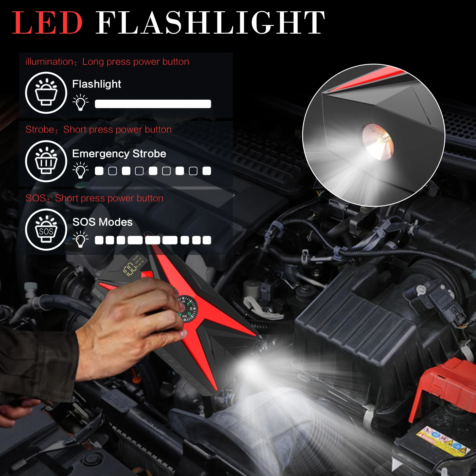 | Matec jump starter function | Compass, led light, charging power supply, car jump starter, etc |