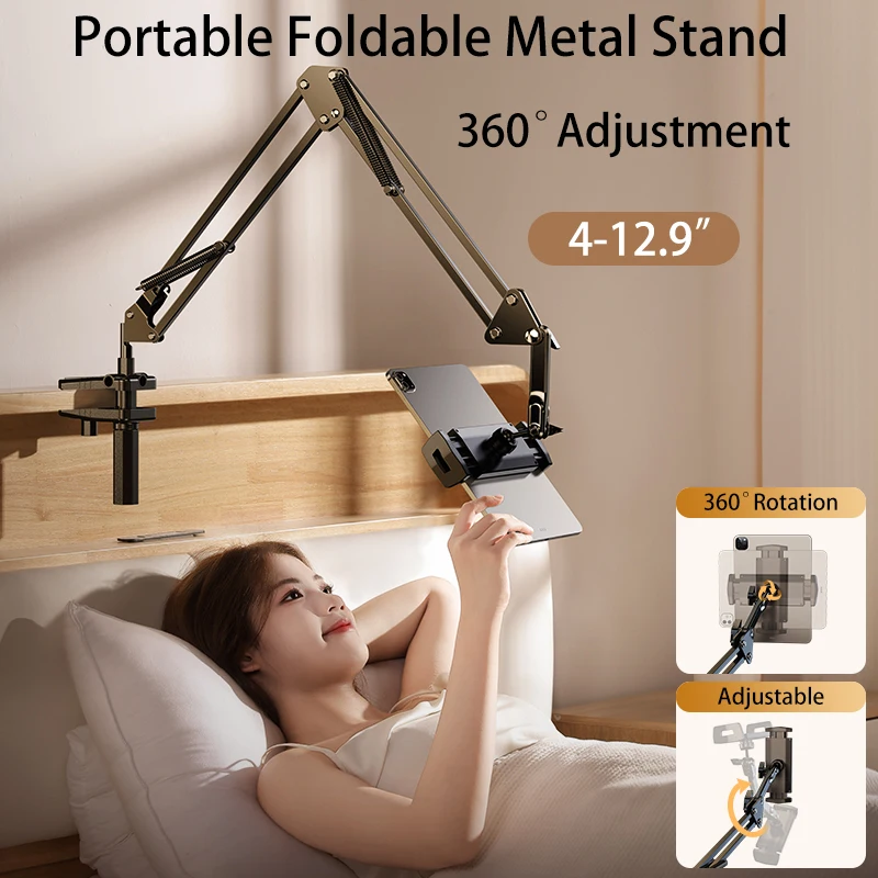 Tablet Stand Rotatable Phone Stand Long Arm Metal 180° Adjustable Holder For iPad Pro Mini Air Xiaomi Tablet Compatible 4-12.9”