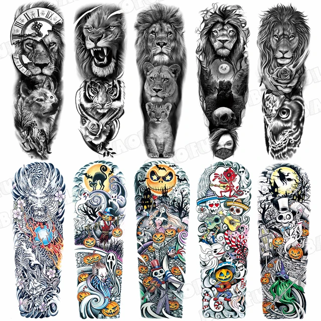 Temporary Tattoo Arm Sleeve For Men Women Realistic Lion Tiger Flower Halloween Ghost Pumpkin Fake Tattoo