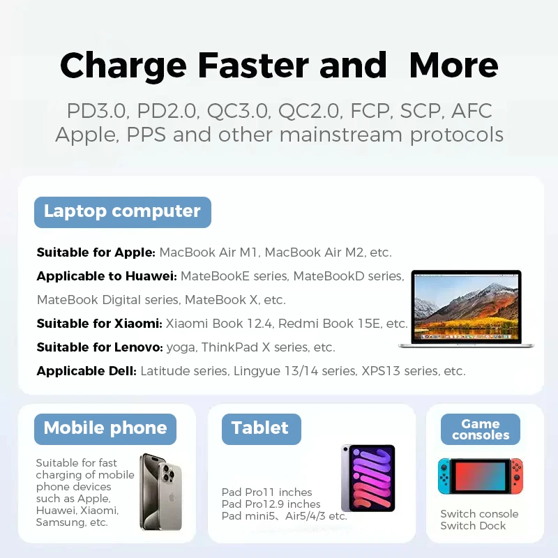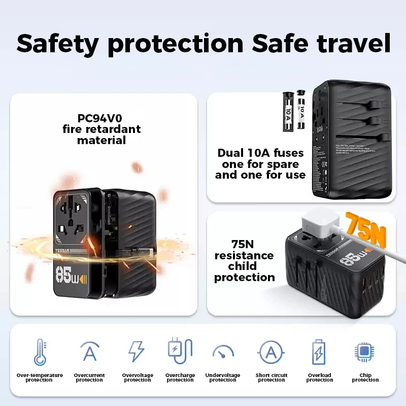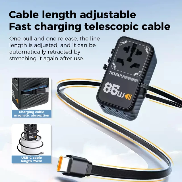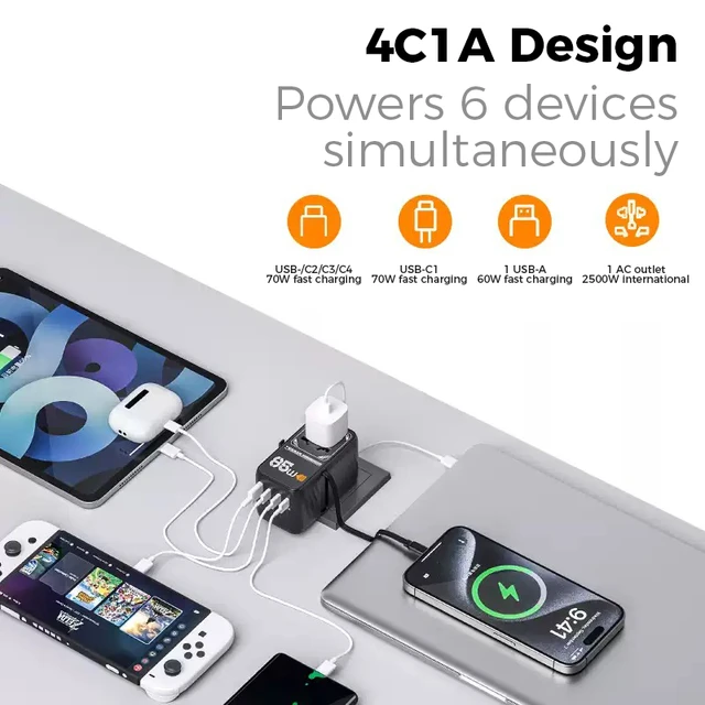 The universal power adapter bulits in 1 USB C cable, the USB C1/C2/C3/C4 provides charging speed up to 70W max (when only using single port), reducing your waiting time; USB A1 is 60W max, 2 types of USB ports meet different charging needs