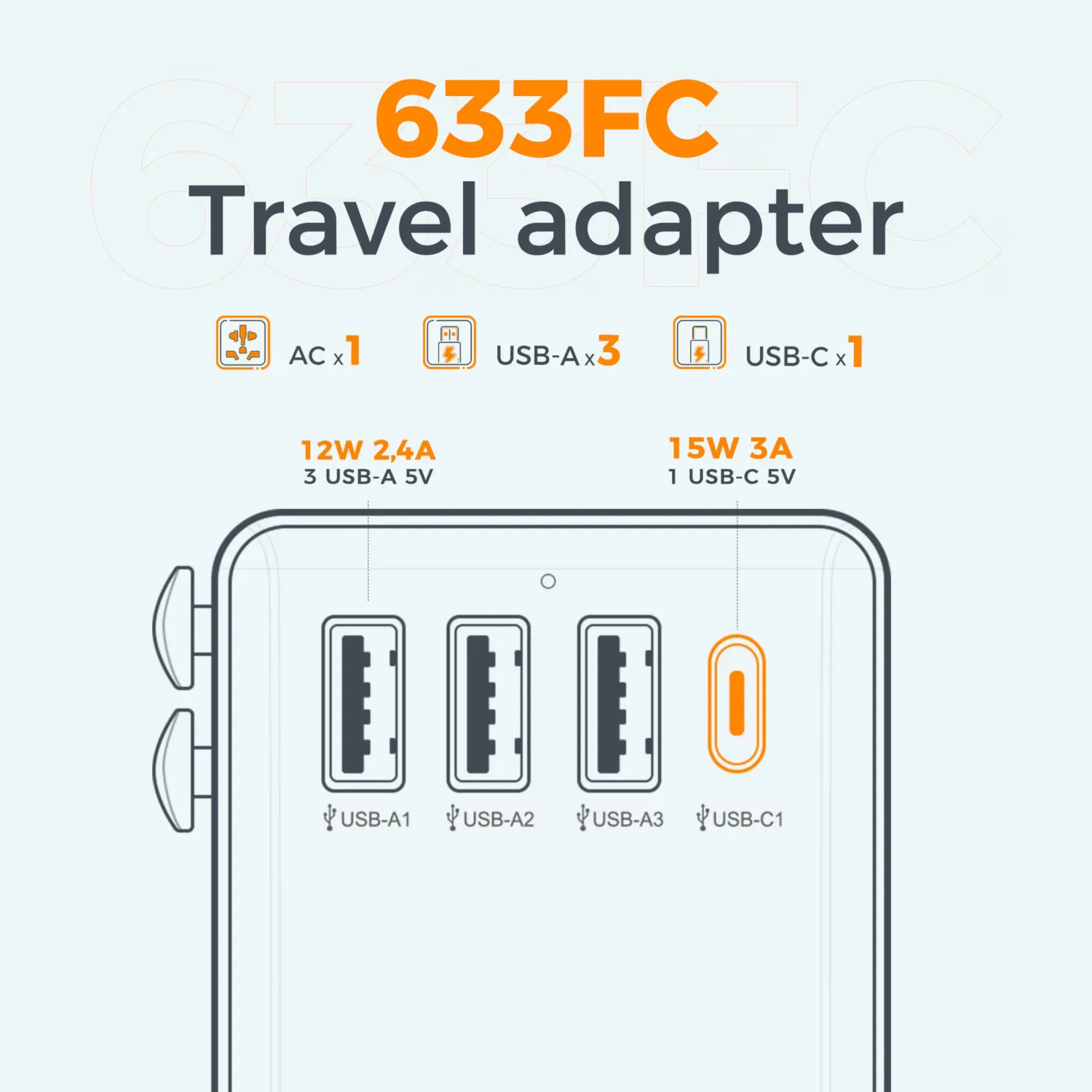 Travel Adapter Worldwide with 3 USB 1 USB C and 1 AC