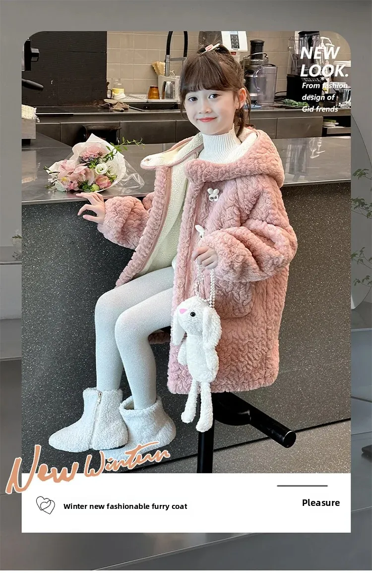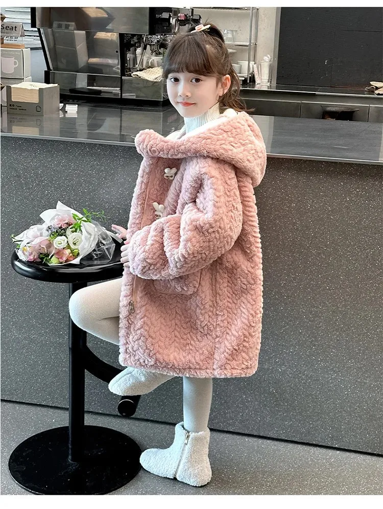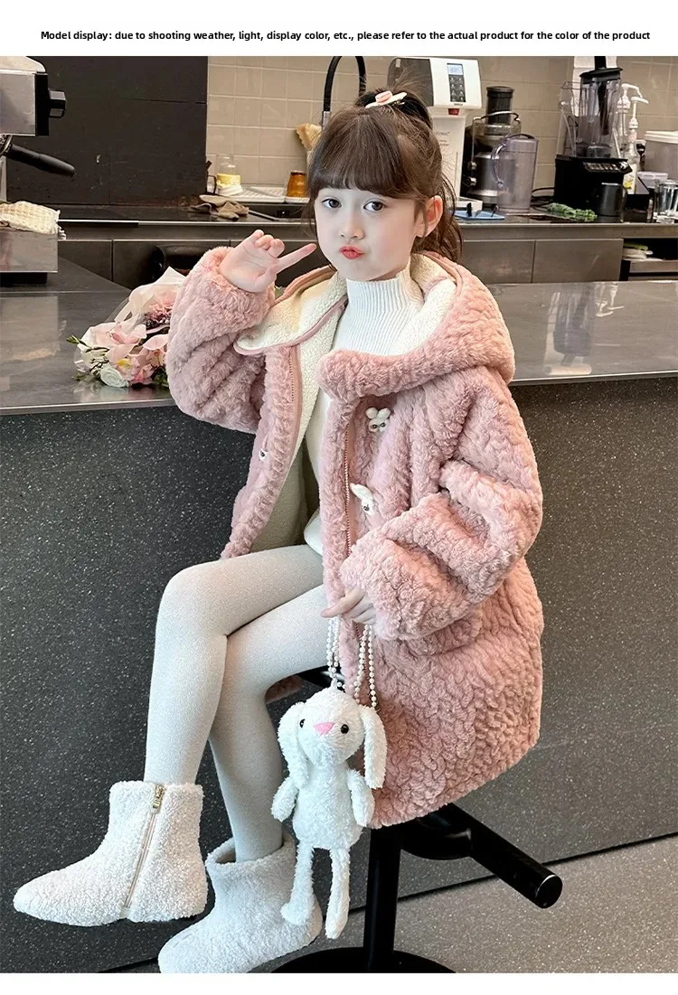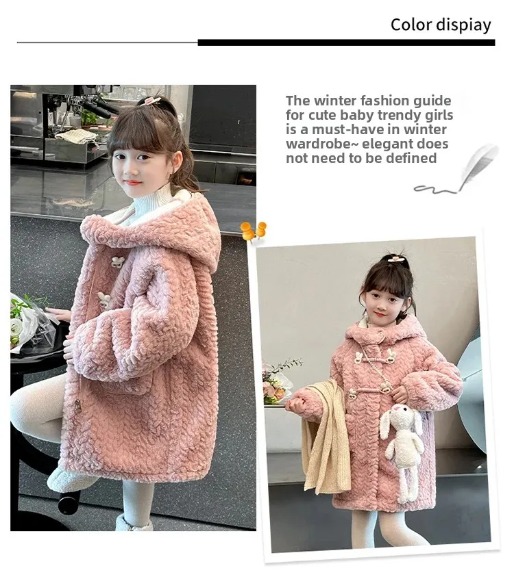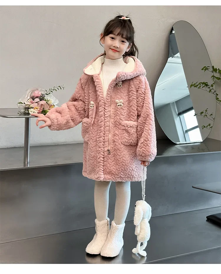Thickened Fleece Cotton Jacket for Girls Mid-Length Hooded Winter Coat Children’s Fashionable Outerwear