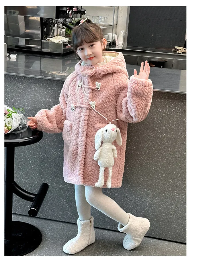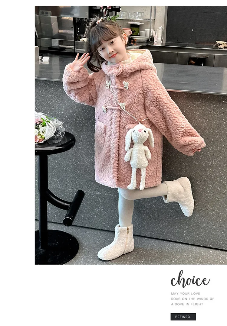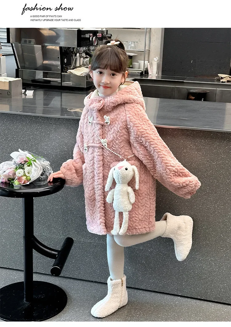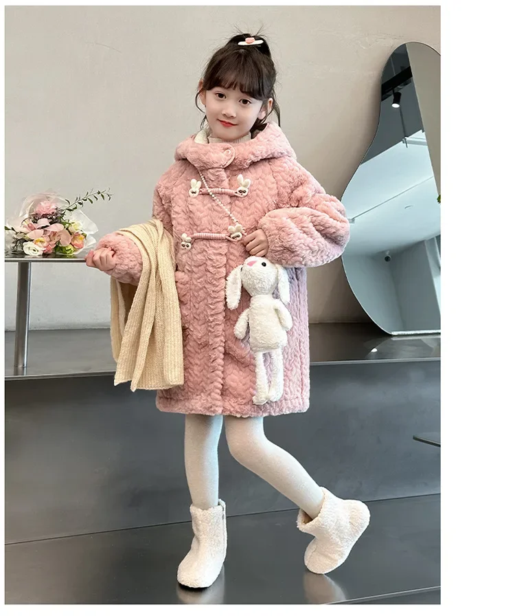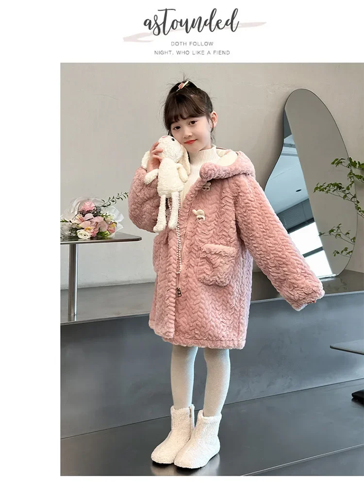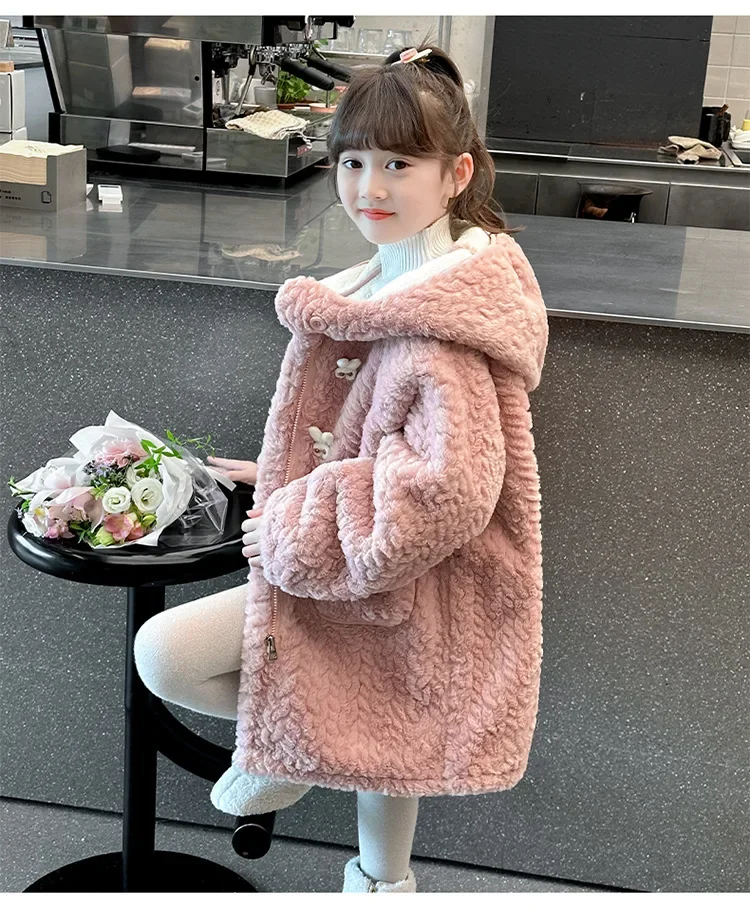 Thickened Fleece Cotton Jacket for Girls Mid-Length Hooded Winter Coat Children’s Fashionable Outerwear