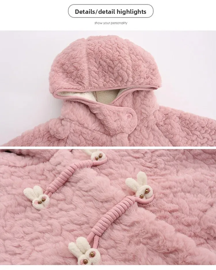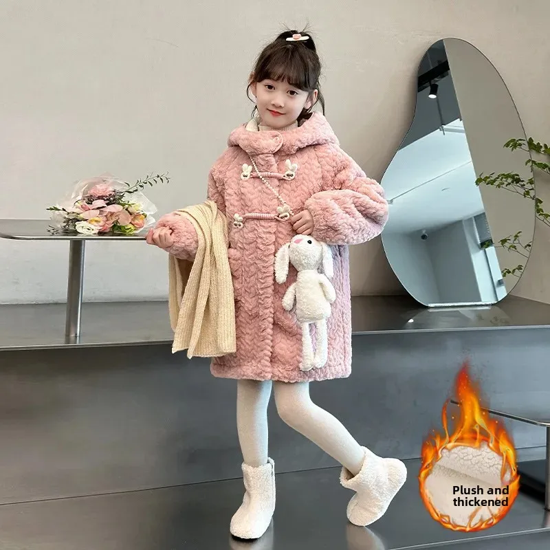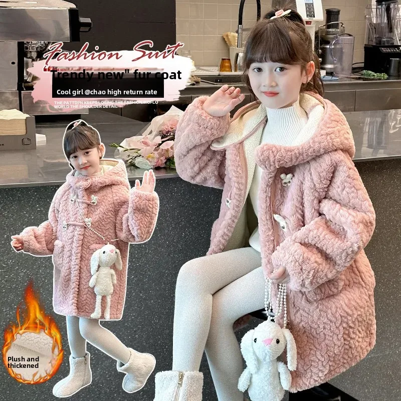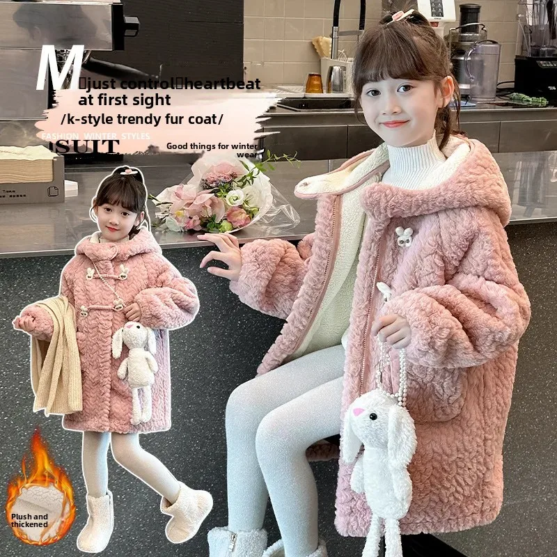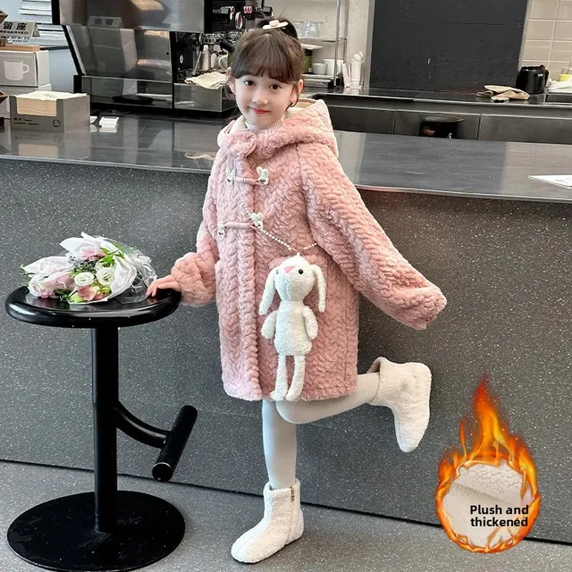 Thickened Fleece Cotton Jacket for Girls Mid-Length Hooded Winter Coat Children’s Fashionable Outerwear
