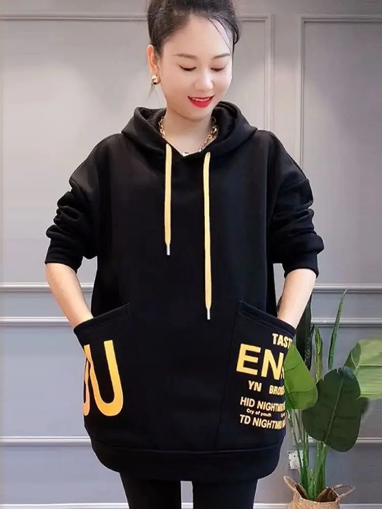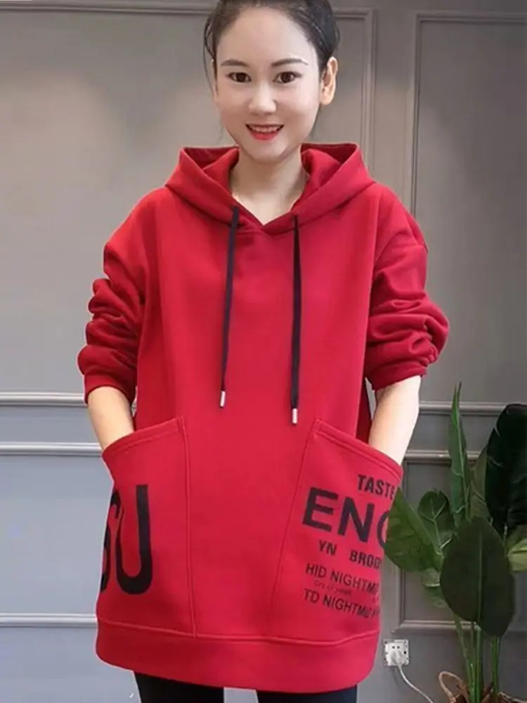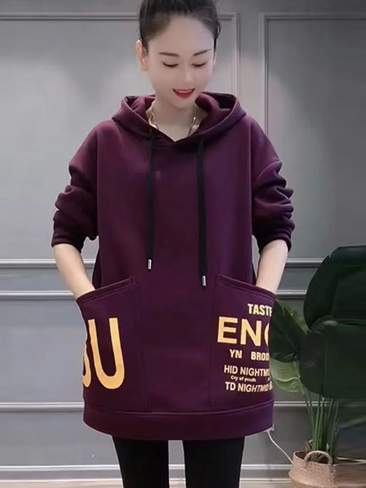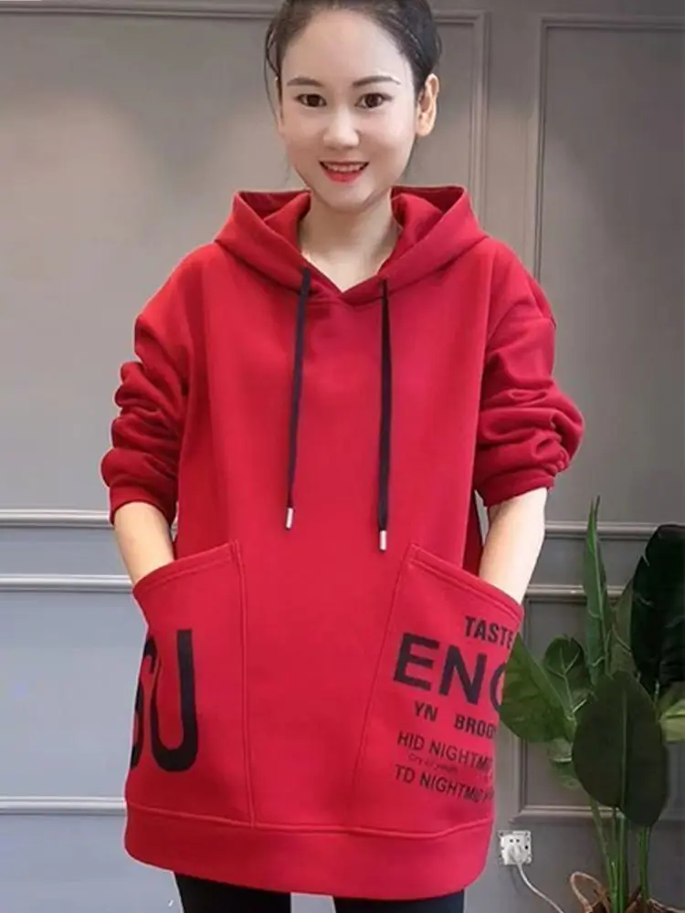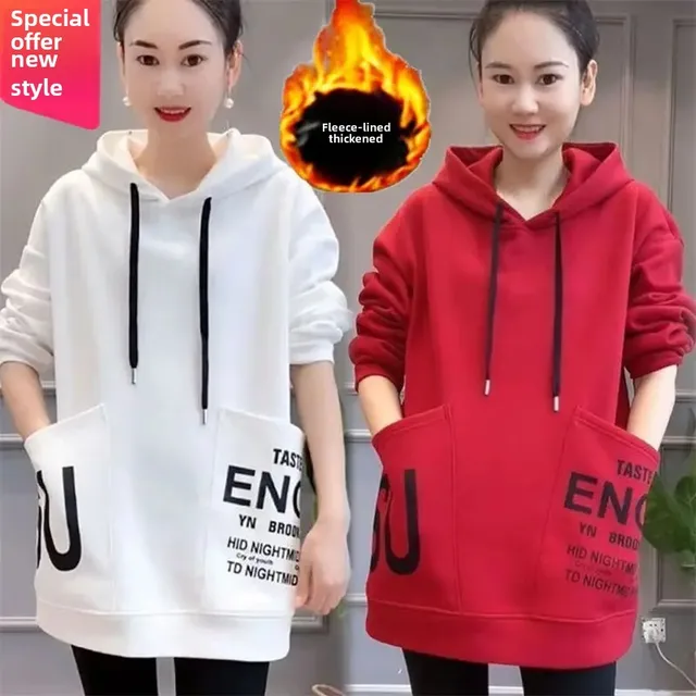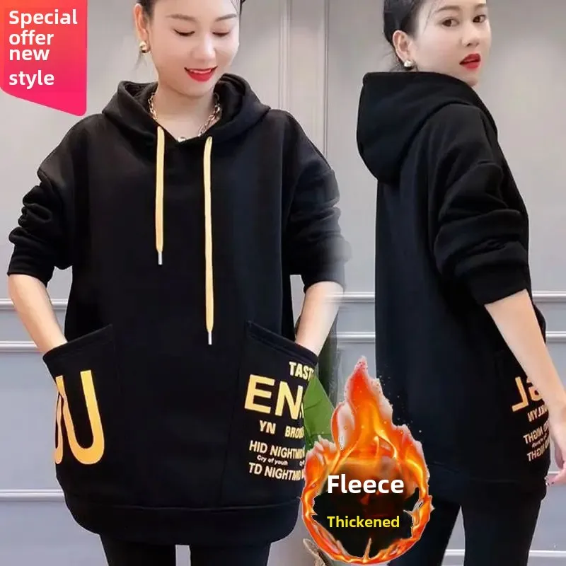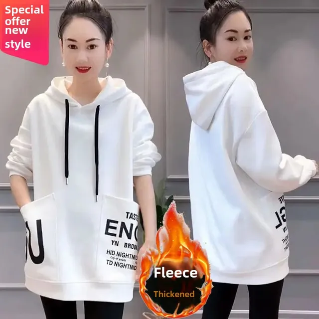 Thickened Fleece-Lined Hooded Medium-Length Base Layer Top Women's Winter Korean-Style Casual Jacket With Large Pocket
