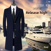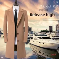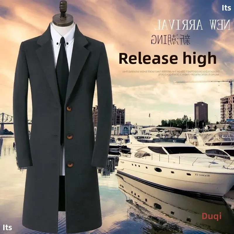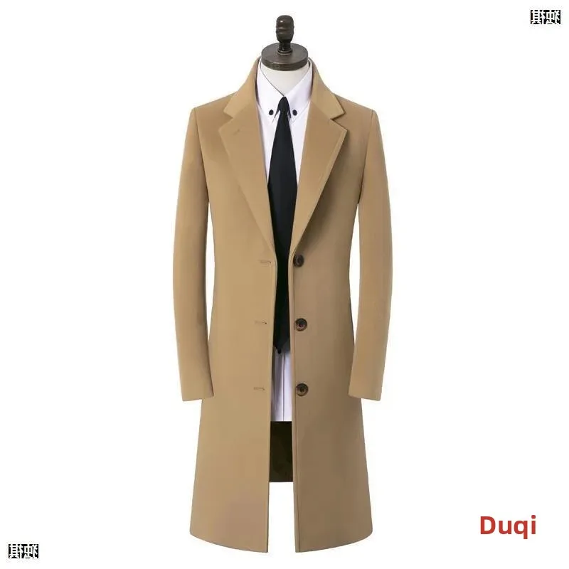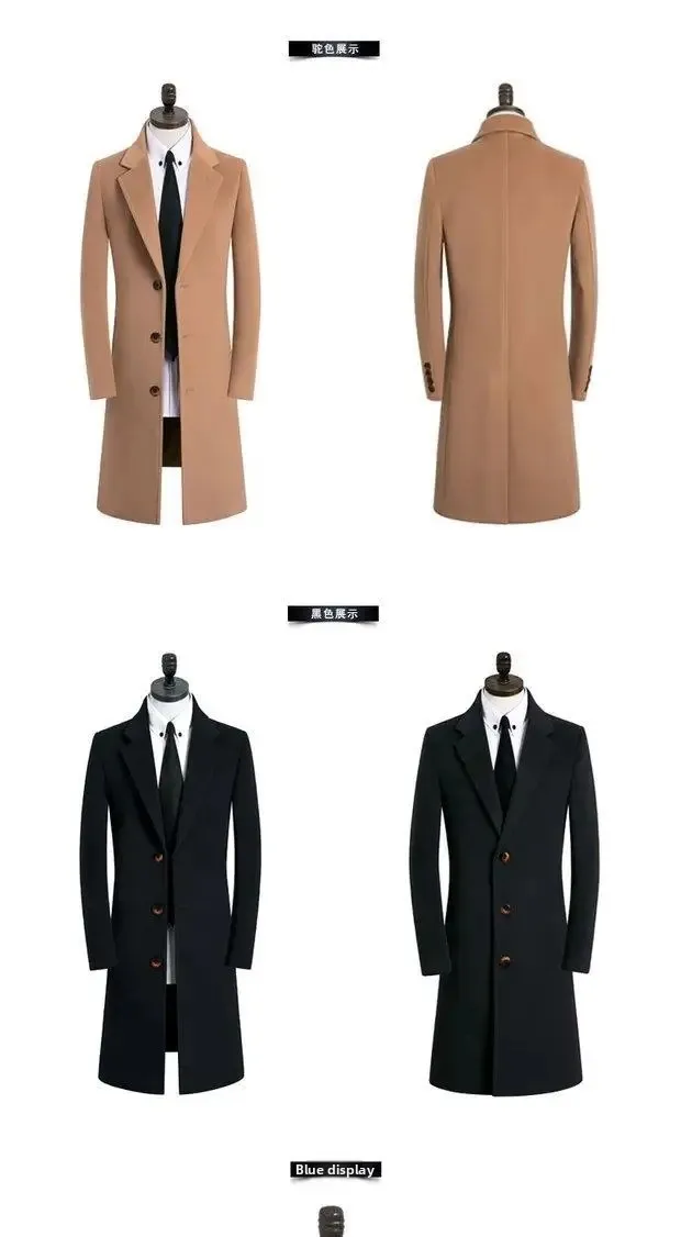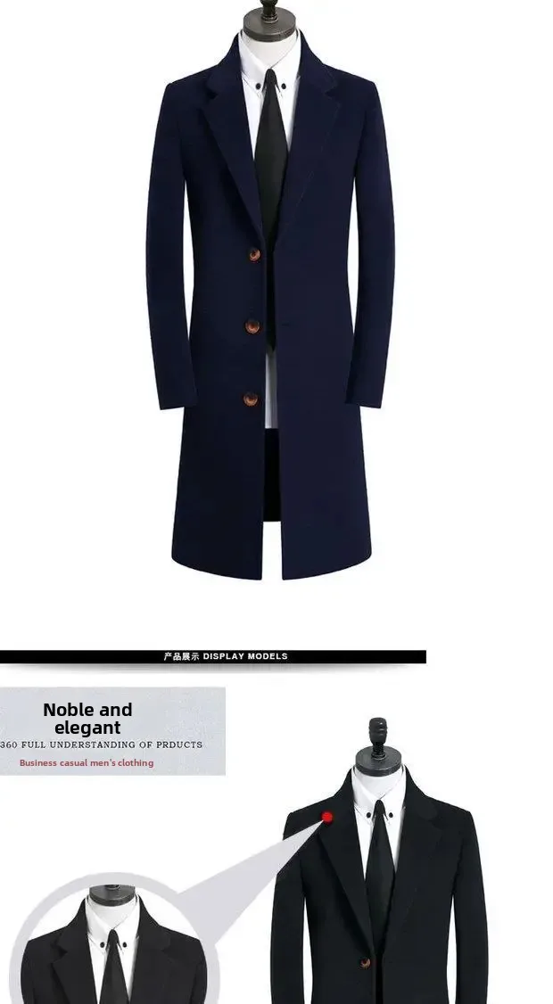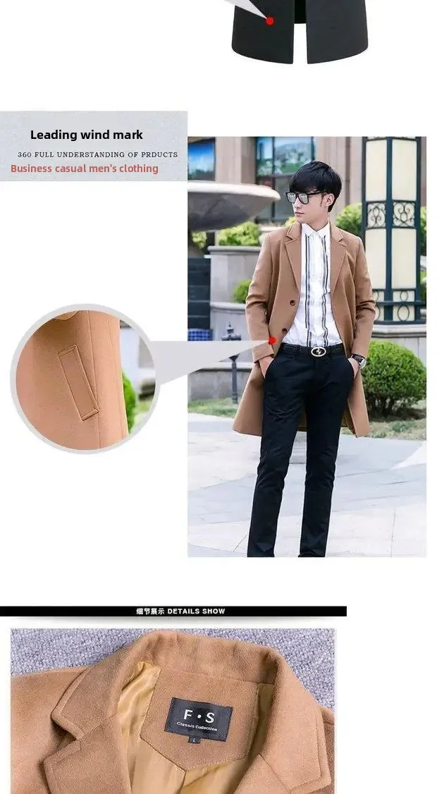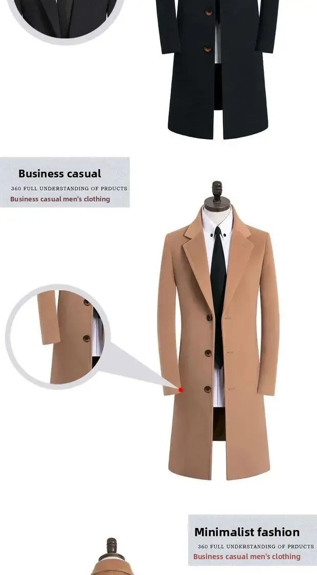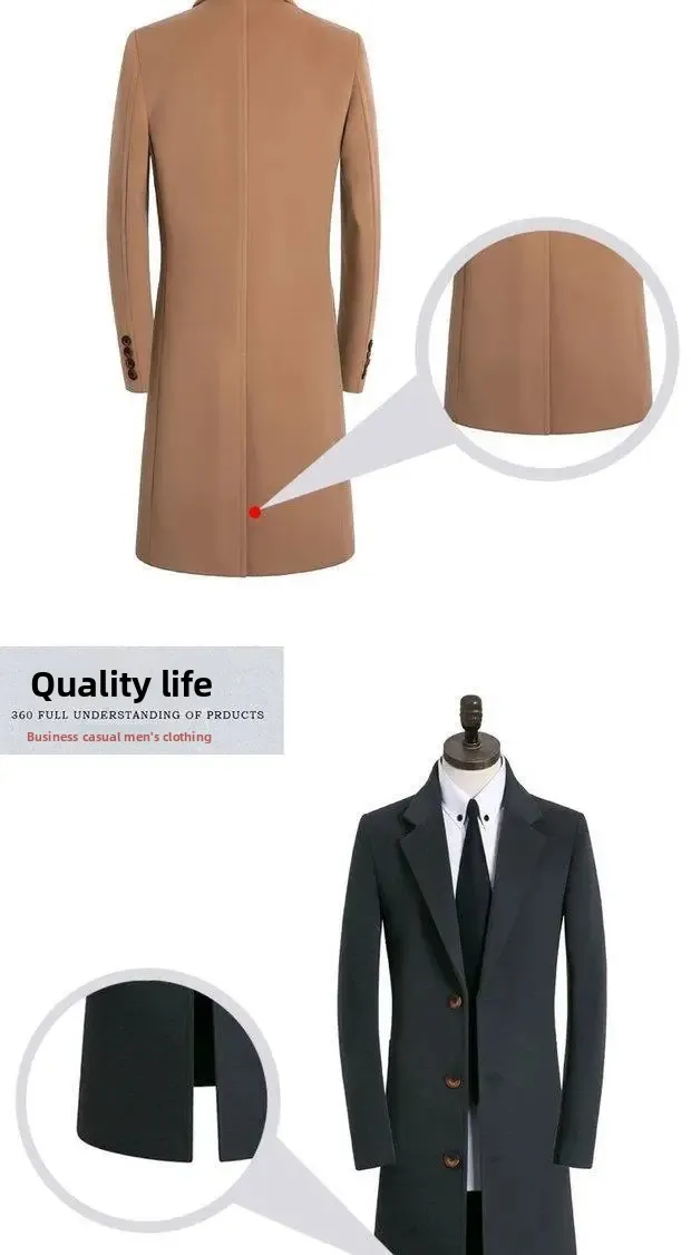 Thickened Woolen Men’s Coat Stylish Slim Fit Long Length Windbreaker Cottonadded Warm Outerwear