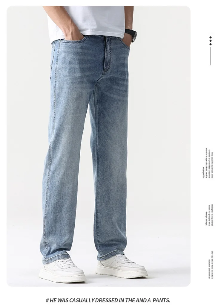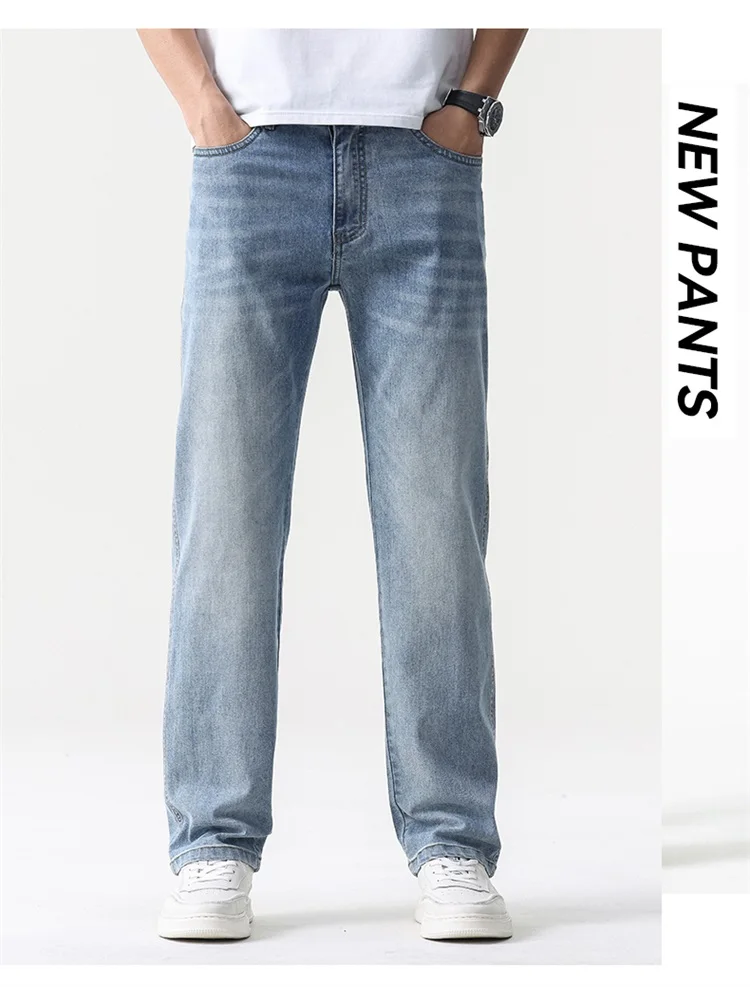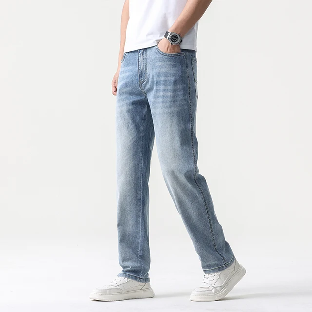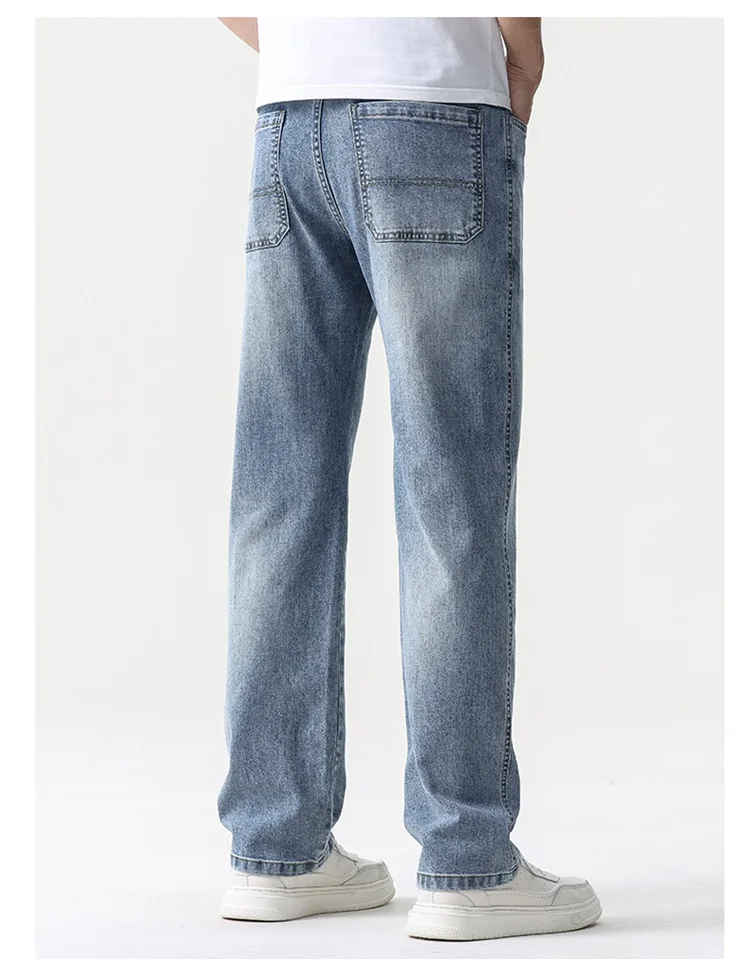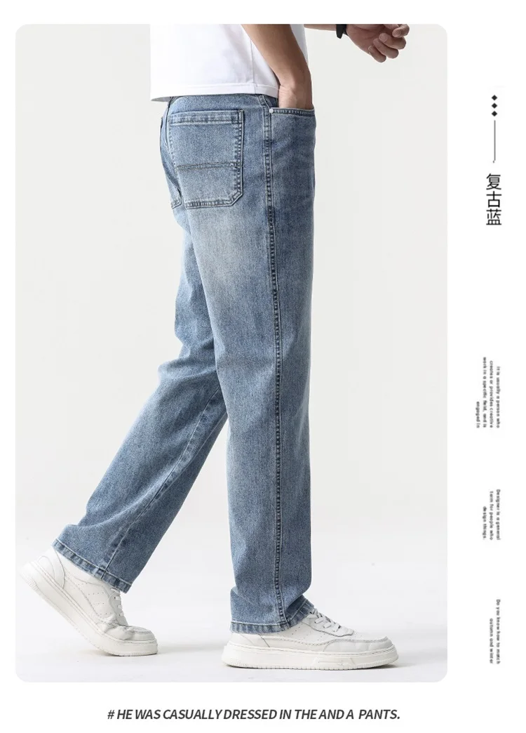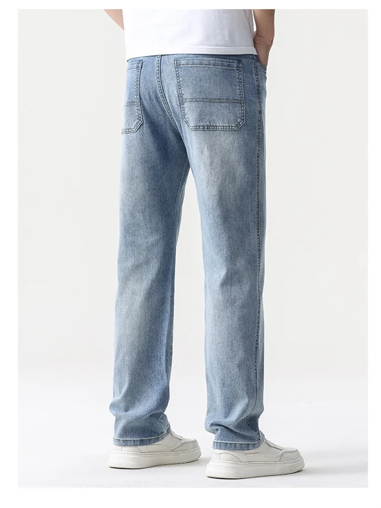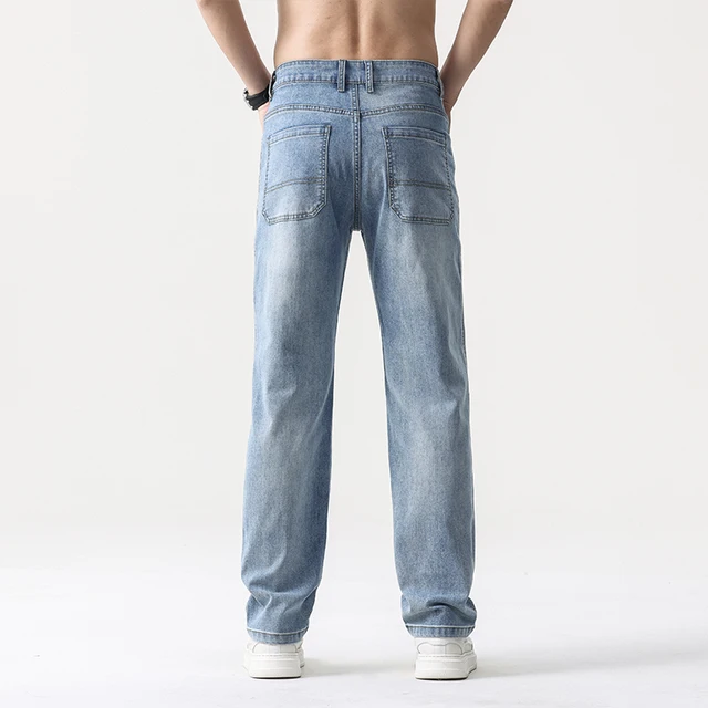thin cool Elastic Men’s Casual regular fit Jeans Loose Straight Wide Leg Pants Washed Denim Trousers