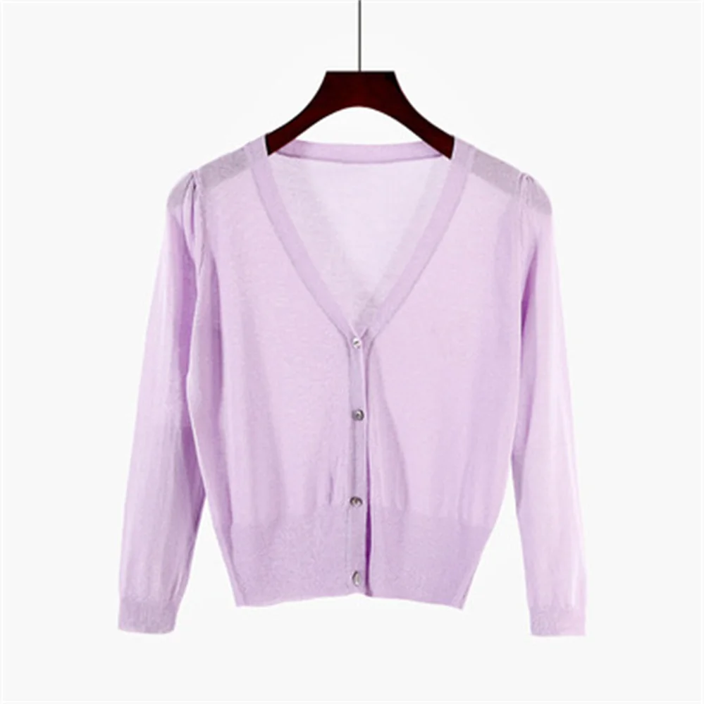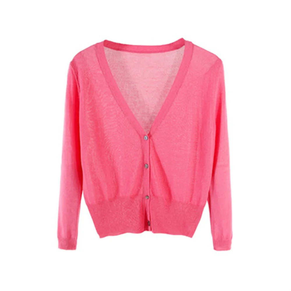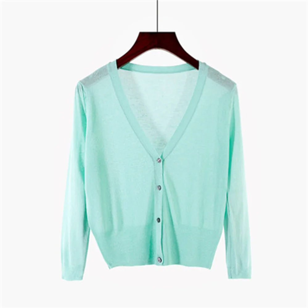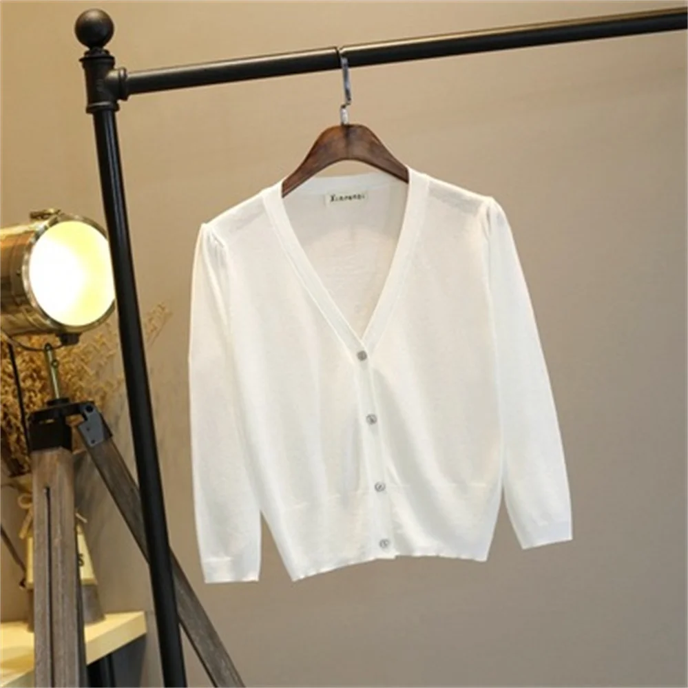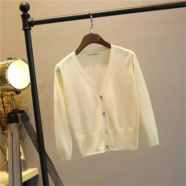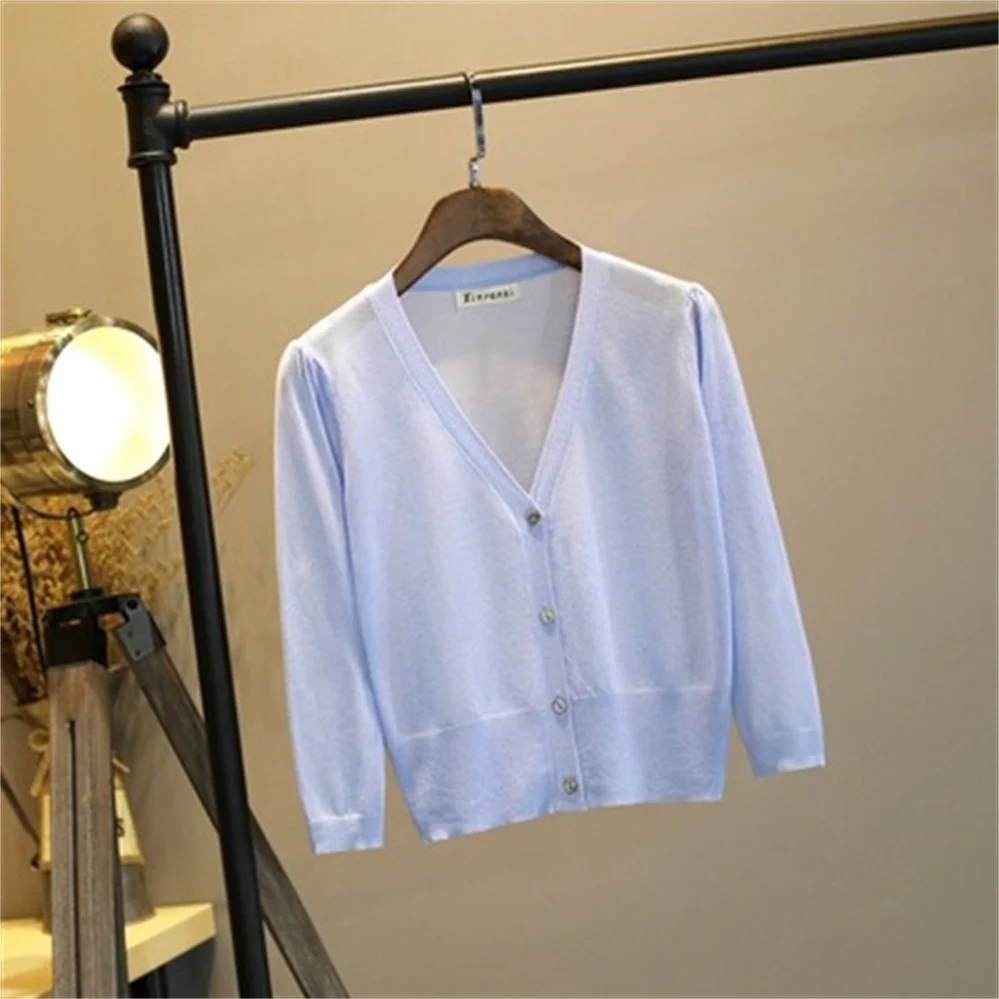 thin Summer candy color knit crop Cardigan women 3/4 Sleeve short knit coat Basic v-neck Jacket outwear Sun protection shirt