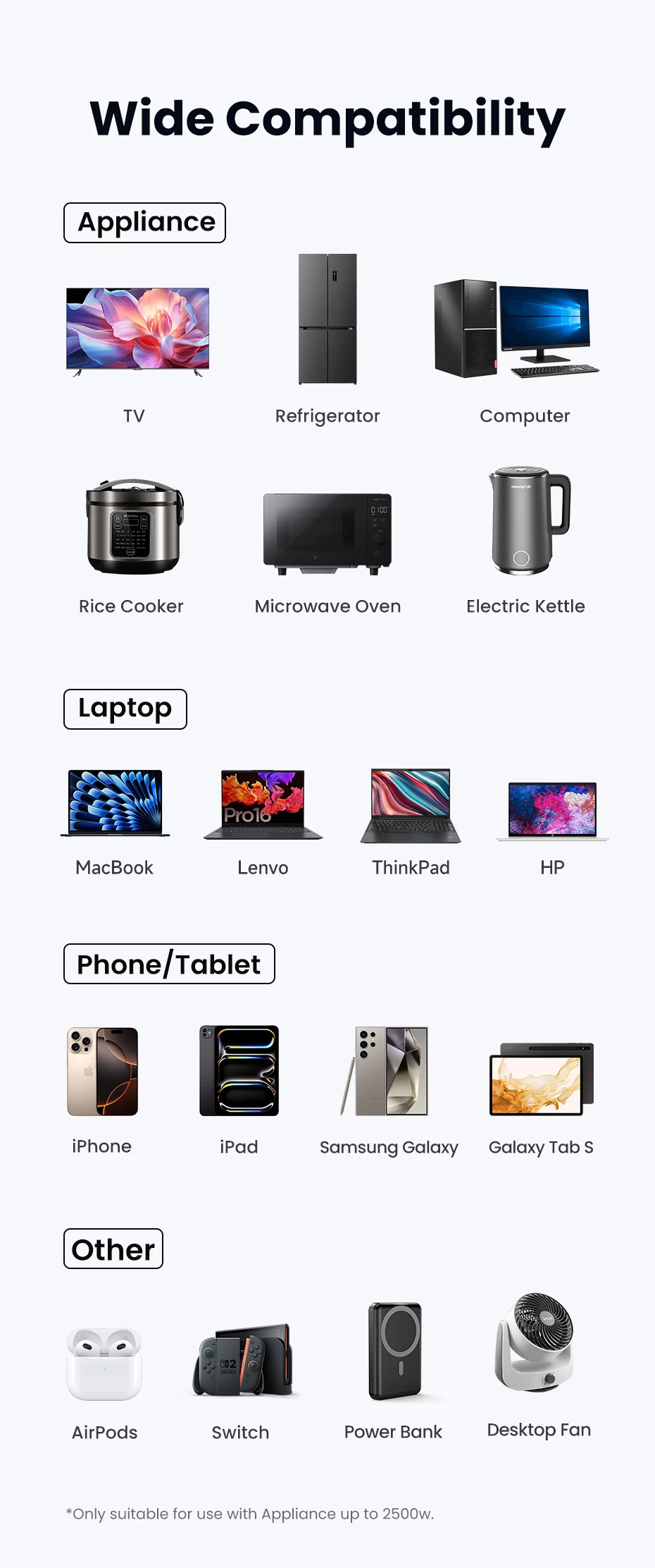 Note:Only suitable for appliances with power not exceeding 2500W.
