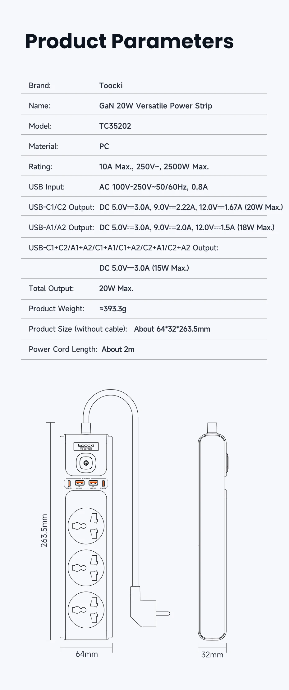 Product Dimensions (excluding power cord): Approximately 64×32×263.5mm