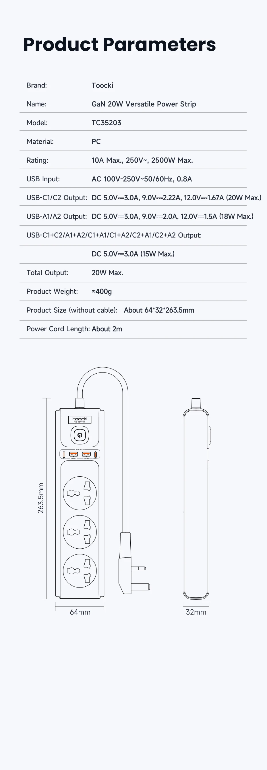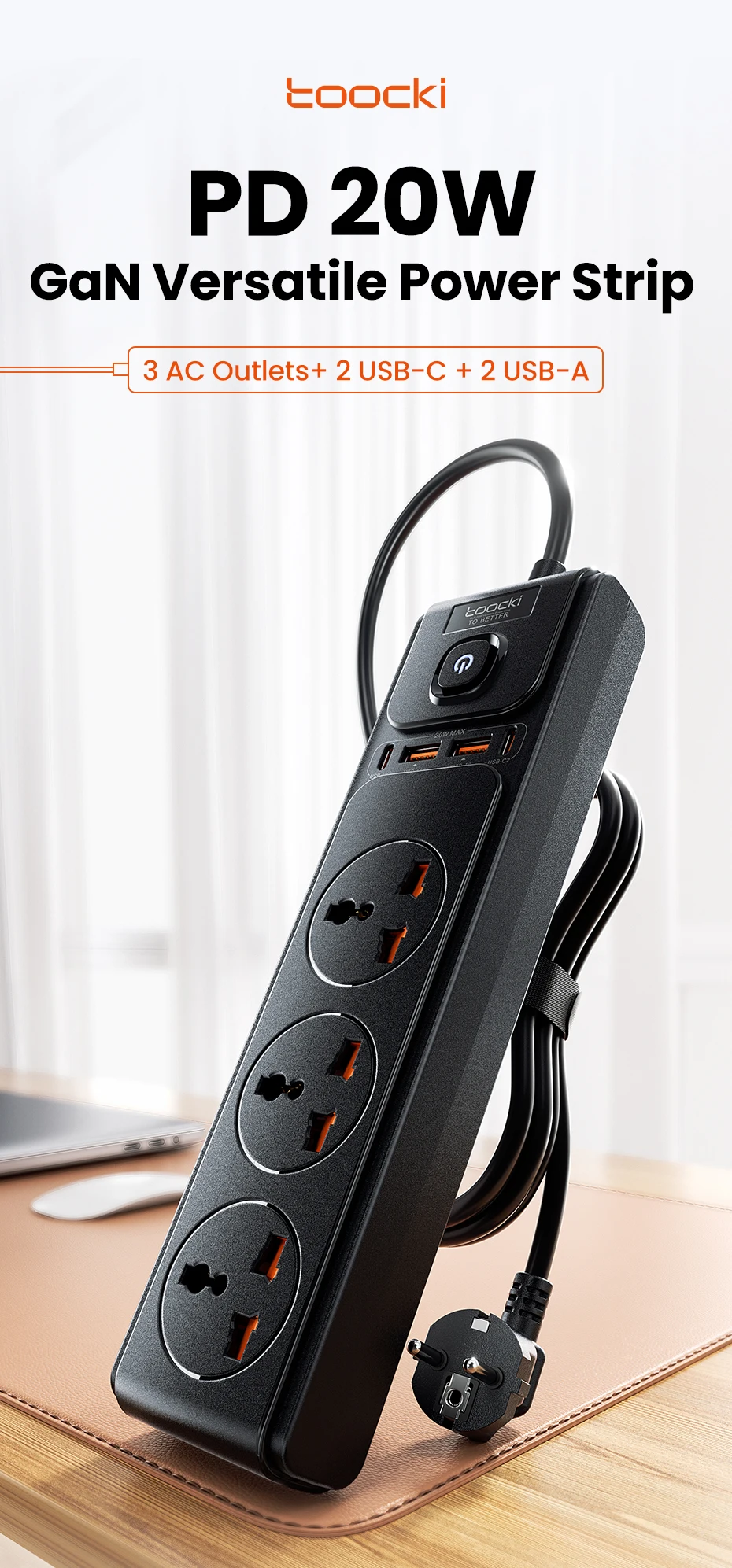 Toocki C35 Power Strip Electric Socket Grounding 2M Extension Cable 3AC Outlet 2 USB-C 2 USB-A PD 20W Fast Charging Charer