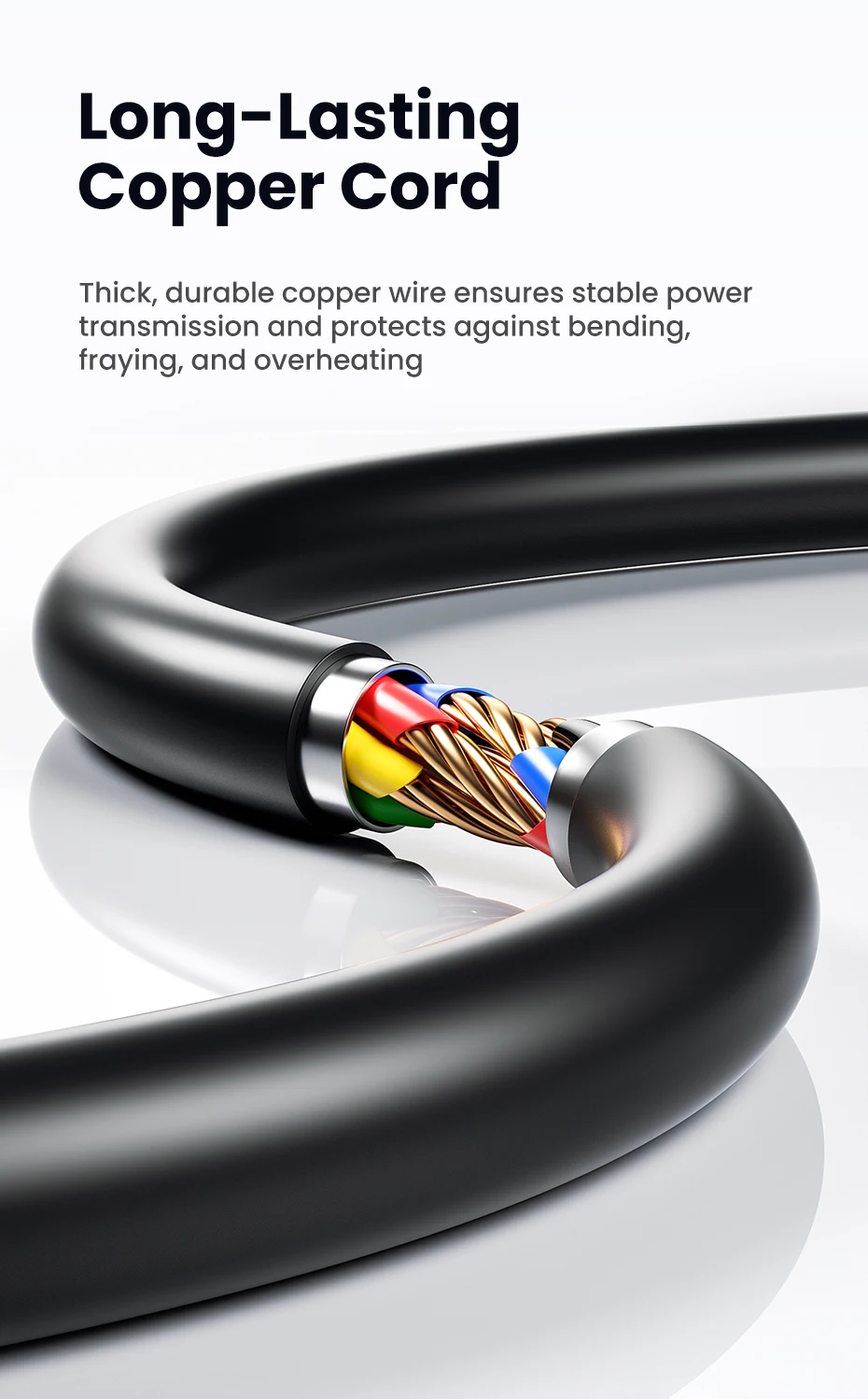 Uses high-quality thickened copper-core power cord, ensuring stable transmission, high conductivity, high temperature resistance, and anti-aging performance.