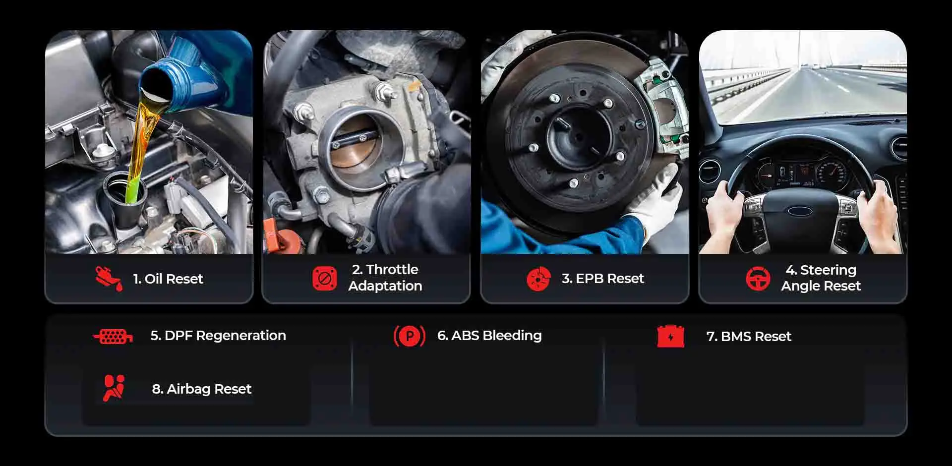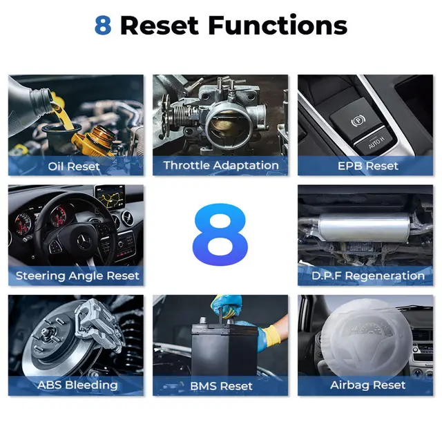 TopScan offers the 8 most commonly used reset functions for your vehicle: Oil Reset, Throttle Adaptation, EPB Reset, Steering Angle Reset, DPF Regeneration, ABS Bleeding, BMS Reset, Airbag Reset.
