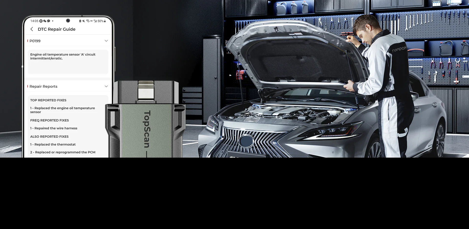 The TopScan offers DTC Repair Guide to walk you through the processes and codes of vehicle diagnostics. After reading the fault codes, the TopScan can display the definition of fault codes and offer guidance in how to repair it.