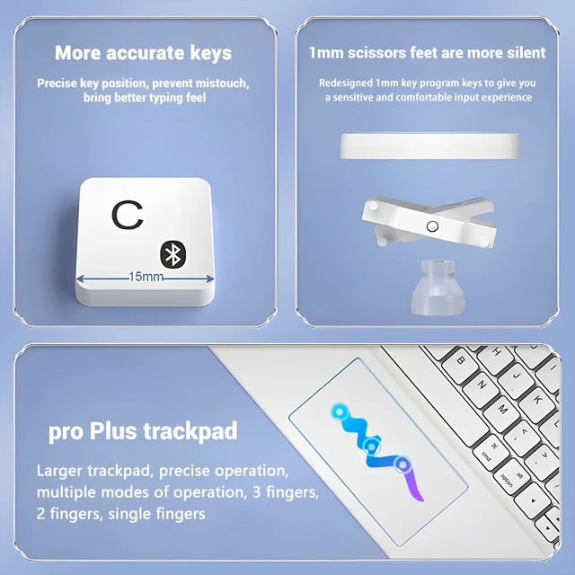 Keyboard with a large trackpad, support Bluetooth wireless, there are a lot of color choices, the use of the keyboard is very quiet, will not affect others, you can work next to the baby will not be disturbed, the large trackpad has a lot of finger instructions can cooperate with you more efficient work, including switching the taskbar, returning to the main interface, scrolling and other gestures, It is very light and almost the size of your tablet, with the EM protective case can be magnetically attracted to the protective case, it is very important to carry out, and there is no need to carry a mouse, which is very suitable for learning, carrying out office, giving family and friends as a gift, they will certainly like it