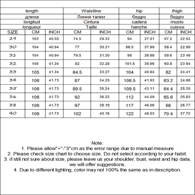 | size_info | {"sizeInfoList":[{"length":{"cm":"103","inch":"40.55"},"size":"29","vid":-1},{"length":{"cm":"104","inch":"40.94"},"size":"30","vid":-2},{"length":{"cm":"104","inch":"40.94"},"size":"31","vid":-3},{"length":{"cm":"105","inch":"41.34"},"size":"32","vid":-4},{"length":{"cm":"105","inch":"41.34"},"size":"33","vid":-5},{"length":{"cm":"106","inch":"41.73"},"size":"34","vid":-6},{"length":{"cm":"106","inch":"41.73"},"size":"35","vid":-7},{"length":{"cm":"106","inch":"41.73"},"size":"36","vid":-8},{"length":{"cm":"106","inch":"41.73"},"size":"38","vid":-9},{"length":{"cm":"106","inch":"41.73"},"size":"40","vid":-10}]} |