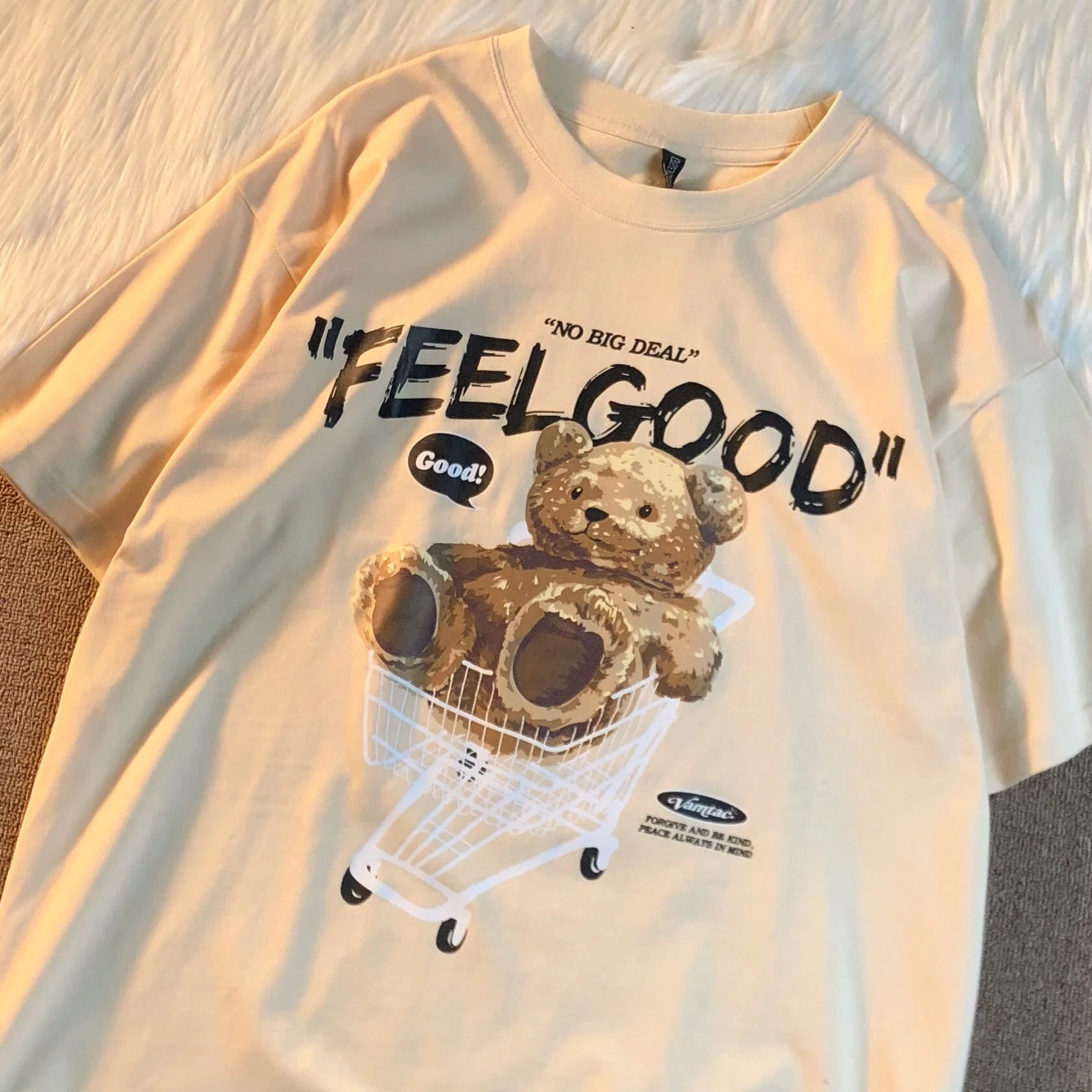 Trendy Bear Print ort Sve Loose Fit Women's T-irt Summer Vintage High Street Hip Hop Student f Sve Top INS Sle