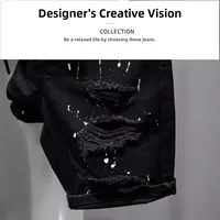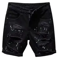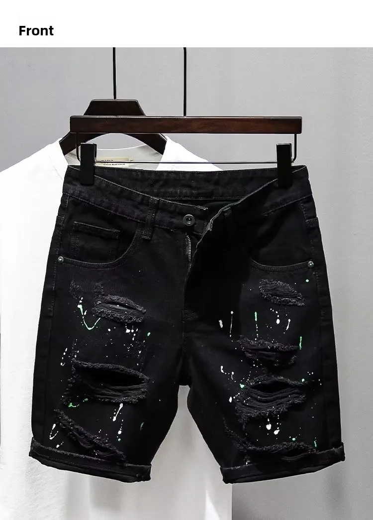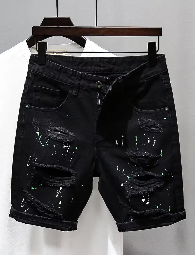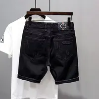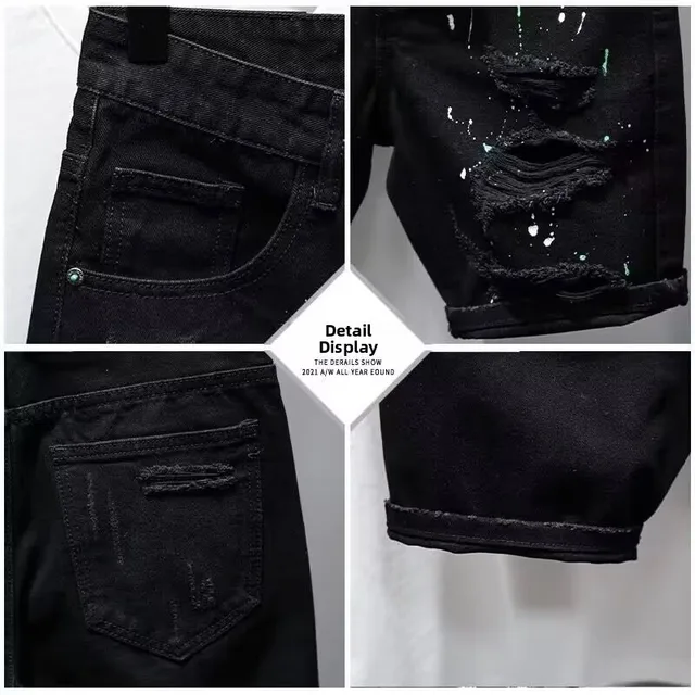 Trendy Men's Distressed Five-Quarter Black Jeans Shorts Summer Versatile Slim Fit Cool Style Korean Version Cotton Denim