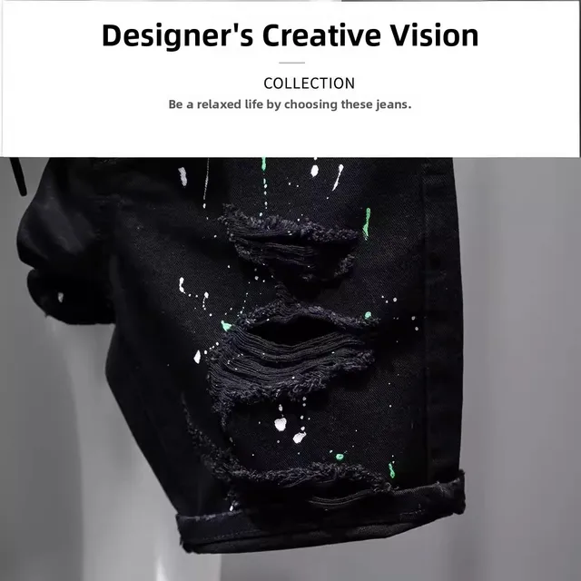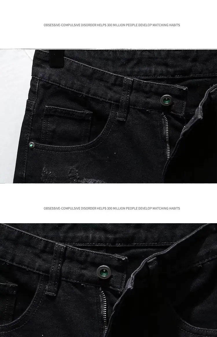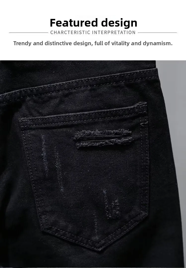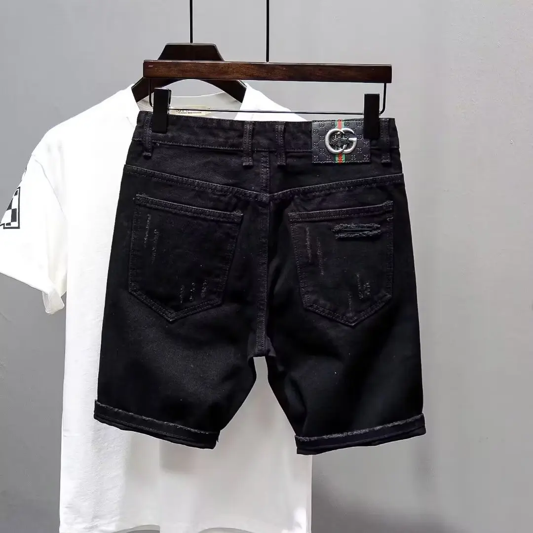 Trendy Men’s Distressed Five-Quarter Black Jeans Shorts Summer Versatile Slim Fit Cool Style Korean
